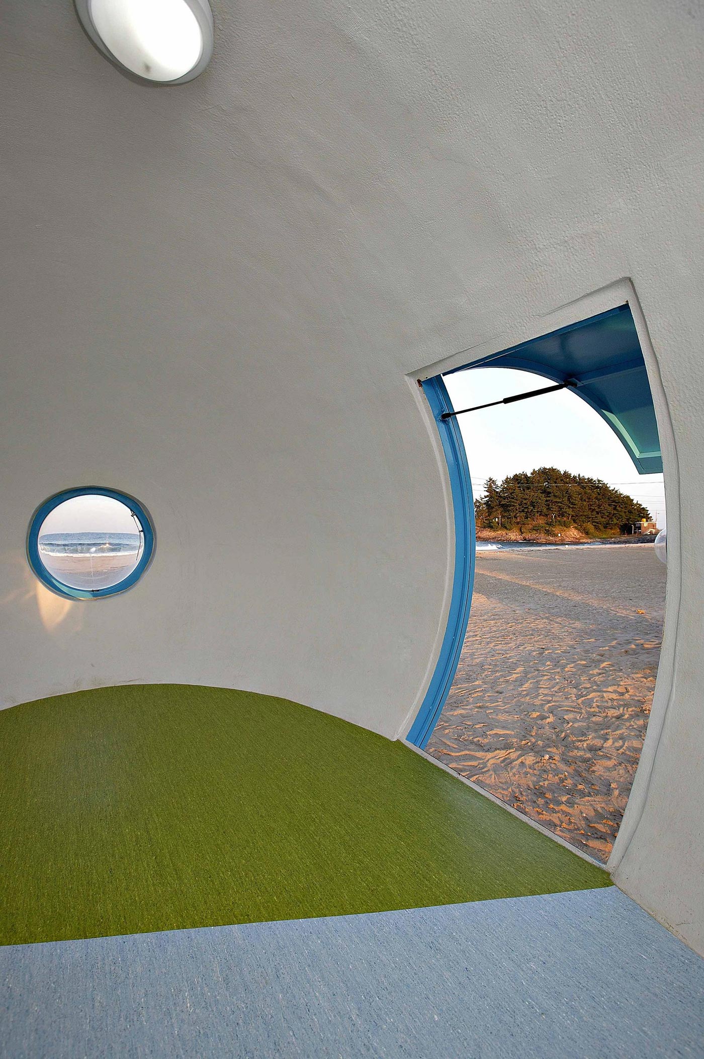 Called “Albang,” these egg-shaped cabins were created by Yoon Space Design and now line a beachfront in South Korea. The eight mobile pods are handmade from common polystyrene plastic so that they are lightweight and portable. The designers intend for the pods to travel from beach to beach, docking on weighted stands to that they will not blow away in the wind. Each mobile dwelling has a white shell and a brightly colored door that opens up and out with a metal hinge. The futuristic design has two round windows that seem to glow with mystery after dark. In the spirit of camping, the interior is spartan, decorated with only green and blue linoleum floors, so that campers can easily reimagine the small space for themselves.