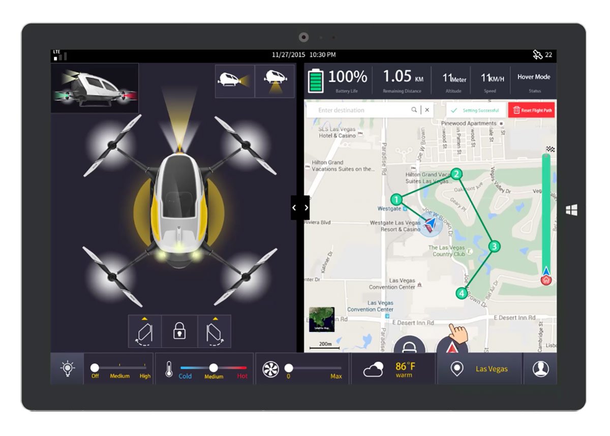 Founded in 2014 in Guangzhou, China by bright minds coming from MIT, Tsinghua University, Duke University, and UCLA, it’s no wonder that EHang has become the fastest growing company in the drone sector. Innovation stands at the core of the company’s ethos, with the team of engineers revolutionizing the classic RC control and constantly looking for new ways to improve the hardware and software of their products. With branches opened in Shanghai, Beijing, and San Francisco, EHang prepares to take the industry by storm; you only have to look at their latest drone model EHANG184 to see that the company is already making history. Designed as an Autonomous Aerial Vehicle (AAV), this one-passenger and completely electric drone has a reliable fail-safe system for peace of mind and eight rotors that produce 142 horsepower – enough to reach 62 miles per hour and to transport a passenger weighing up to 220 lbs. The aerodynamic cabin features graceful curves, while the large windshield ensures an unobstructed viewing experience, allowing the user to admire the urban or natural landscape below. Convenience is placed at the forefront of the design and EHANG184 offers an efficient and certainly stylish way to travel on medium and short distances – 23 minutes on one charge. A sleek and elegant interior with an ergonomic seat provides plenty of comfort, while a 12-inch display reveals one of the most impressive aspects of the entire concept. Passengers can simply use the innovative EHang app to choose their destination by touching the screen, then they can simply relax and enjoy the ride. The 184 model has already made waves in the industry, winning the Best Drone Award at CES 2015. As the company plans on getting the unit to market within 3-4 months, it’s clear that the future is here.