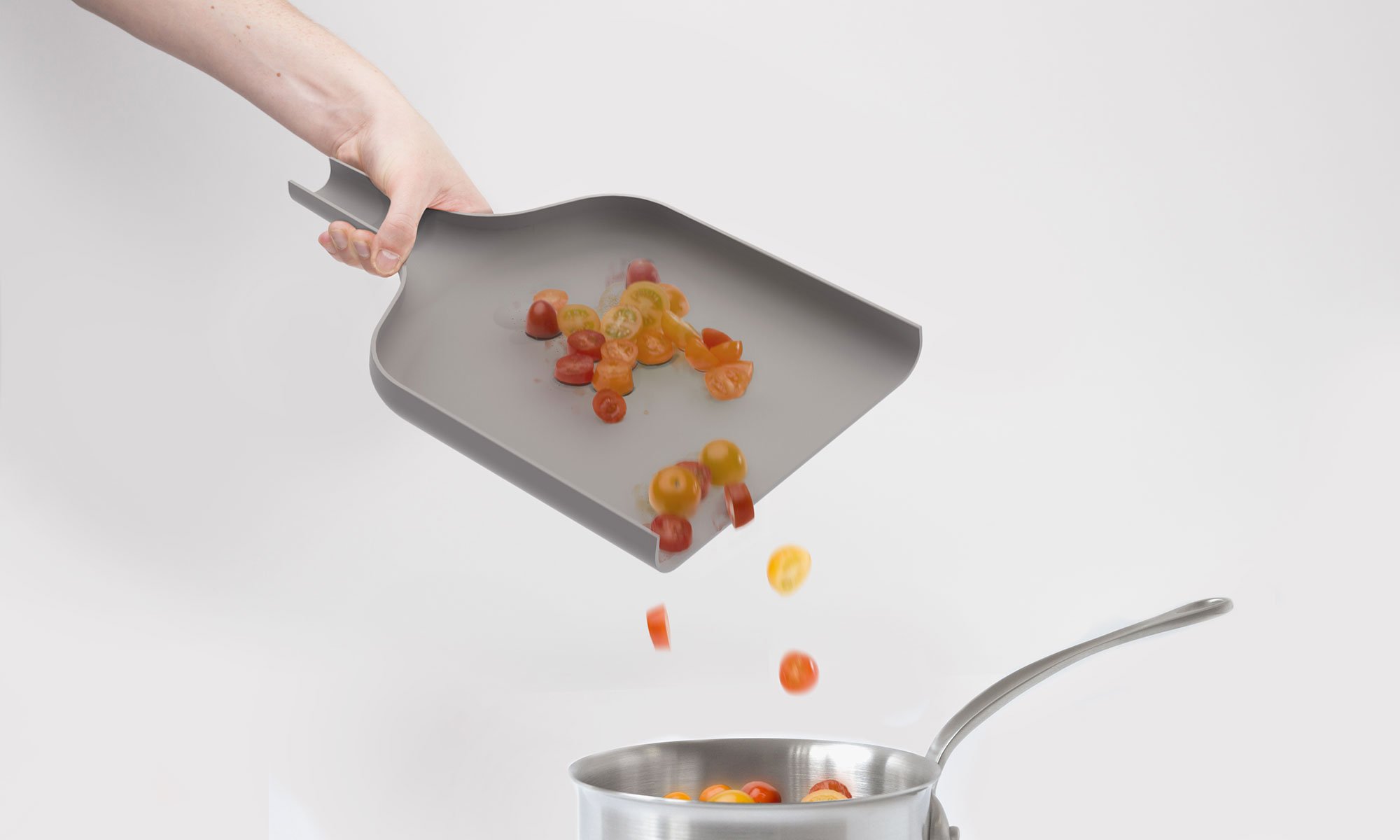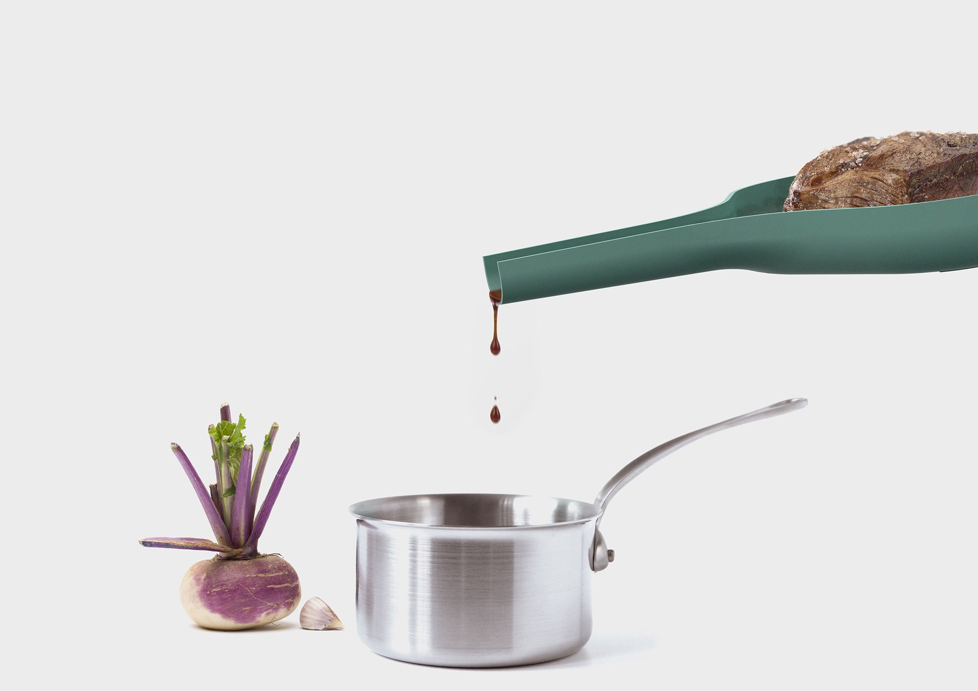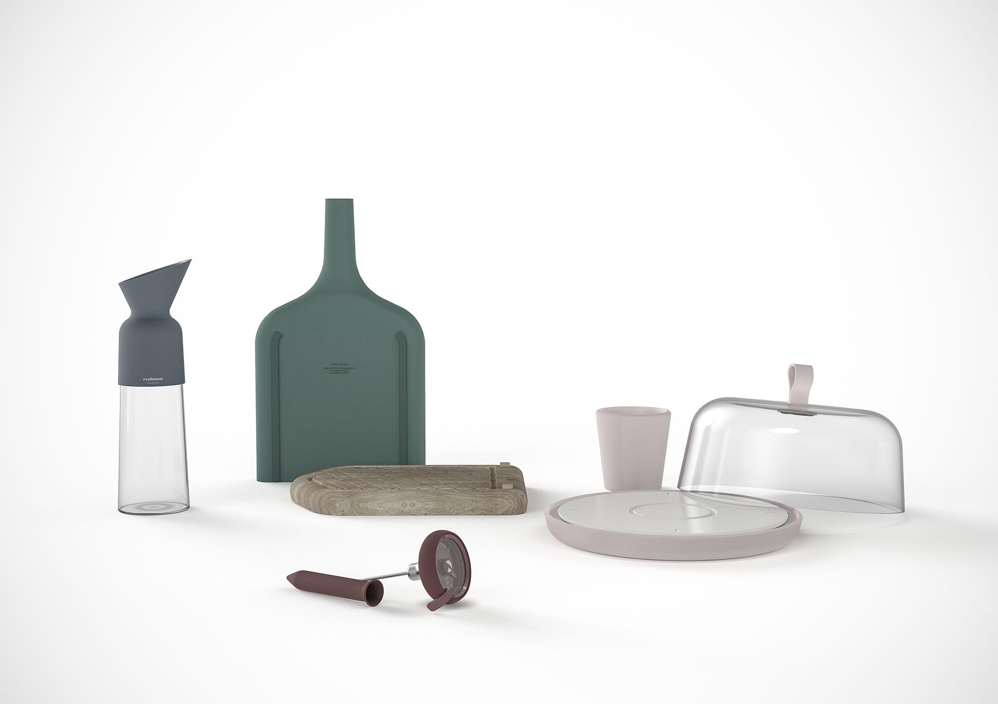 The Evolution Range includes four products, all boasting elegant lines and ingenious features. The cake stand comes with a ceramic plate that has convenient indentations and with a base that also doubles as a sauce or custard bowl. Based on a traditional design, the cooking thermometer refreshes the classic aesthetic with a modern dial and an external adjustable indicator which also stops the thermometer from rolling on a table. The chopping board comes with a sliding section to make separating items or taking ingredients directly to the pan easy. An elegant carafe features contrasting textures and a practical funnel-shape neck which doubles as a handle.