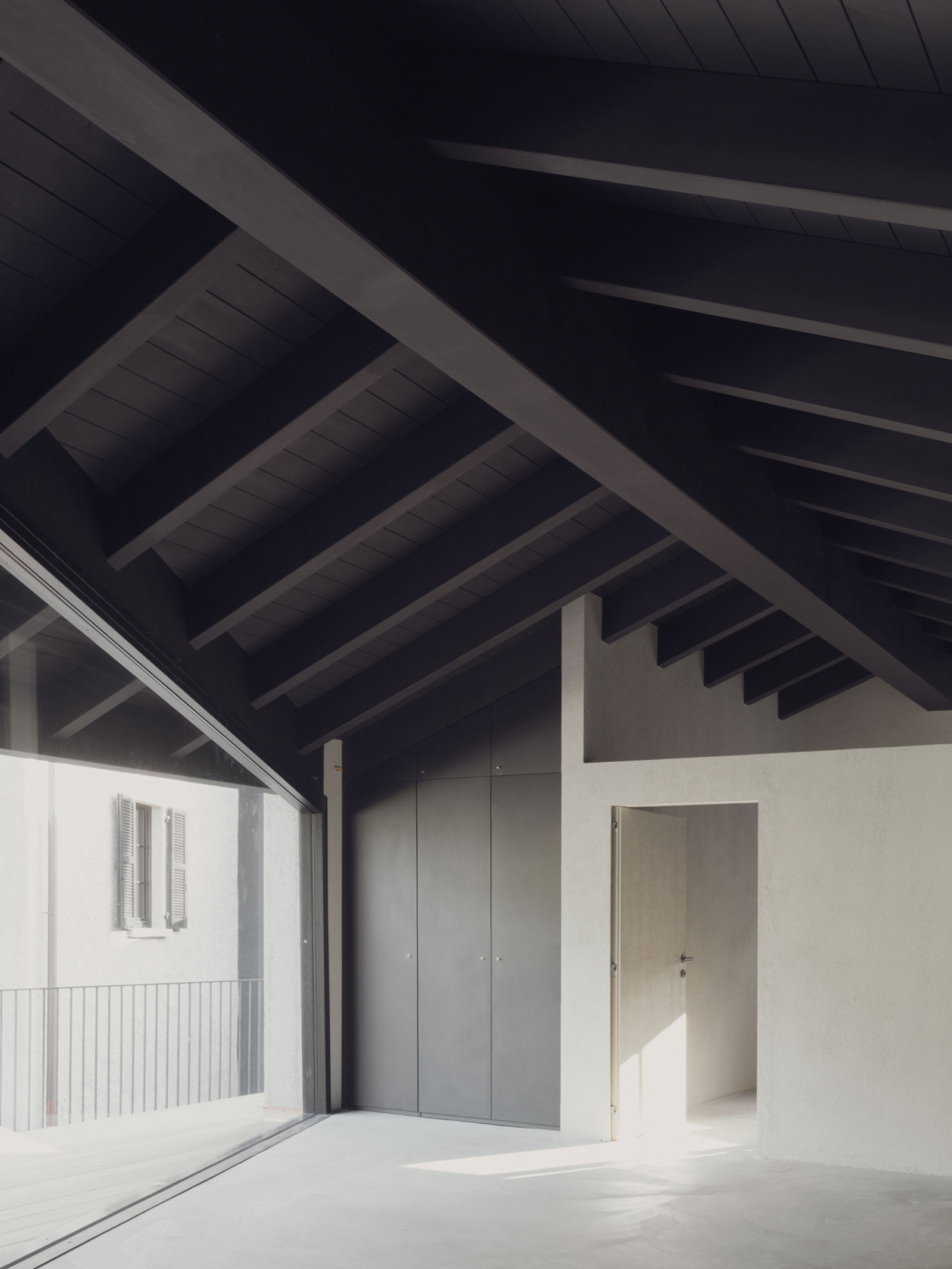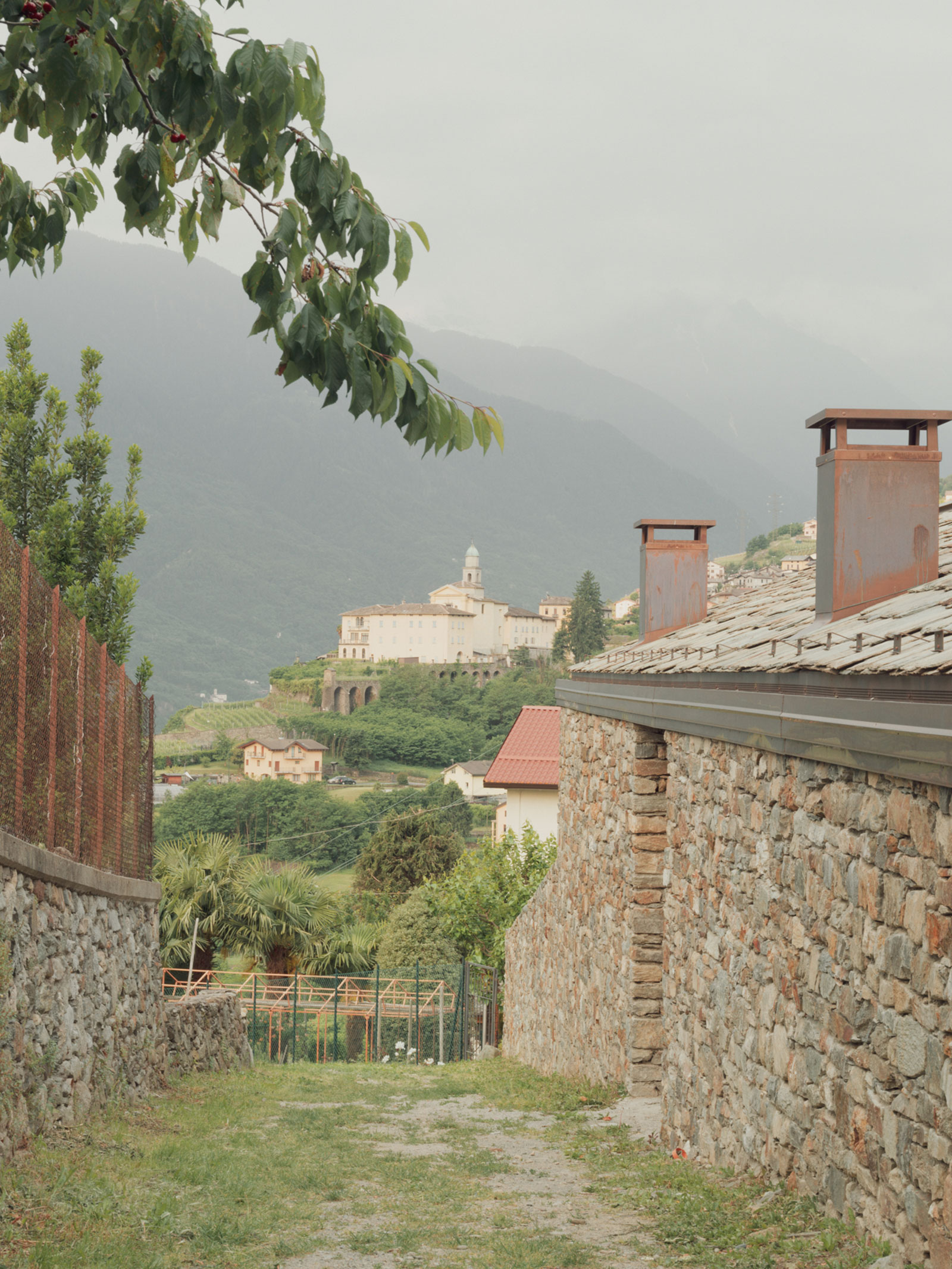 Irregular as well as challenging, the size and shape of the plot led to the creation of an idiosyncratic layout. A road borders the house on the west side while the historic Rusca trail is on the east side. The design partly follows the original stone walls of the ruin but also redefines the plot’s perimeter. Inspired by traditional homes and materials, the house is nevertheless subtly modern. It features large windows and glazed openings that overlook magnificent views of the Italian Alps.