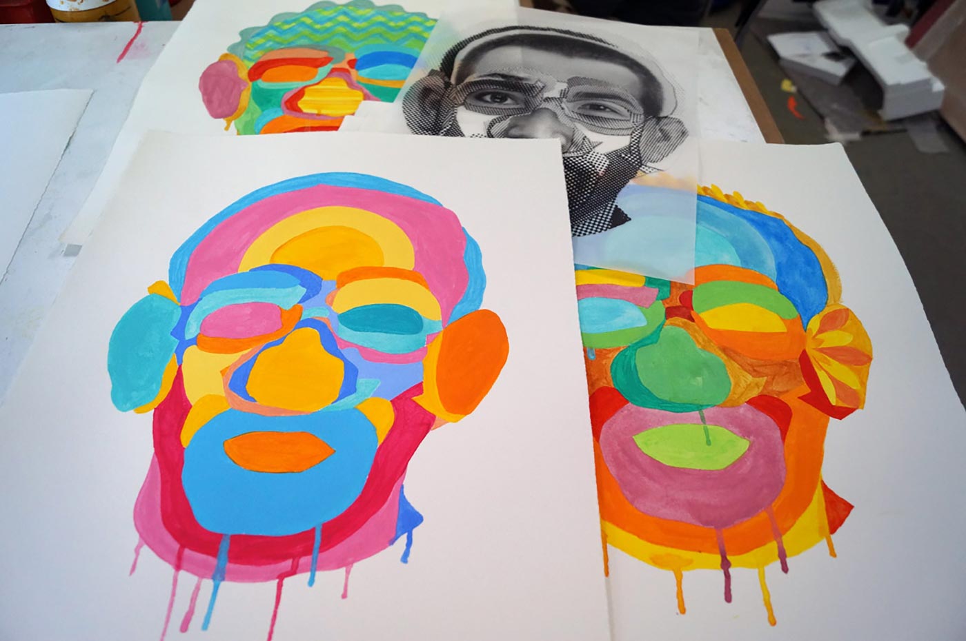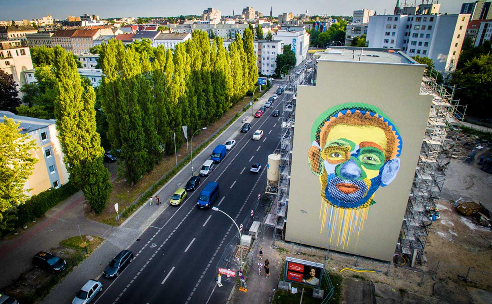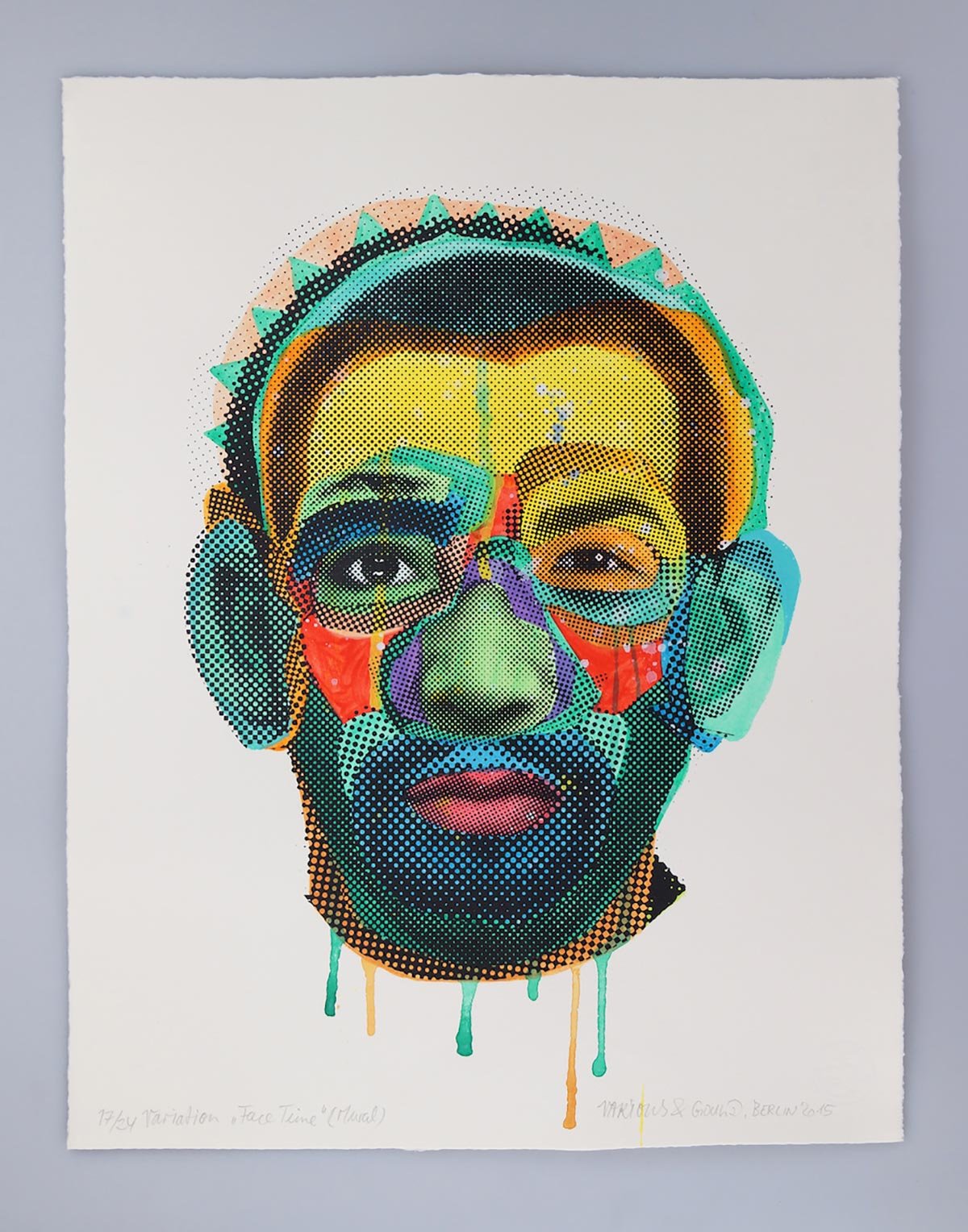 Berlin artist duo Various & Gould have taken their love of screen-printing to new heights with “Facetime,” a colorful mural that spans a 350 square meter façade on the border of Mitte and Kreuzberg. Their first attempt at a wall painting, the project from their 2015 series under the same name; a collection of collaged facial features, the unorthodox “portraits” are intended to question commonly perceived symbols of gender and beauty. Although each character is “fictional and [bears] no name,” they “appear more realistic and authentic than many of the glossy beauty faces represented in the daily news.” This large-scale, colorful expression poses a positive challenge to conventional media representations of the human form. Various & Gould have released a screen-print edition based on their mural, available exclusively at Urbanshit Gallery. See the mural for yourself in the video above shot by drone.