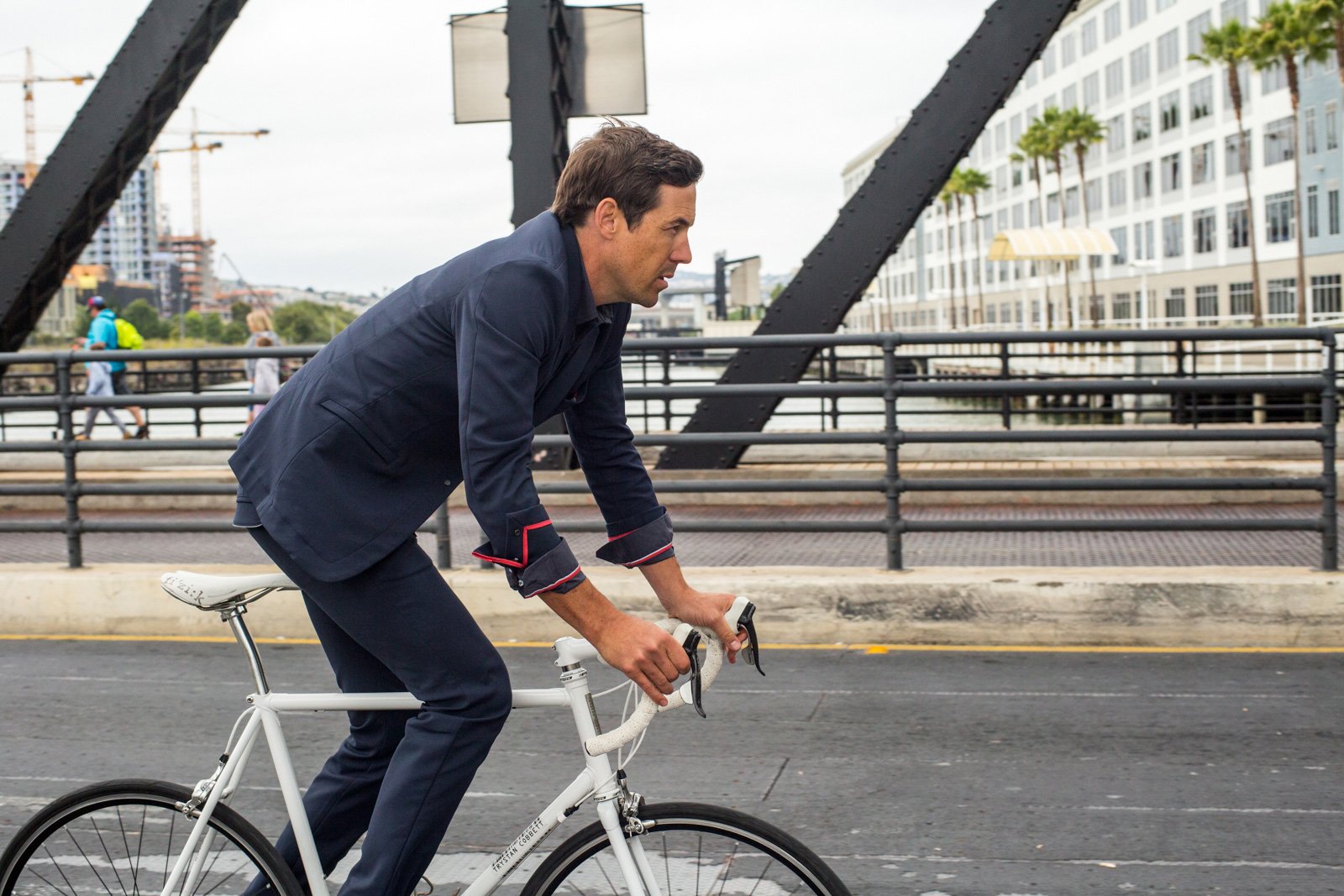 The fall 2014 line from the San Francisco clothiers Parker Dusseau includes a new blazer and chinos. Made of an Italian cotton and nylon blend stretch fabric, the menswear is active and professional for stylish guys who need a comfortable bike outfit and an office-approved look. Both of the fresh pieces stretch, repel water, resist stains, and dry quickly, just like a good workout outfit. Yet, the slim-fitting looks are suitable for business casual affairs as well. Modernizing classic styles, the collection features contrast stitching and top-quality hardware, YKK zippers and Cobrax performance snaps. The blazer ($425) is on-trend with a skinny, reflective lapel, and the chino ($195) is dresses up its traditional look with a gunmetal tack button. Find the whole outfit online in the Parker Dusseau webstore.