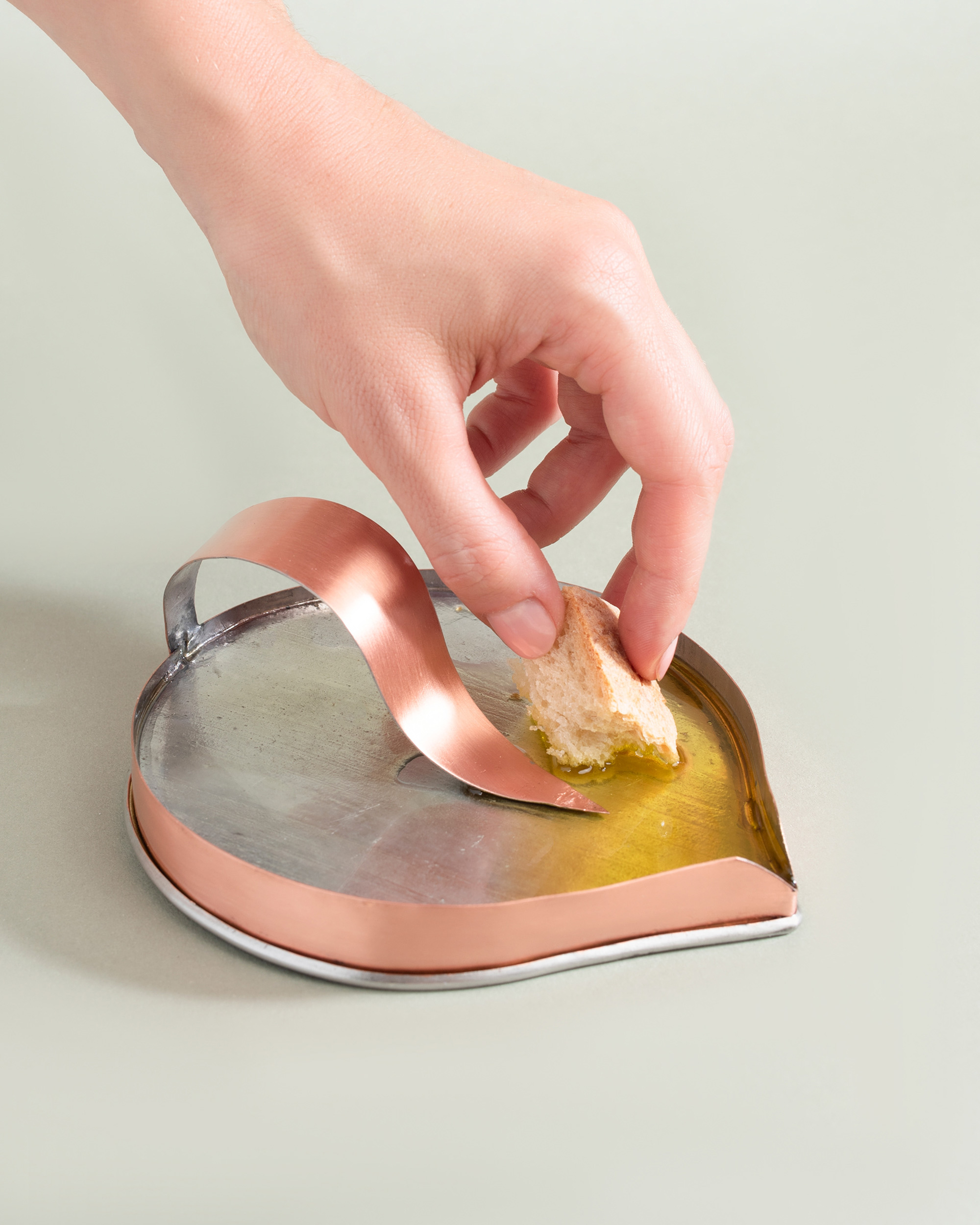 Each object has a specific purpose and plays a different part in the olive tasting ritual. For example, Gea is the “bread and oil” dish. Elegantly curved, it gives a nod to ancient traditions of welcoming guests. The design encourages the user to enjoy every crumb and drop of oil. Elio is a vessel that provides the perfect solution to both measure the ideal amount of oil and to serve it. This vessel minimizes oxidation and also helps to avoid waste. Finally, Pigi focuses on enhancing the olfactory experience. The user needs to hold the vessel by the olive leaf-shaped handle and smell the oil through the large rounded opening. Inhaling the sweet and intense scent prepares the user for the tasting stage, ensuring a multi-sensory experience.