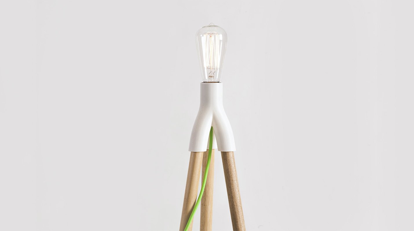 Design MID’s family of Fantasia lamps is made up of Mr. and Mrs. Fantasia and the Little Fantasias. All of the designs include open bulbs and 3D printed bases. The Mr. Fantasia design, unlike the other lamps in the series, is a hanging lamp with a cluster of three wired bulbs. The two other designs feature a single bulb standing on three legs, with the Mrs. Fantasia design holding the bulb upright and the Little Fantasias bending theirs at odd angles.