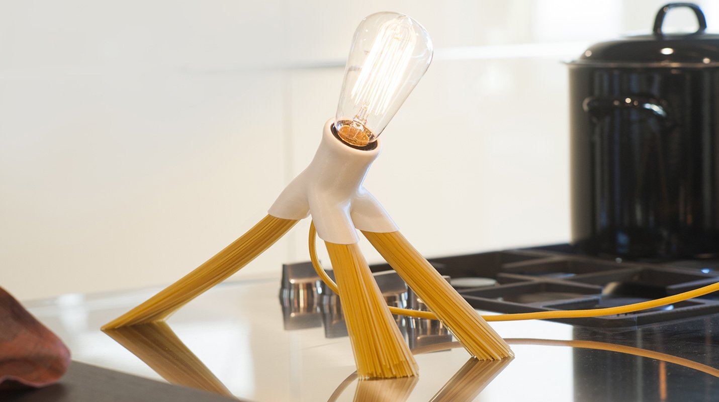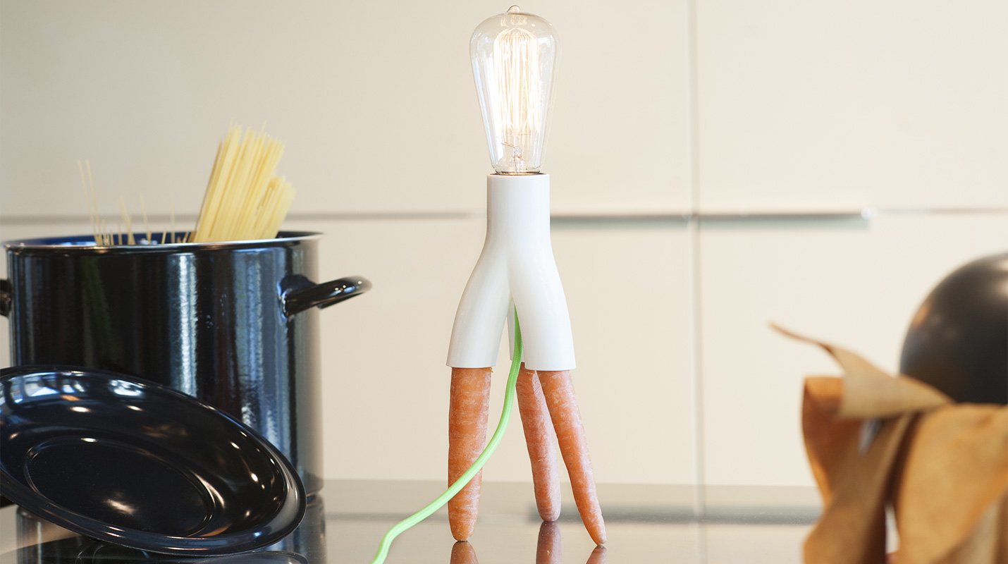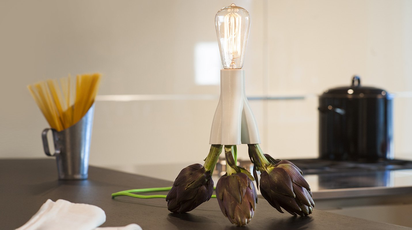 Inspired by Disney’s Fantasia, the lamps repurpose household objects, with possible combinations ranging from Mickey Mouse’s iconic broom to edibles such as carrots, artichokes, and spaghetti. Combining the sleek fixtures with changeable organic components, the Fantasia lamps bring new life to home lighting.