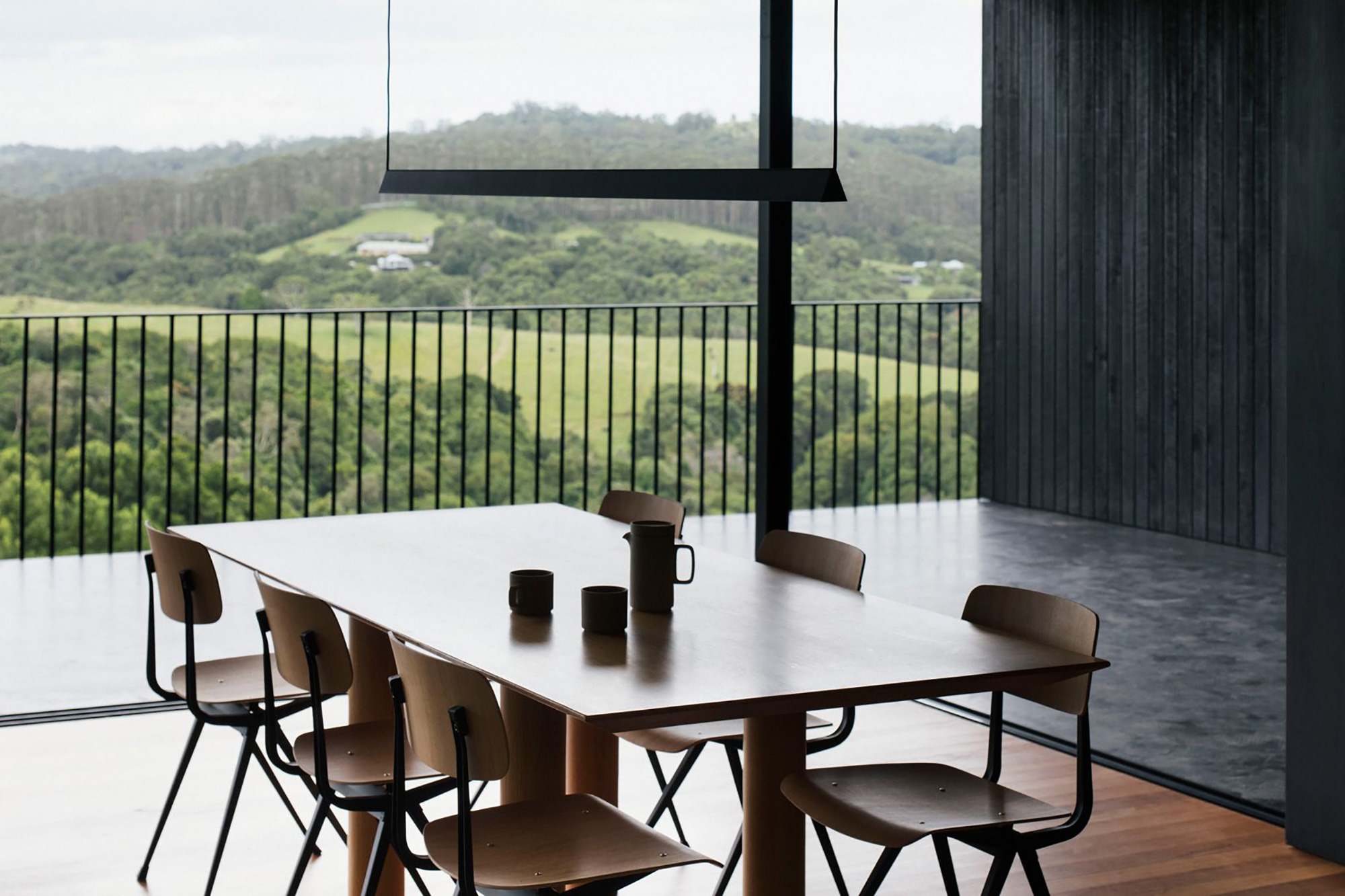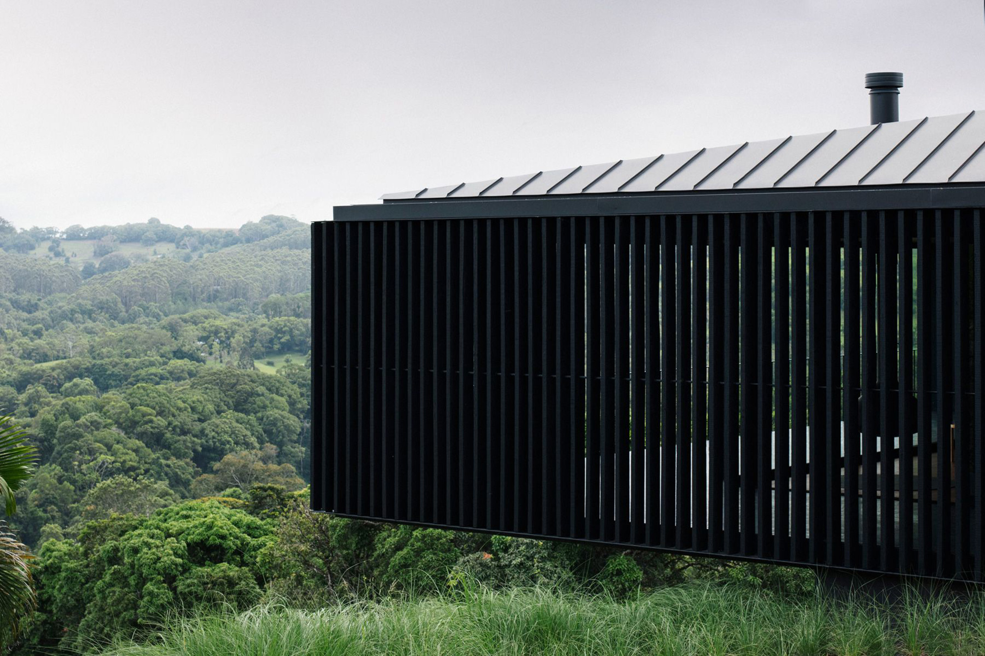 Perched atop of a hill in the Byron Bay hinterland, Australia, Federal House strikes an arresting figure with its distinctive design. Melbourne-based architecture studio Edition Office designed the dwelling as a structure that enables a strong bond between the inhabitants and nature. The house boasts black concrete volumes with angular lines and carefully positioned openings as well as a screen of black wood battens. The latter shelter the living spaces from direct sunlight and also protect a central courtyard. At the core of the house, the fern garden brings nature into the heart of the living spaces. At the same time, it acts as a connecting space between two main social areas.