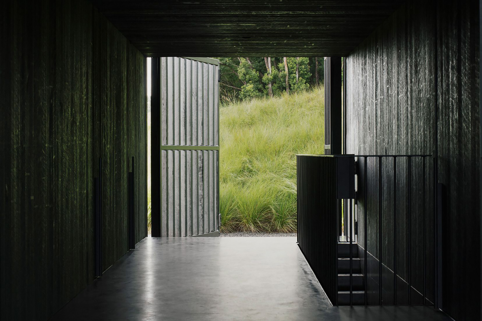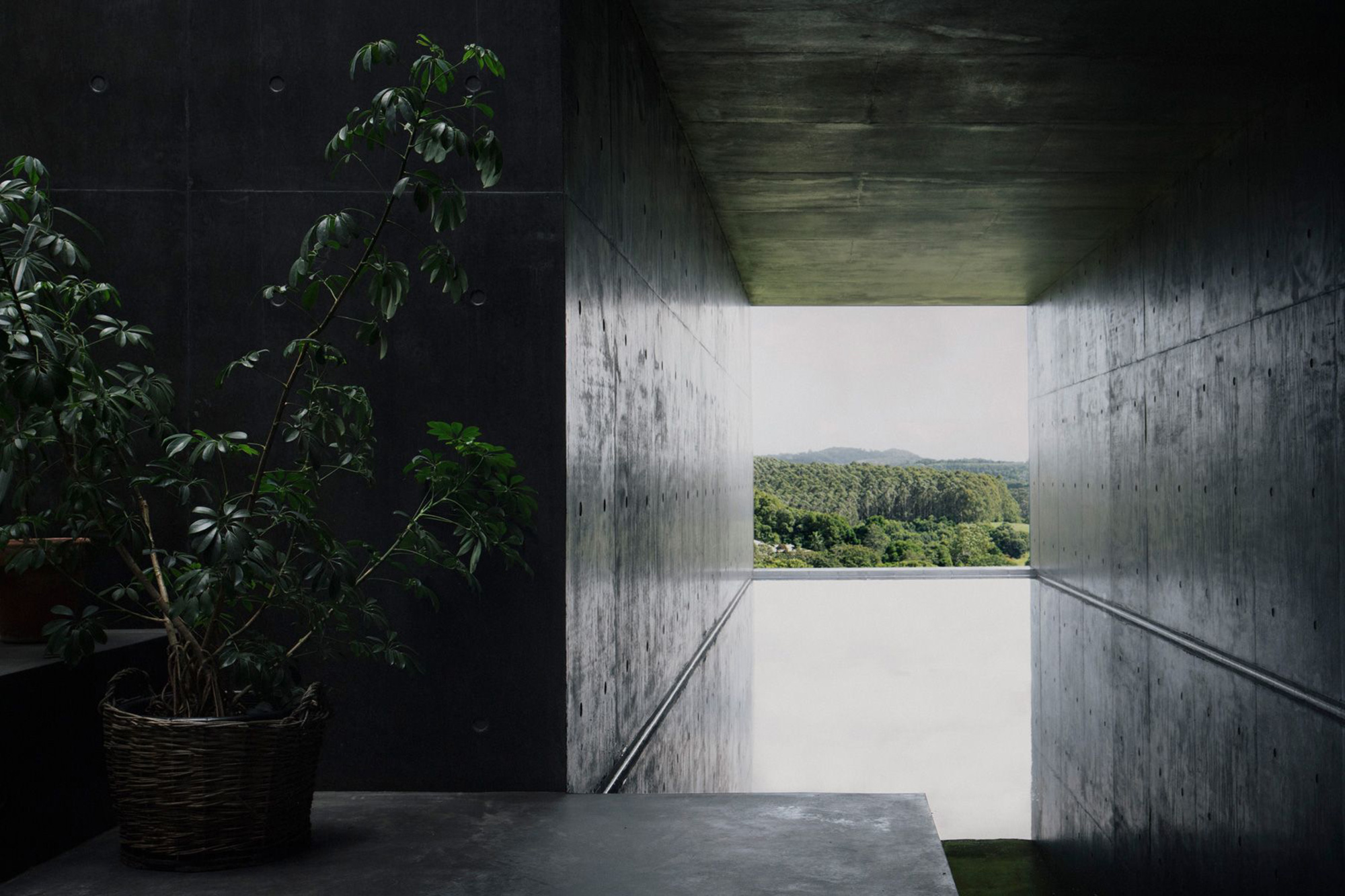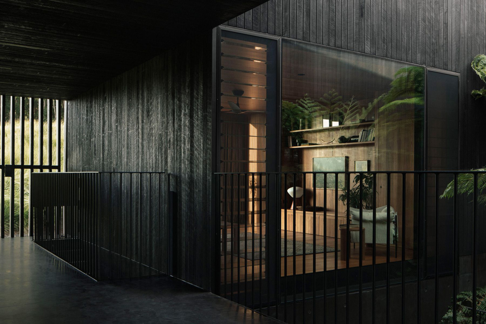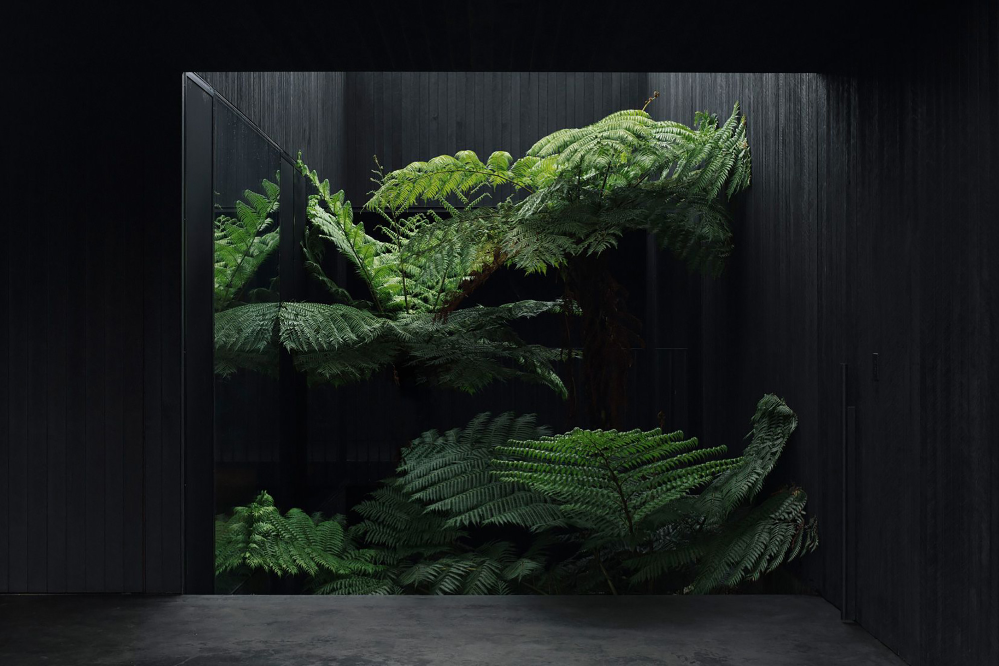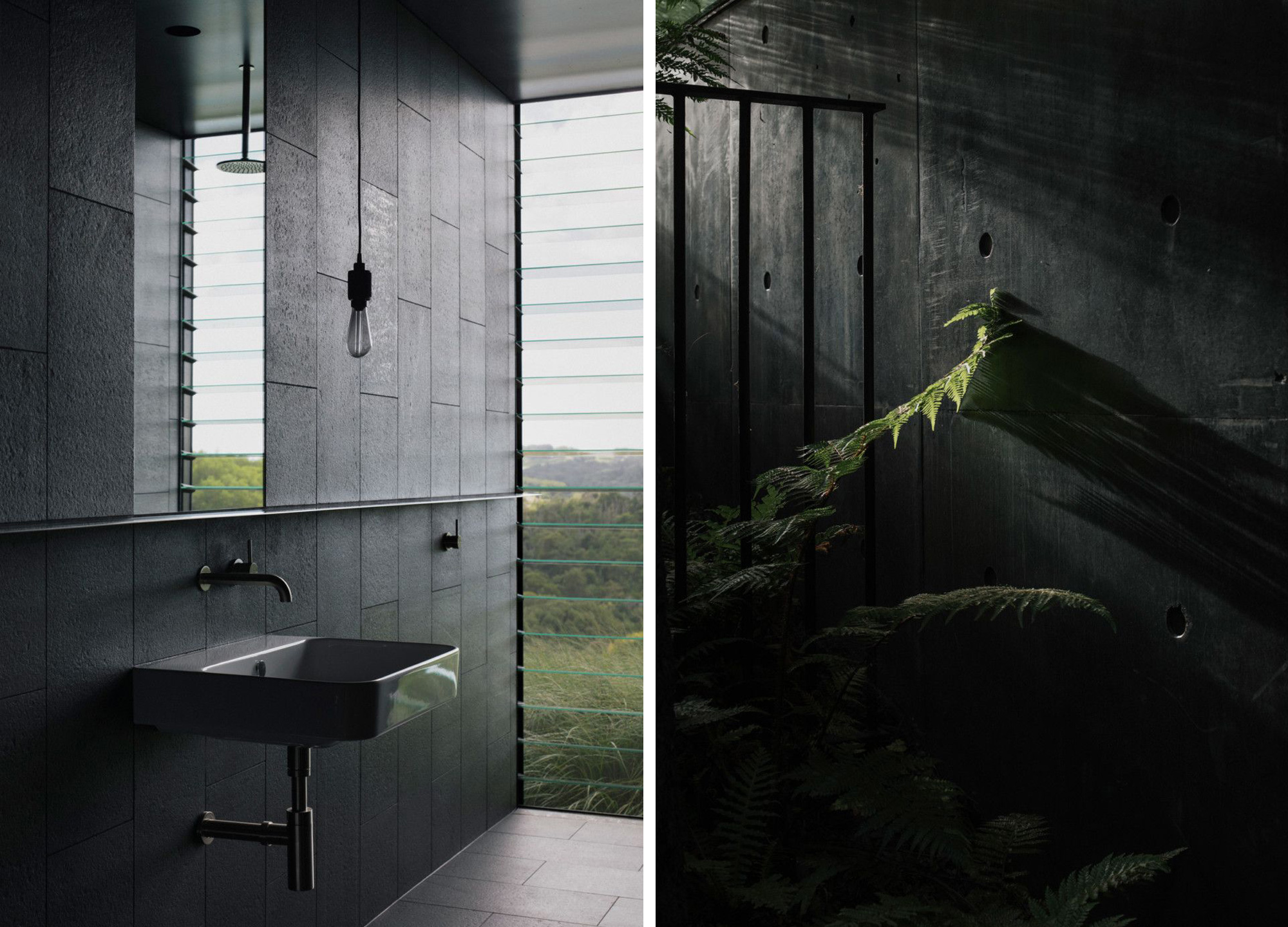 While located partly underground, underneath the living spaces, the swimming pool offers access to lush views through a large opening. The pool extends over the entire length of the house and also features a small deck area. The three bedrooms and two bathrooms occupy the space that extends above the black concrete volume. Open-air hallways surround the fern garden. The studio used a minimal material palette for the interior. The bedrooms and common areas boast warm wood flooring and walls along with leather and wood furniture. By contrast, the bathrooms, pool area, and hallways feature black concrete and stone finishes. The dark and natural brown colors create a cozy, shelter-like atmosphere while also putting the focus on the green surroundings. Photographs© Benjamin Hosking.