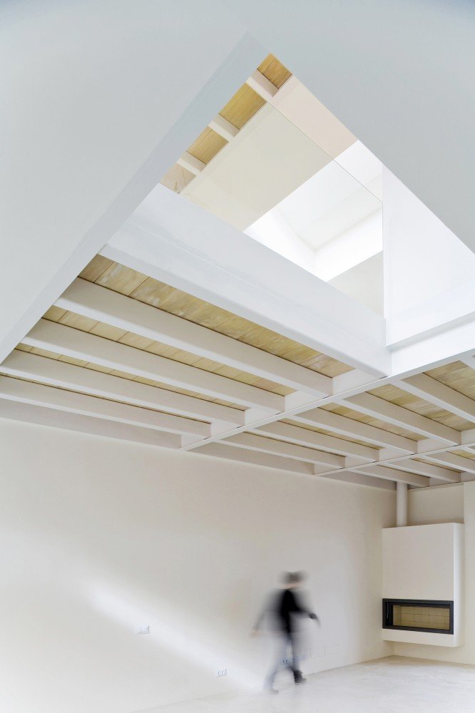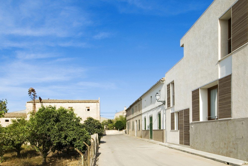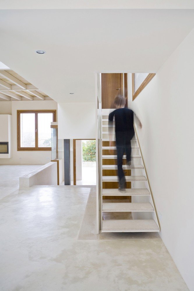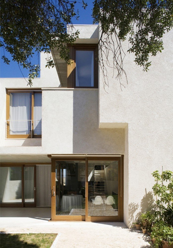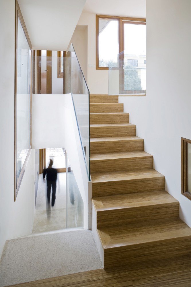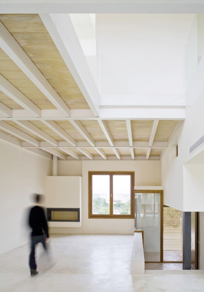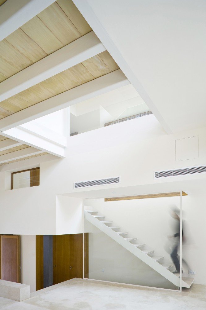 Although site context is often presented as a planar parameter, Spanish architecture studio RipollTizon demonstrates a sectional awareness of the urban fabric. Ferriol House, situated on a residential street in Mallorca, Spain, responds to the elevations of its neighboring houses and the rise of the street. The interior of the house features a split-level on the first floor to reflect the site, and the orthogonal volumes of building intersect to build a spatial collage. Glass banisters the staircases and interior balconies, in addition to the white and natural finishes, help create unity within the space that is characterized by the unconventional massing, which is also revealed by the mélange of wooden shutters and fenestration.