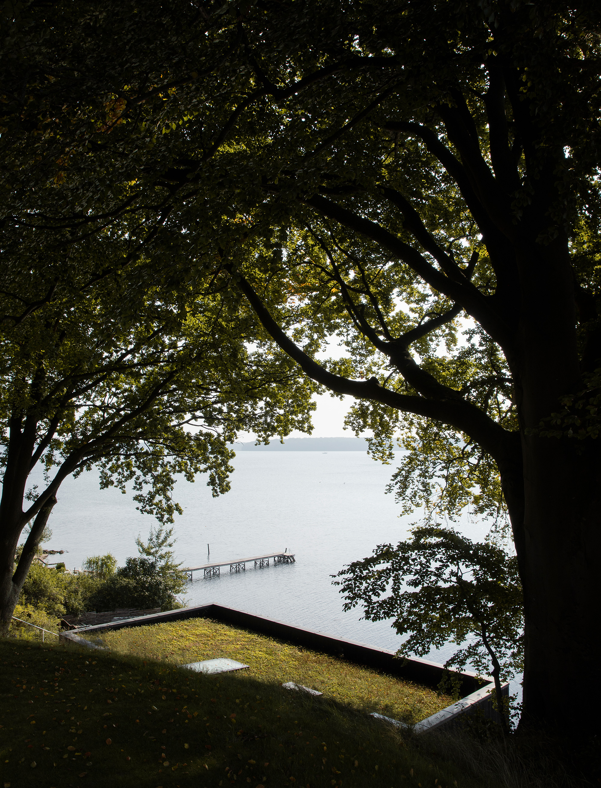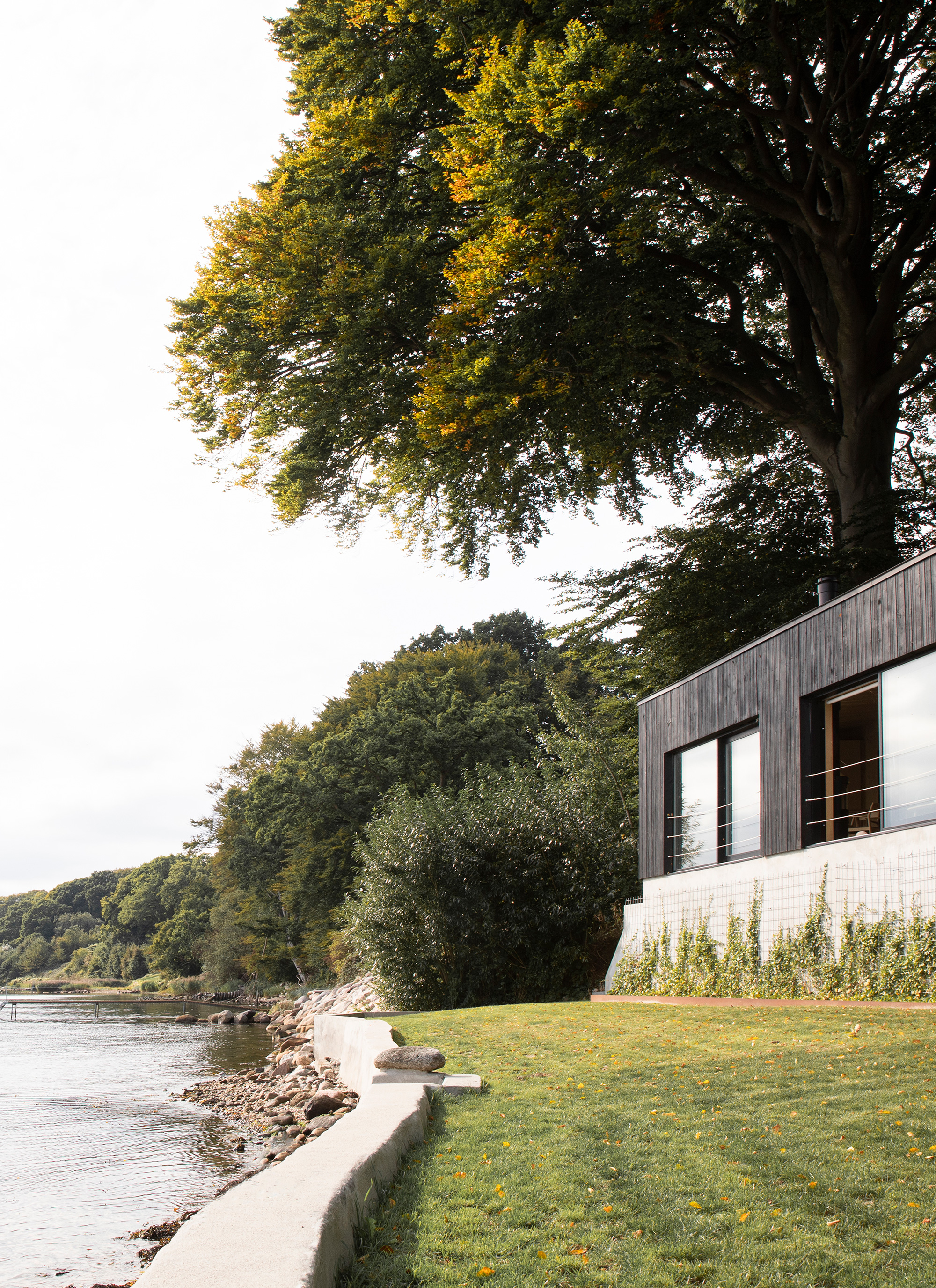 Built close to a lake’s water edge, on the border between Denmark and Germany, The Fjord Boat House is a contemporary dwelling that doubles as guest house and holiday retreat. Designed by multidisciplinary architecture and design studio Norm Architects, the volume is minimalist and modern but looks at home in the natural landscape. The house has a concrete foundation and black wood cladding. Vines climb across the light concrete base, while grass grows on the green roof. Handmade ceramic brick stairs lead guests from the main house to the terrace and the entrance to the boat house. The studio also used this rustic material in the interior, creating a distinctly warm and welcoming space.