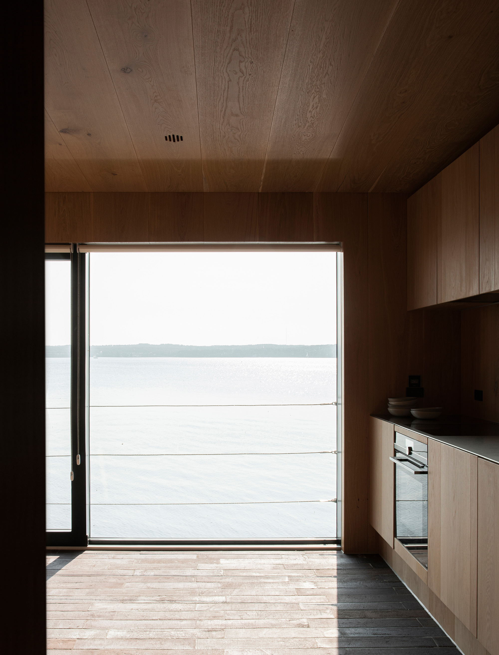 In the kitchen, oak cabinets and light wood surfaces on the walls and ceiling complement the texture of the ceramic bricks. Placed right in front of a large window, the dining table offers uninterrupted views of the lake and surrounding nature. Apart from washi paper pendants that brighten the kitchen, the studio also used other products from the Norm Architects collection. Among them, the Koku Table that adds a creative accent to the living room with an asymmetric design. Two bedrooms with sleeping spaces nestled in alcoves provide a comfortable place to relax and rest. Above the sleeping areas, skylights offer views of the trees and the sky, connecting the inhabitants to nature further. Photographs© Jonas Bjerre-Poulsen.