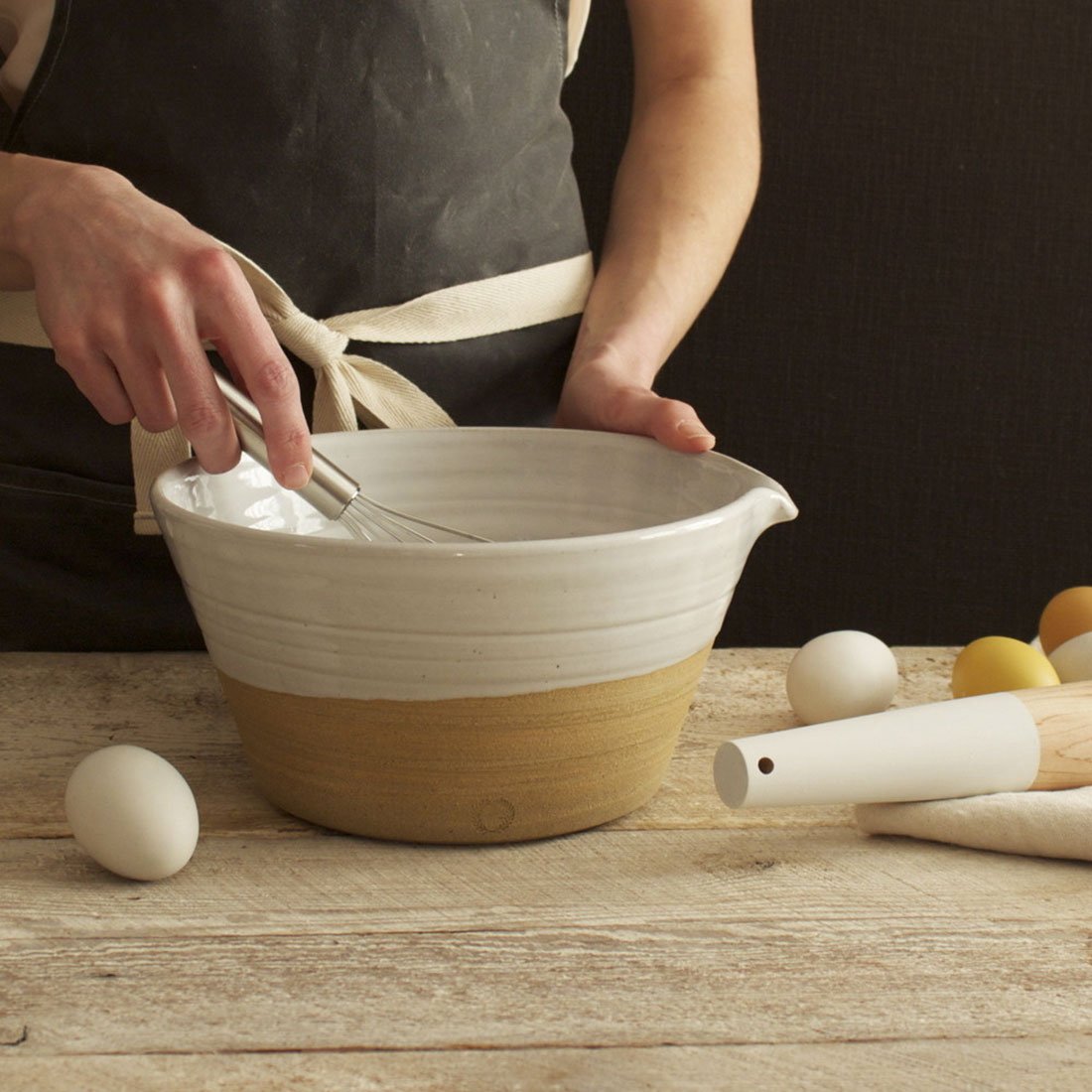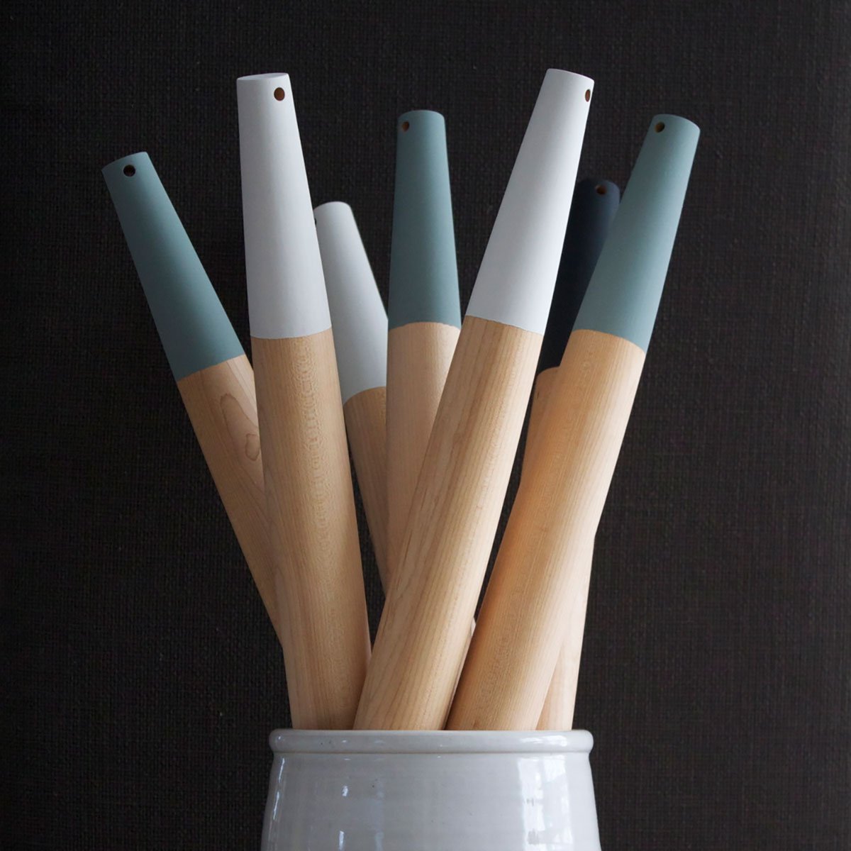 The American Maple Dipped Baker’s Pin is a tapered design crafted in Vermont by Farmhouse Pottery. Lathe-turned until smooth, the hardwood is finished with natural oil and dipped in a food-safe paint. The accent comes in one’s choice of white or seafoam green and highlights the drilled hole, which can be strung with twine to hang the pin. ($50)