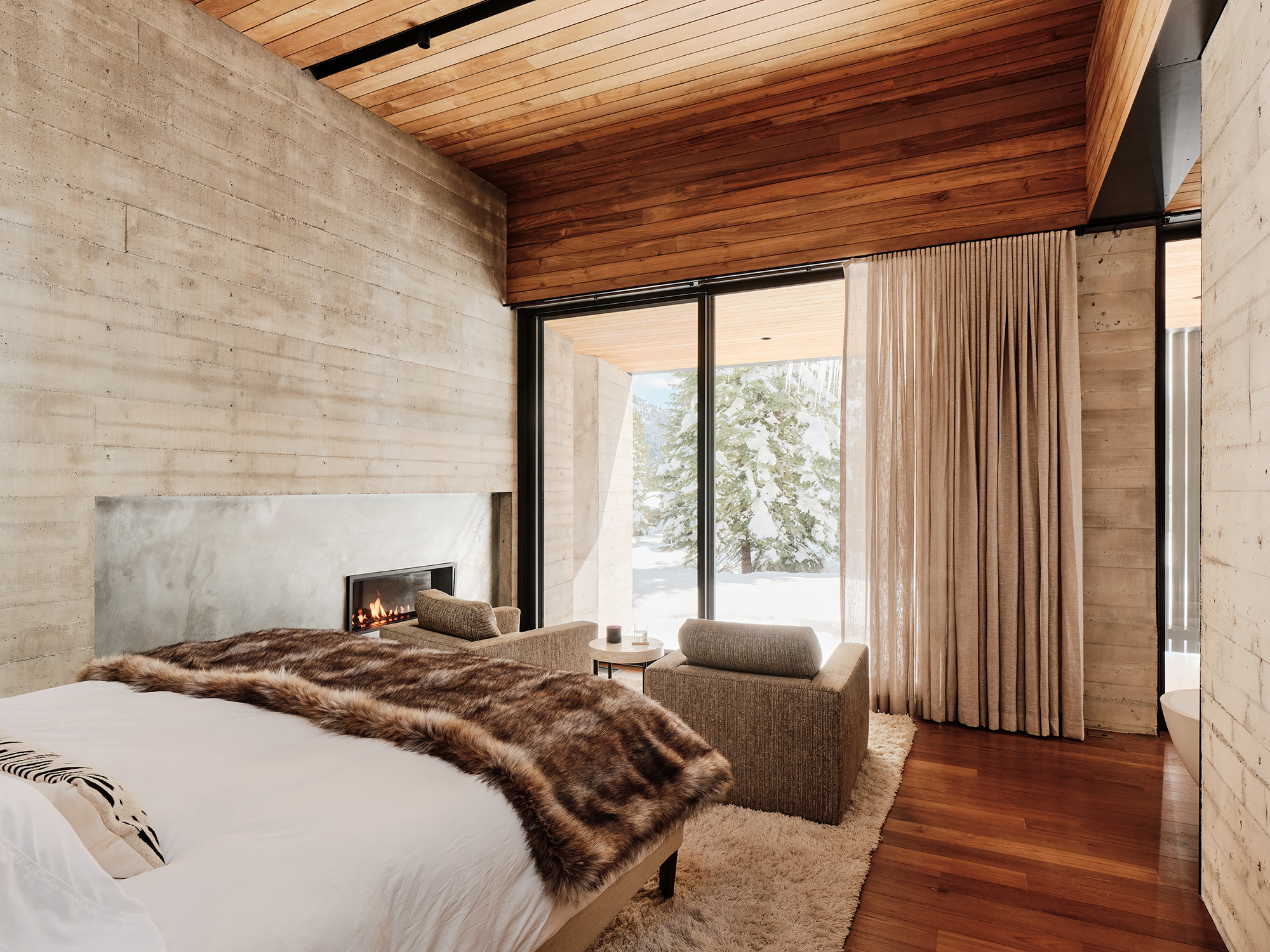 Located in Truckee, in the Martis Valley close to the north shore of Lake Tahoe, California, Forest House immerses its residents in a gorgeous natural setting. Faulkner Architects nestled the dwelling in a woodland. Jeffrey and sugar pines along with white and red fir trees surround the building. The rectangular form of the house minimizes the structure’s impact on the site while maximizing its connection to the natural surroundings. Drawing inspiration from the bark of the nearby trees, the steel rainscreen boasts an ebonized surface. The metal shell protects the wood-clad sections of the house from both wildfire and the elements.