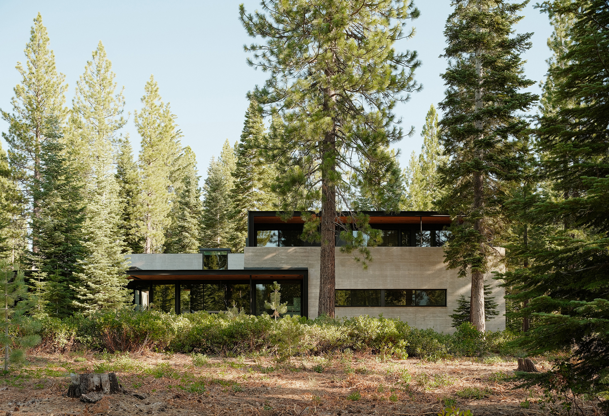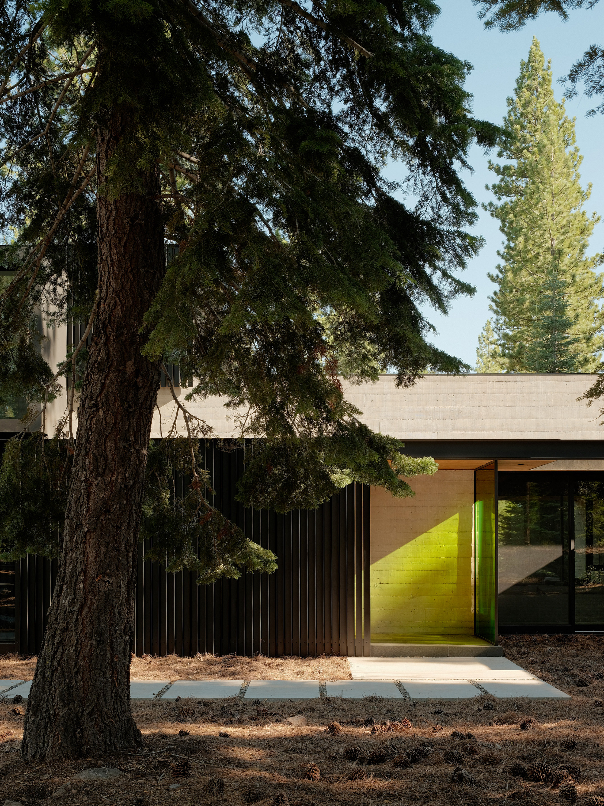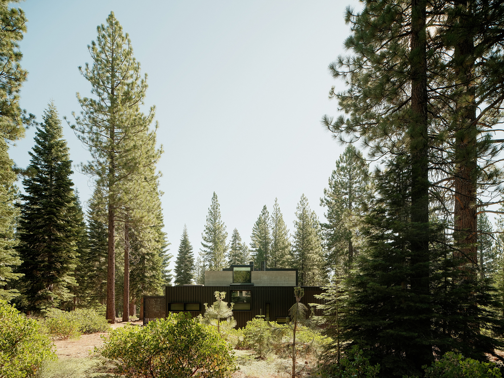 A steel and wood house nestled in a forest near Lake Tahoe.