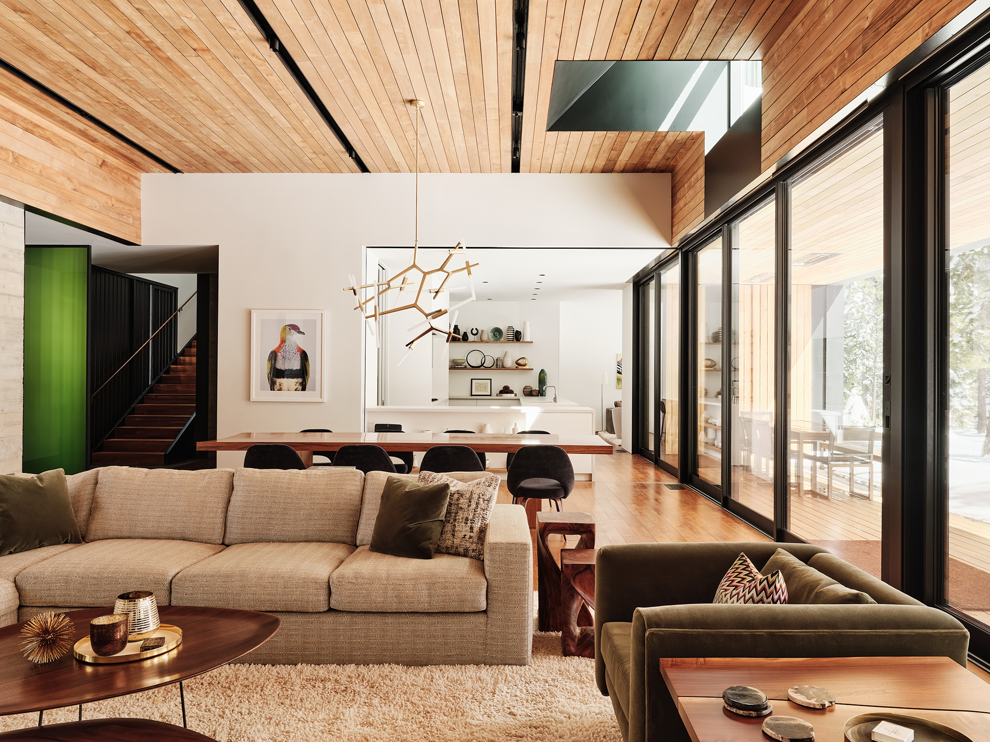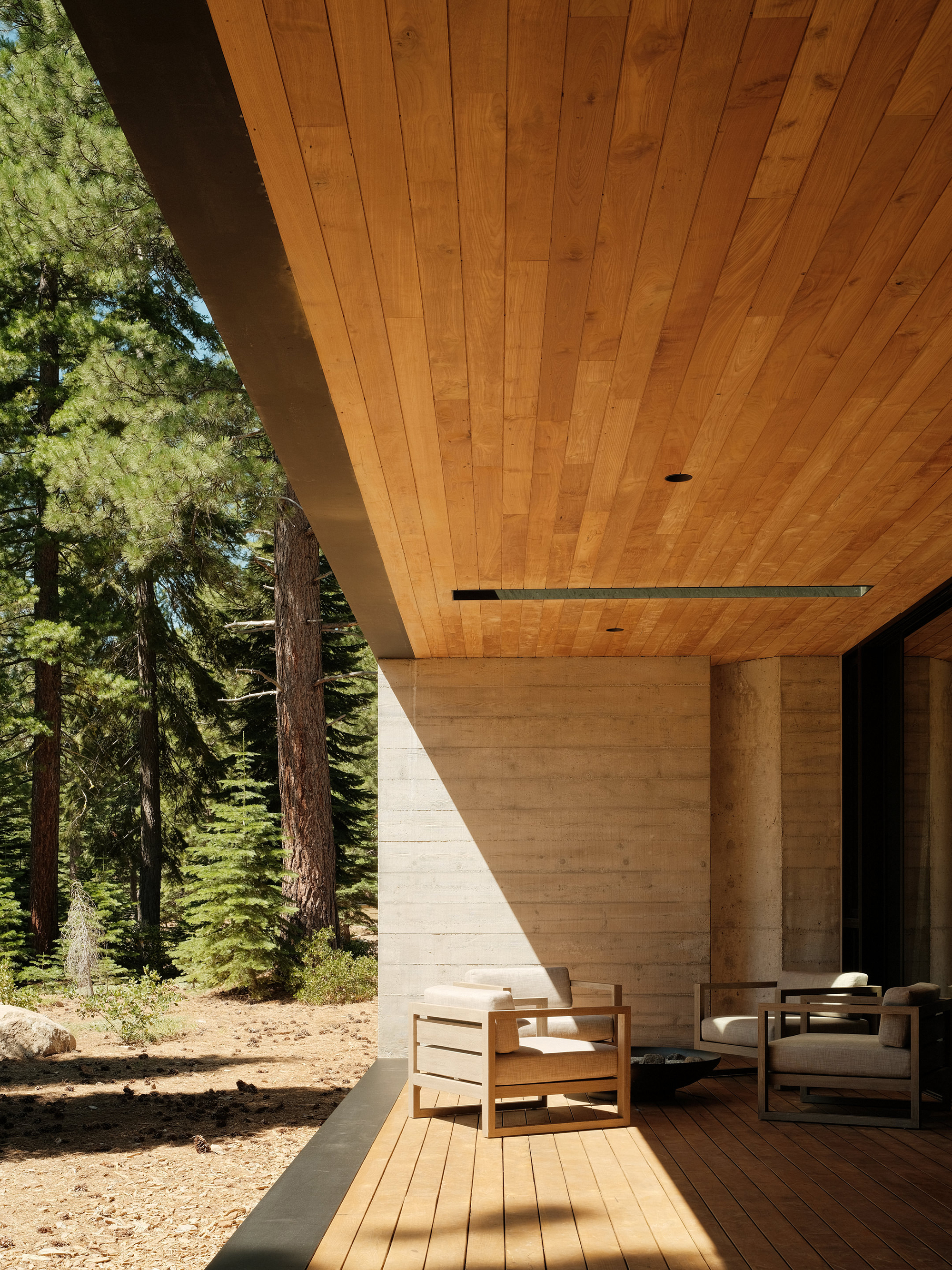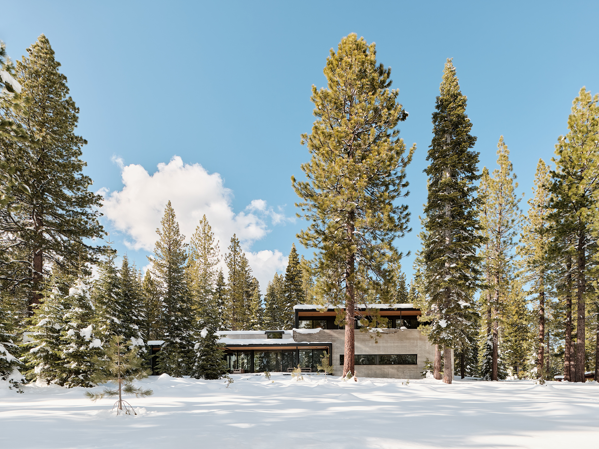 A steel and wood house nestled in a forest near Lake Tahoe.