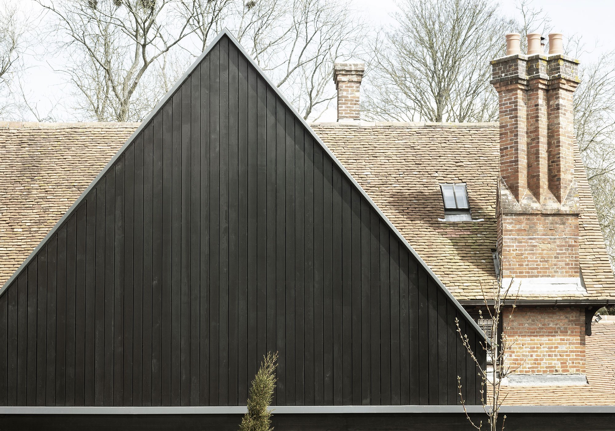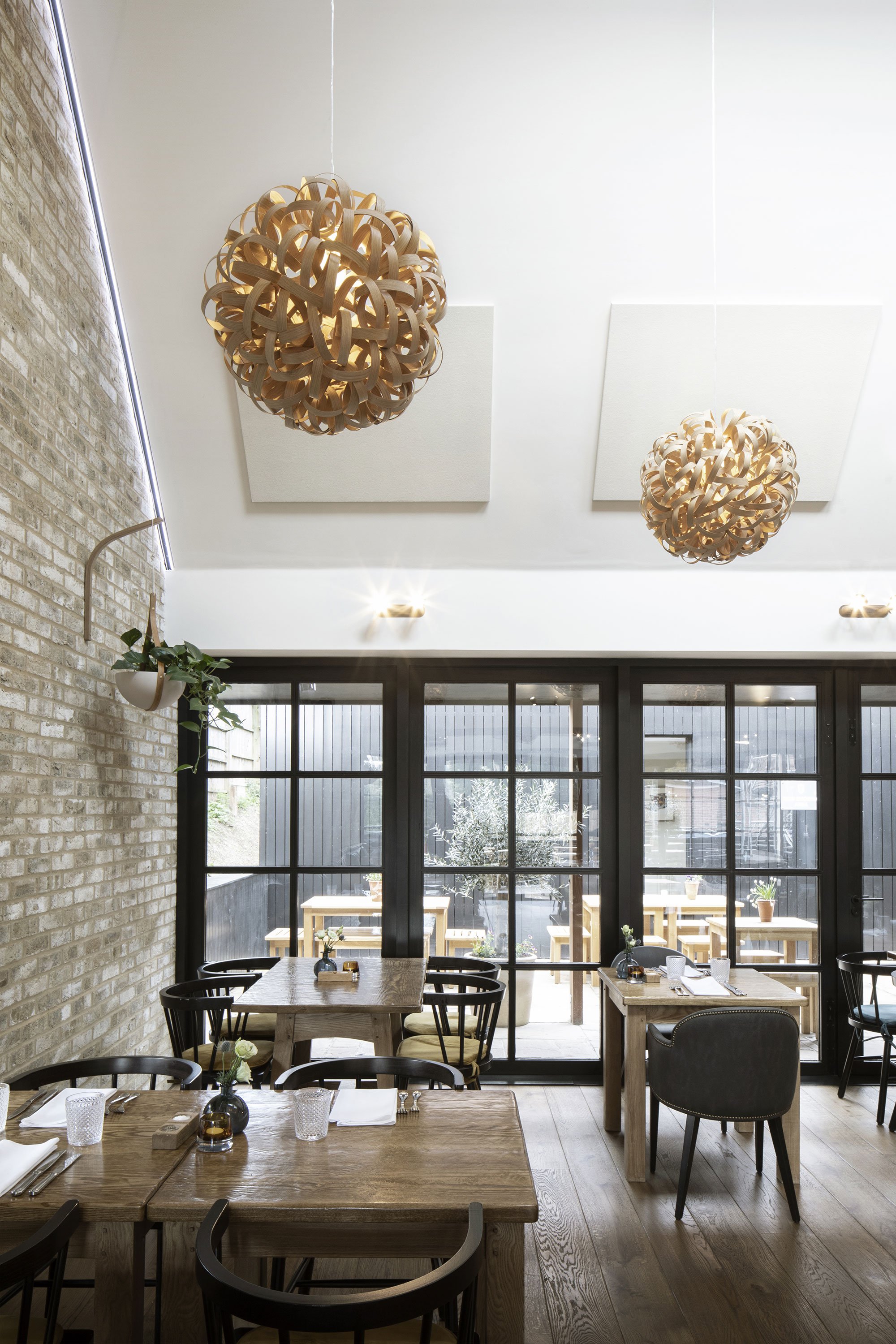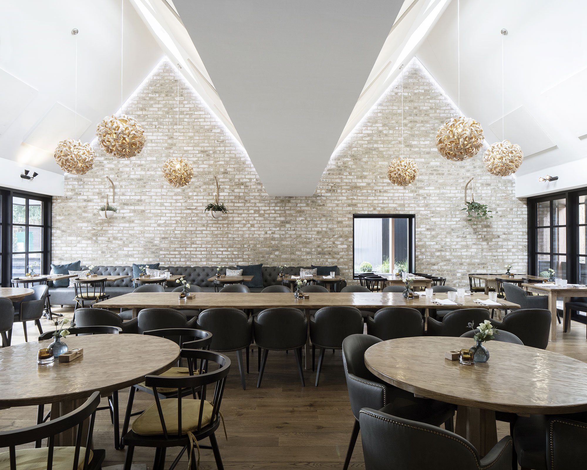 The new volumes have three pitched roofs that remind of vernacular and agricultural architecture. Clad in black stained timber, the structures complement the original house and its exposed brick exteriors. The team brought the interiors to modern standards while preserving as many of their original features as possible. The building houses a custom bar area and two large dining rooms. One of them boasts vaulted ceilings as well as glazing that opens the space to the courtyard and gardens. Brick walls and solid wood flooring give the rooms a warm, rustic feel. Creative lighting and a blend of classic and contemporary furniture create a refined ambience.