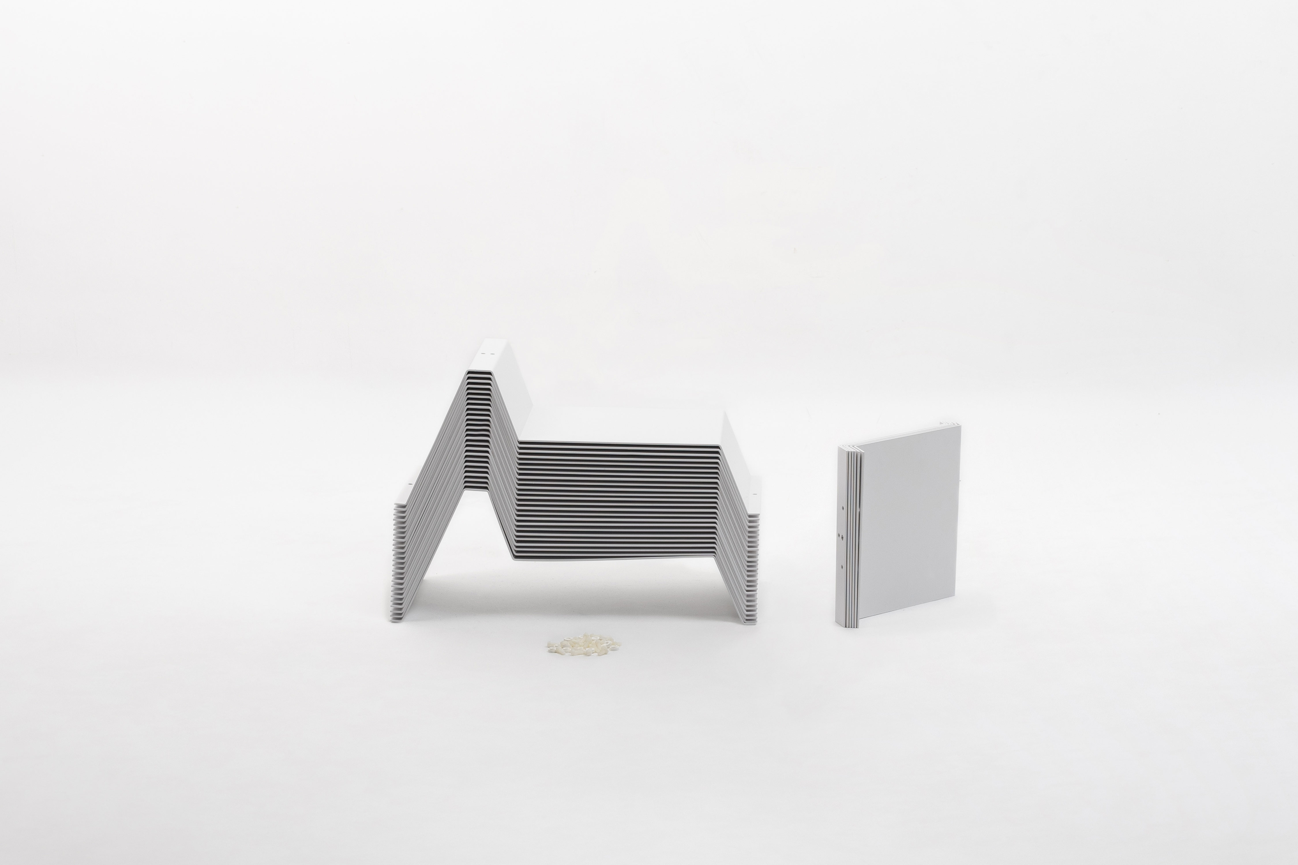 Made with a modular design, Frequence allows a wide range of configurations, depending on the user’s needs. For example, the aluminum shelves can create a smaller shelving unit, a ceiling-high bookcase, creative side table, or even a room divider. The user can adjust the number of elements as well as their horizontal or vertical orientation. Lightweight but sturdy, the shelves can support an array of items, from books to decorative objects. This unique white bookcase suits both living spaces and offices, providing an ingenious solution to transform a utilitarian concept into a sculptural design. Finally, Frequence occupies minimal space during shipping or in storage, as the metal components are stackable. Photographs© Matthieu Gauchet.