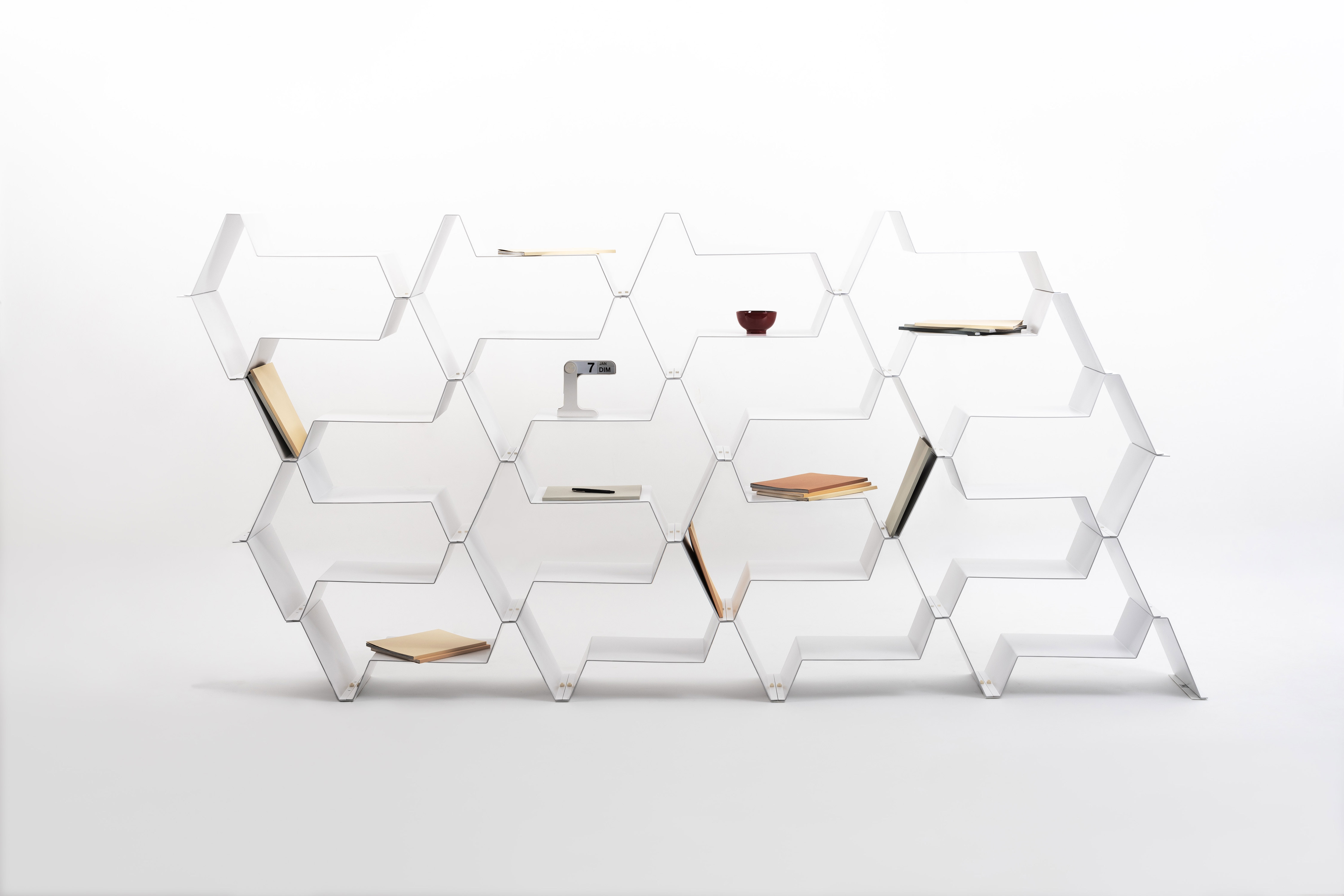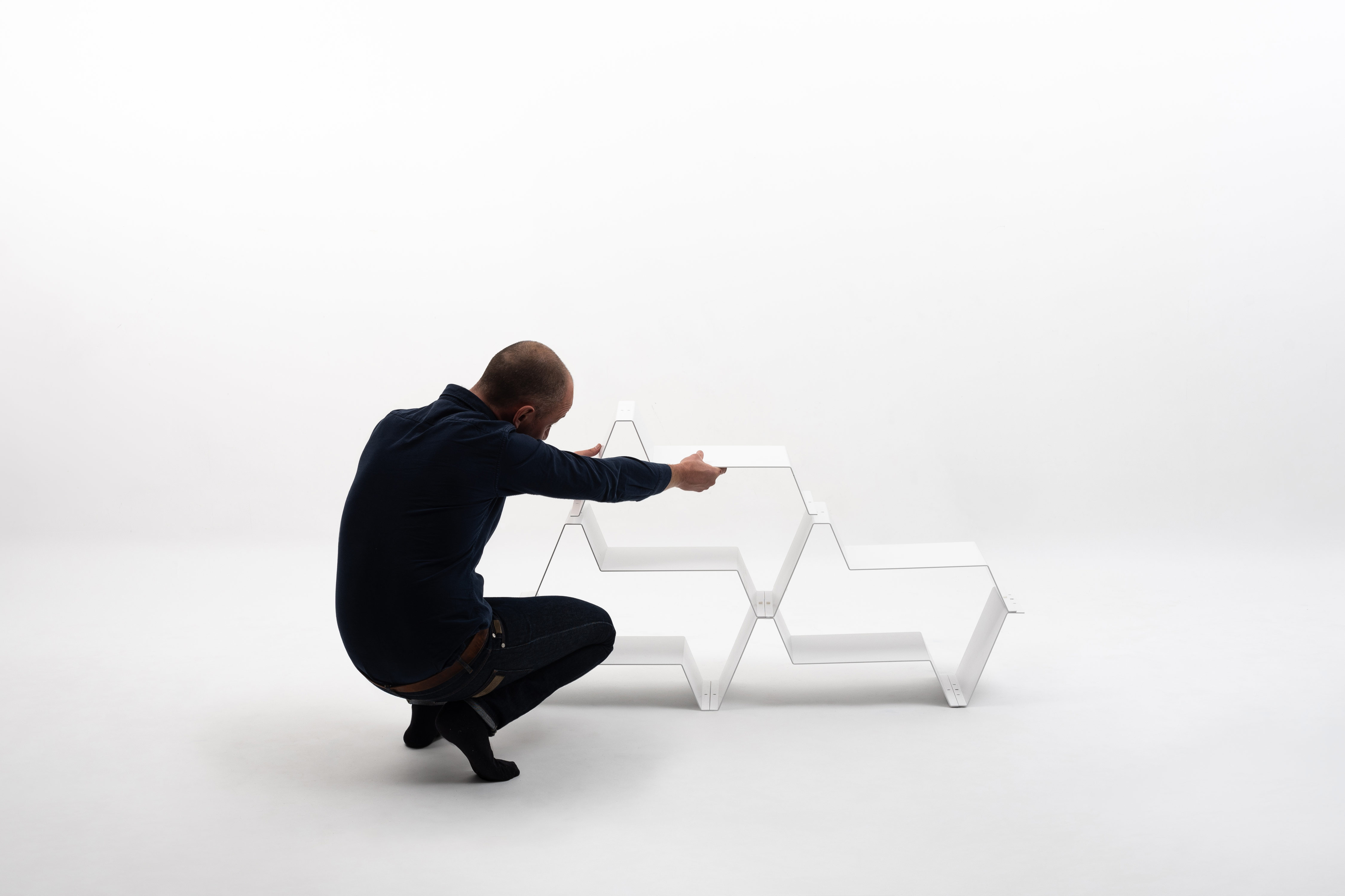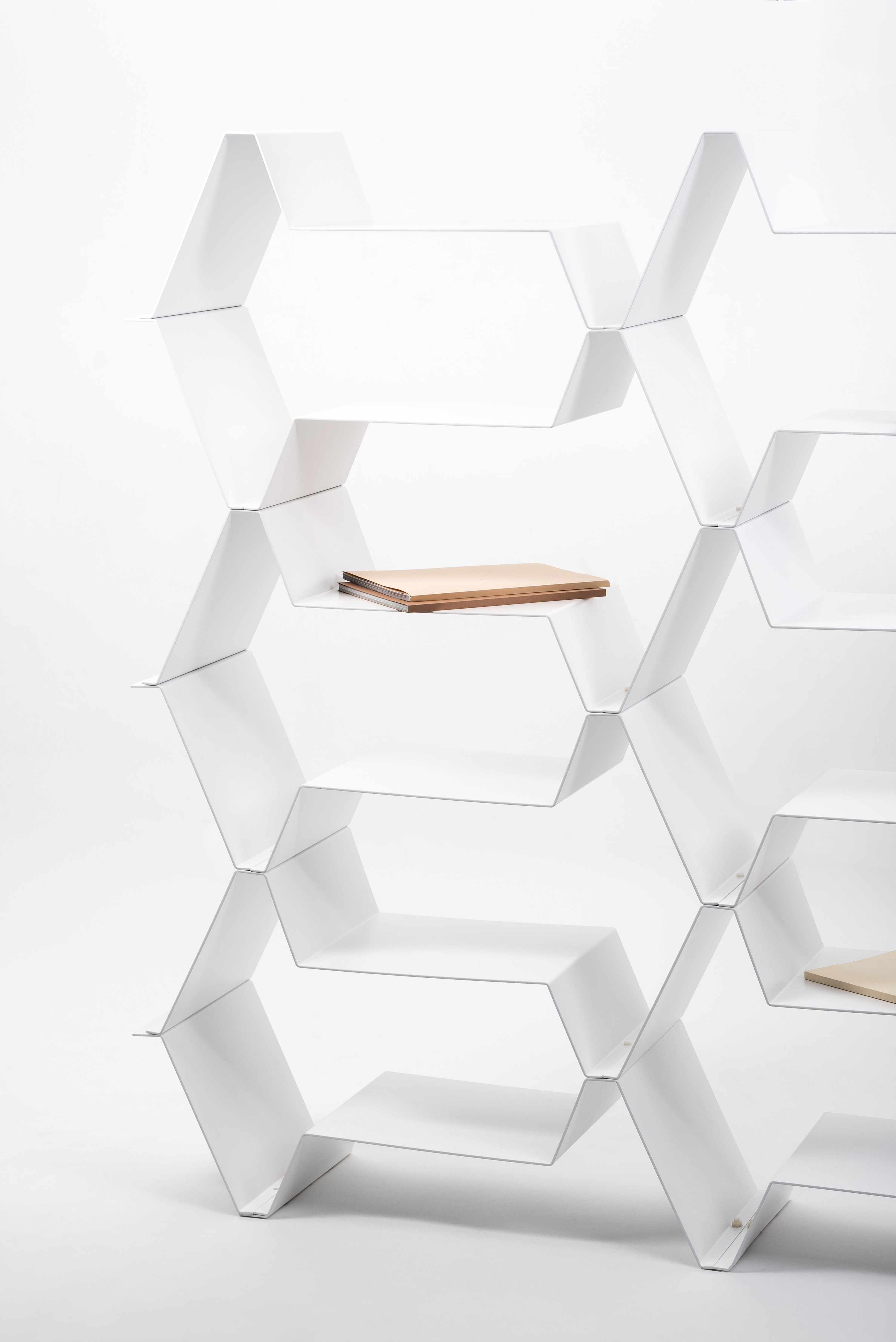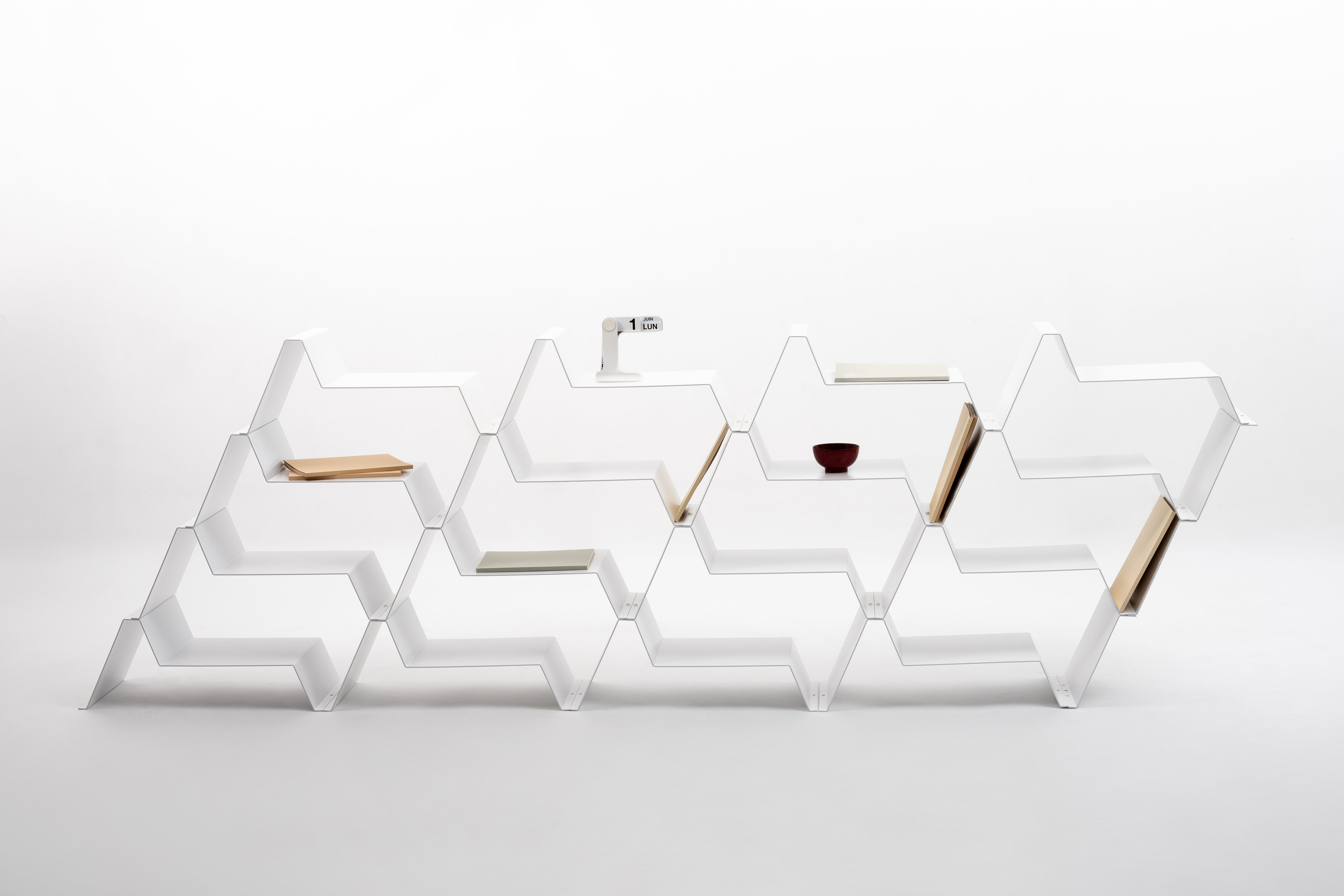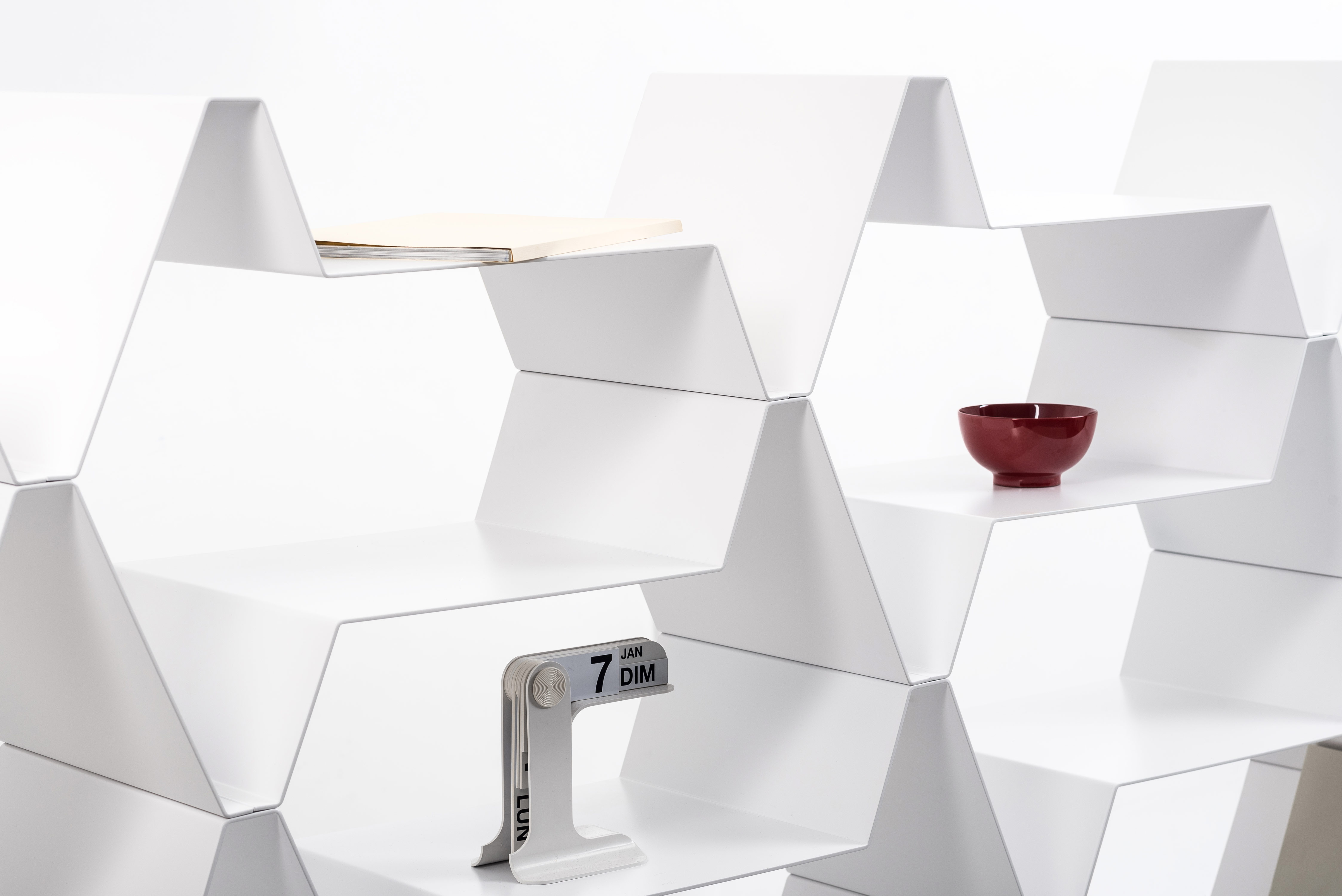 Designed by Paris-based designer Jean Couvreur for furniture brand Kataba, the Frequence Bookcase provides endless customization possibilities. The ingenious design features two separate elements cut from a 4mm-thick sheet of aluminum. One element is larger than the other, but they fit together perfectly to create shelving with a distinctive shape. The simple design puts a focus on the dynamic rhythm of the geometric pattern, creating a focal point in any living space. This unique white bookcase is also easy to adapt to become something else entirely.
