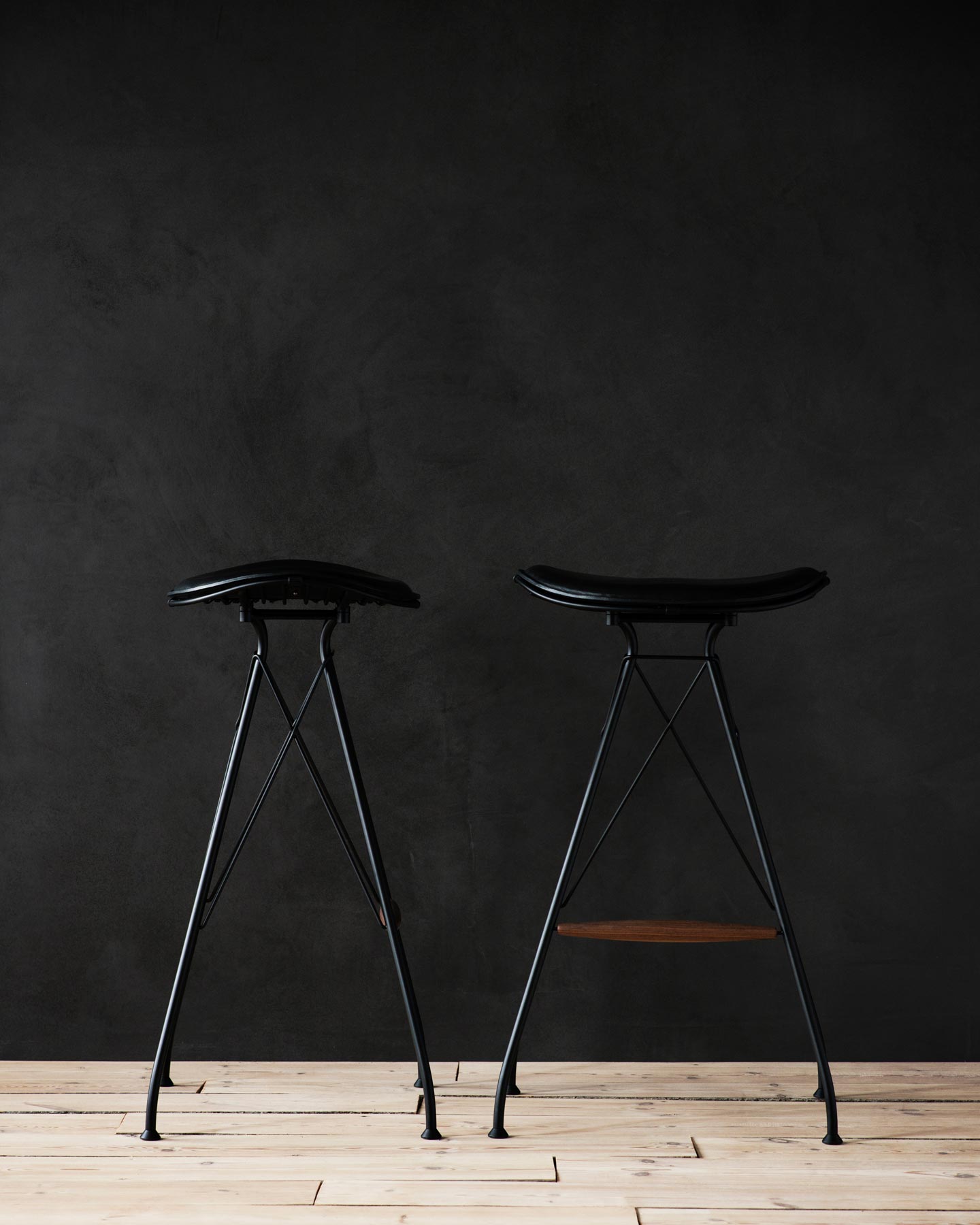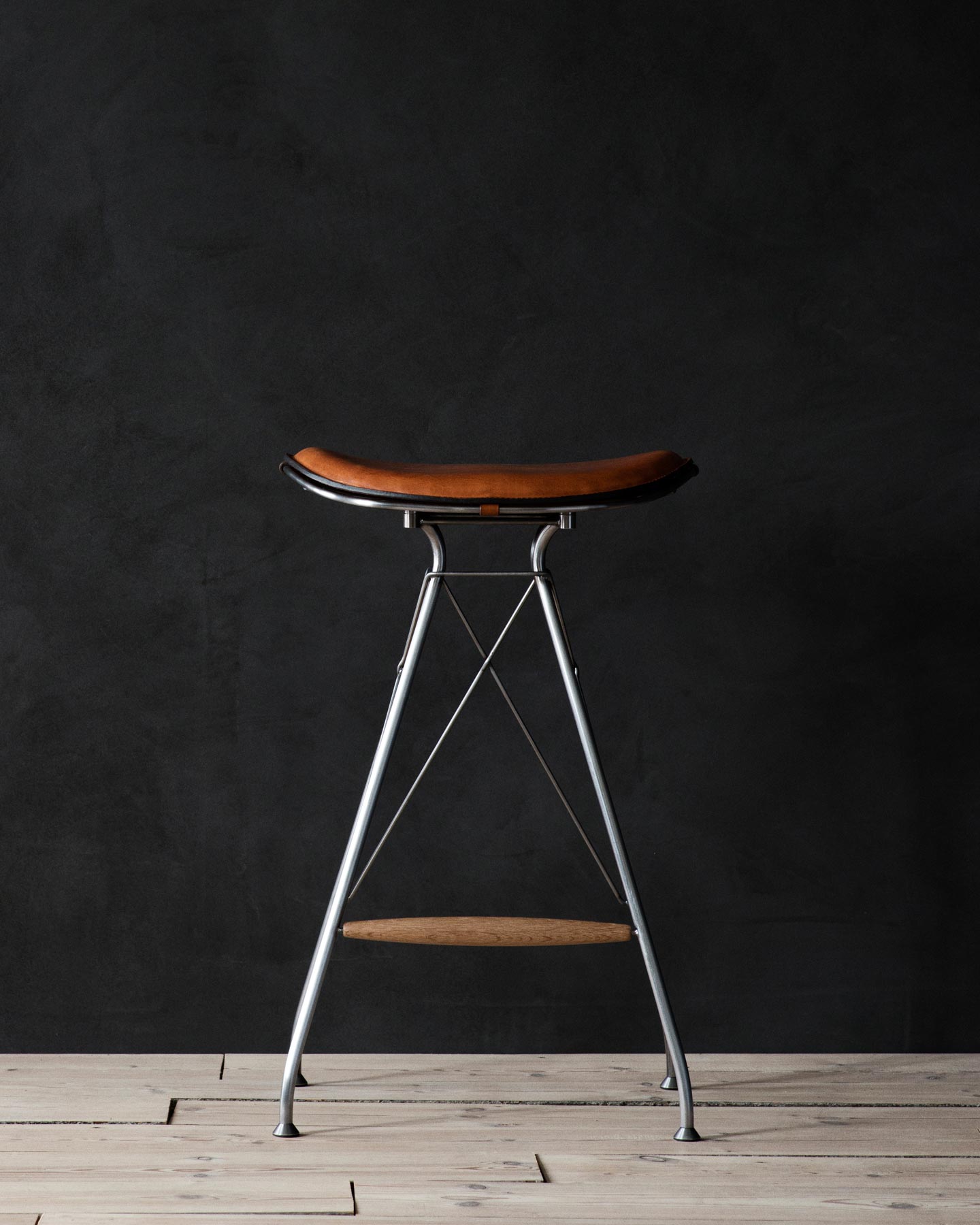 Part of the Wire Collection by Overgaard & Dyrman, the Wire Bar Stool is actually crafted from steel, wood, and full-grain leather. The design stands on four legs, each made of steel and finished with one’s choice of satin chrome plating or a matte black powder coat. Structured with crossed “wires” and a solid wood footrest, the stool is strong and architectural in appearance.