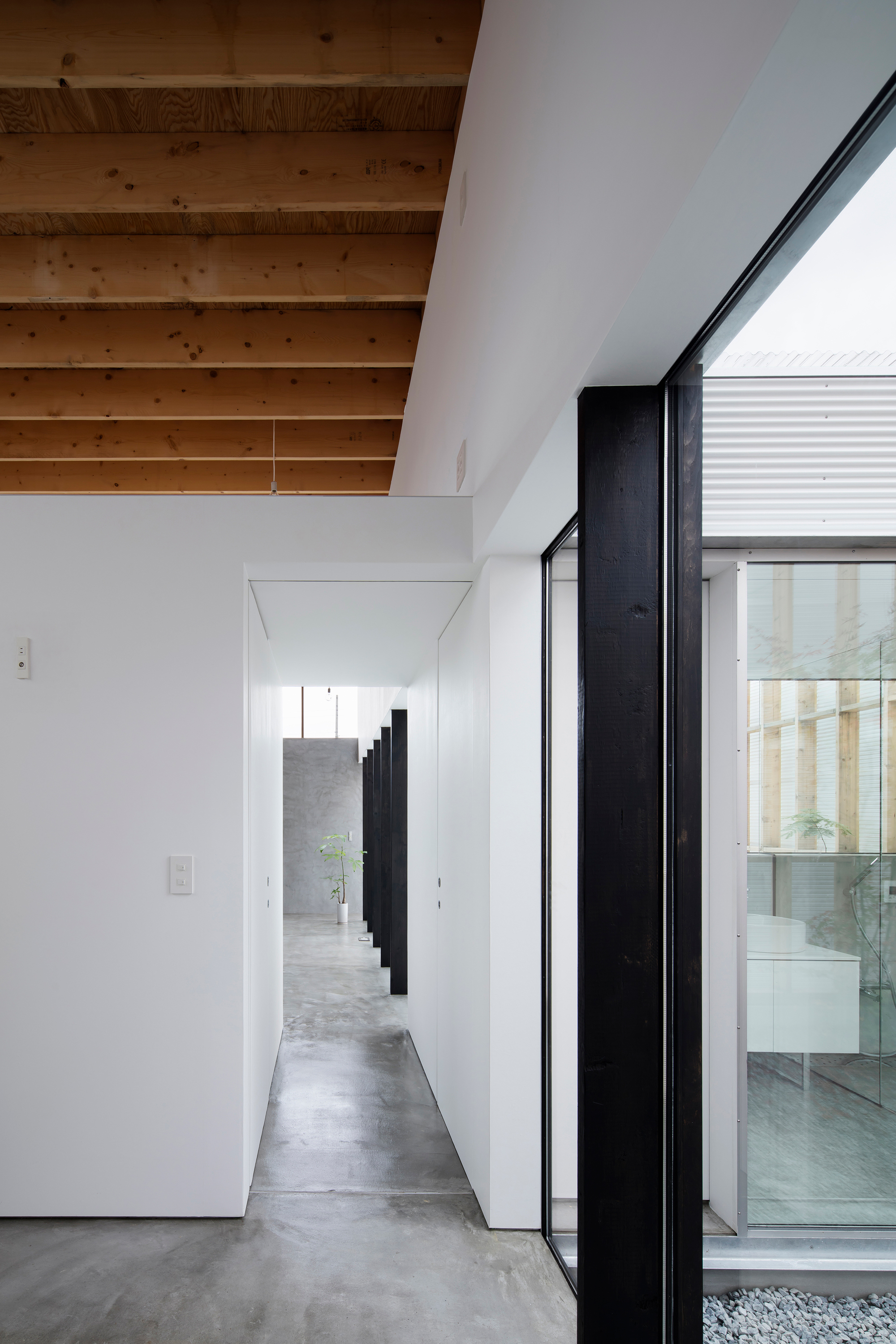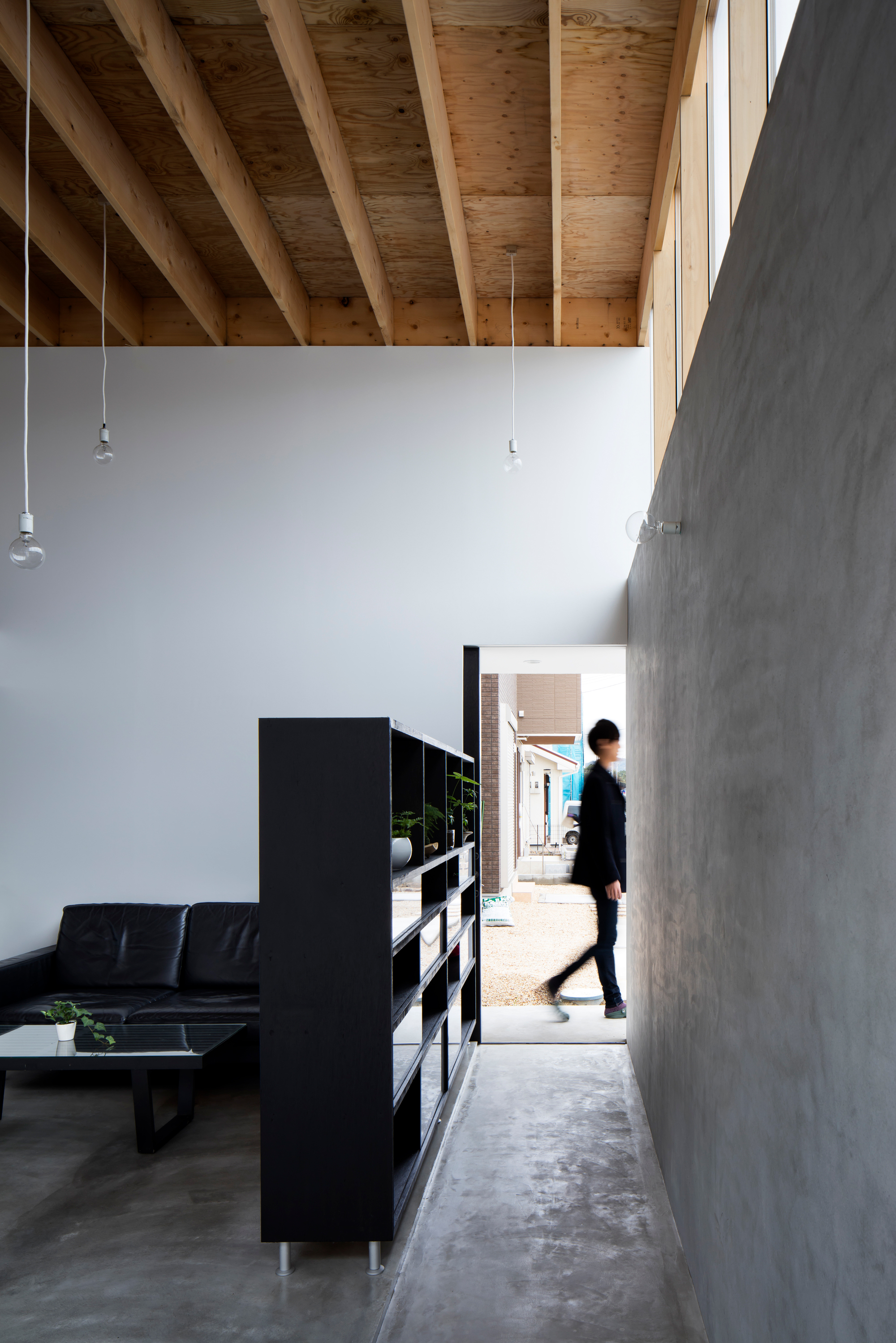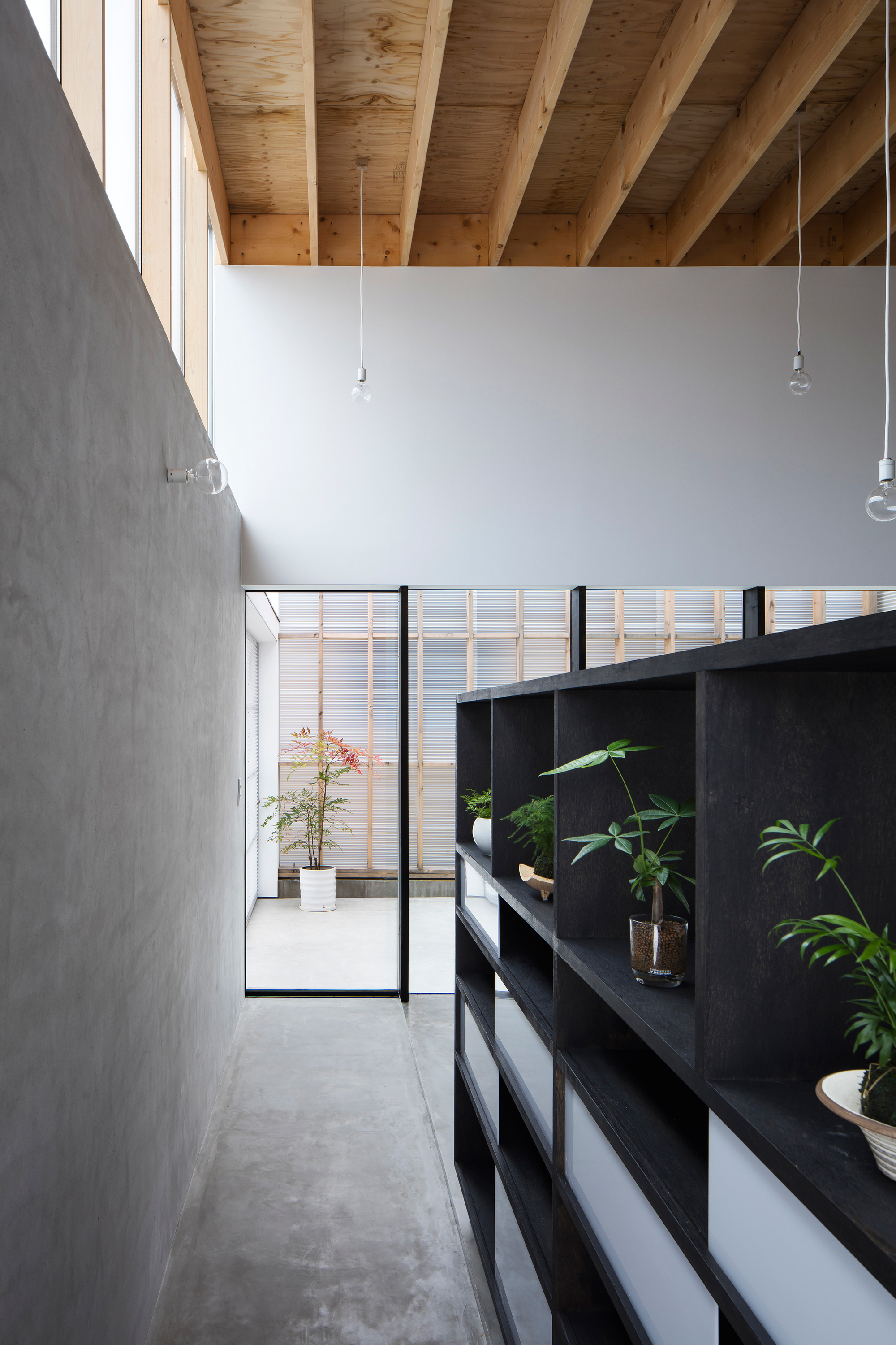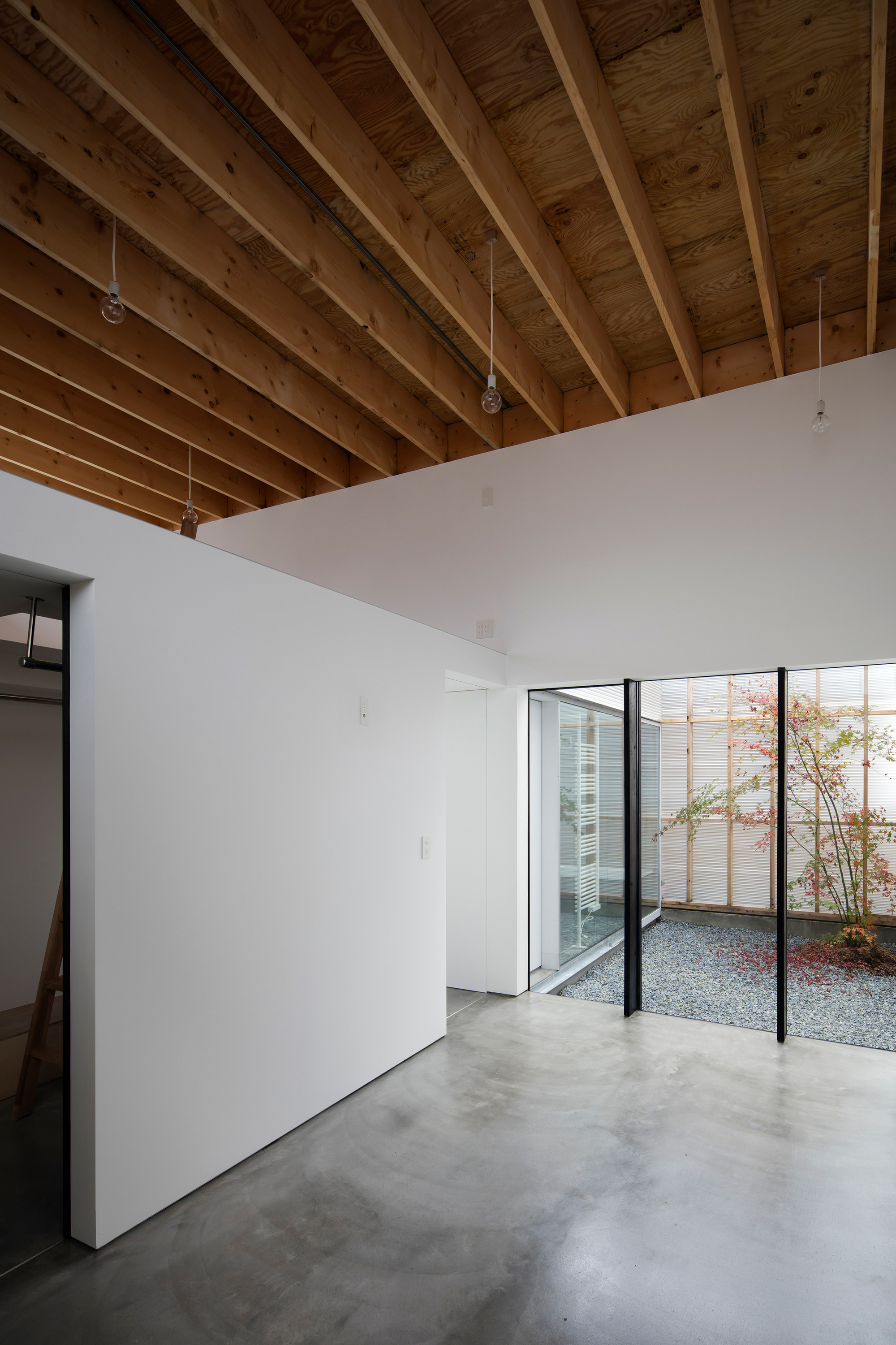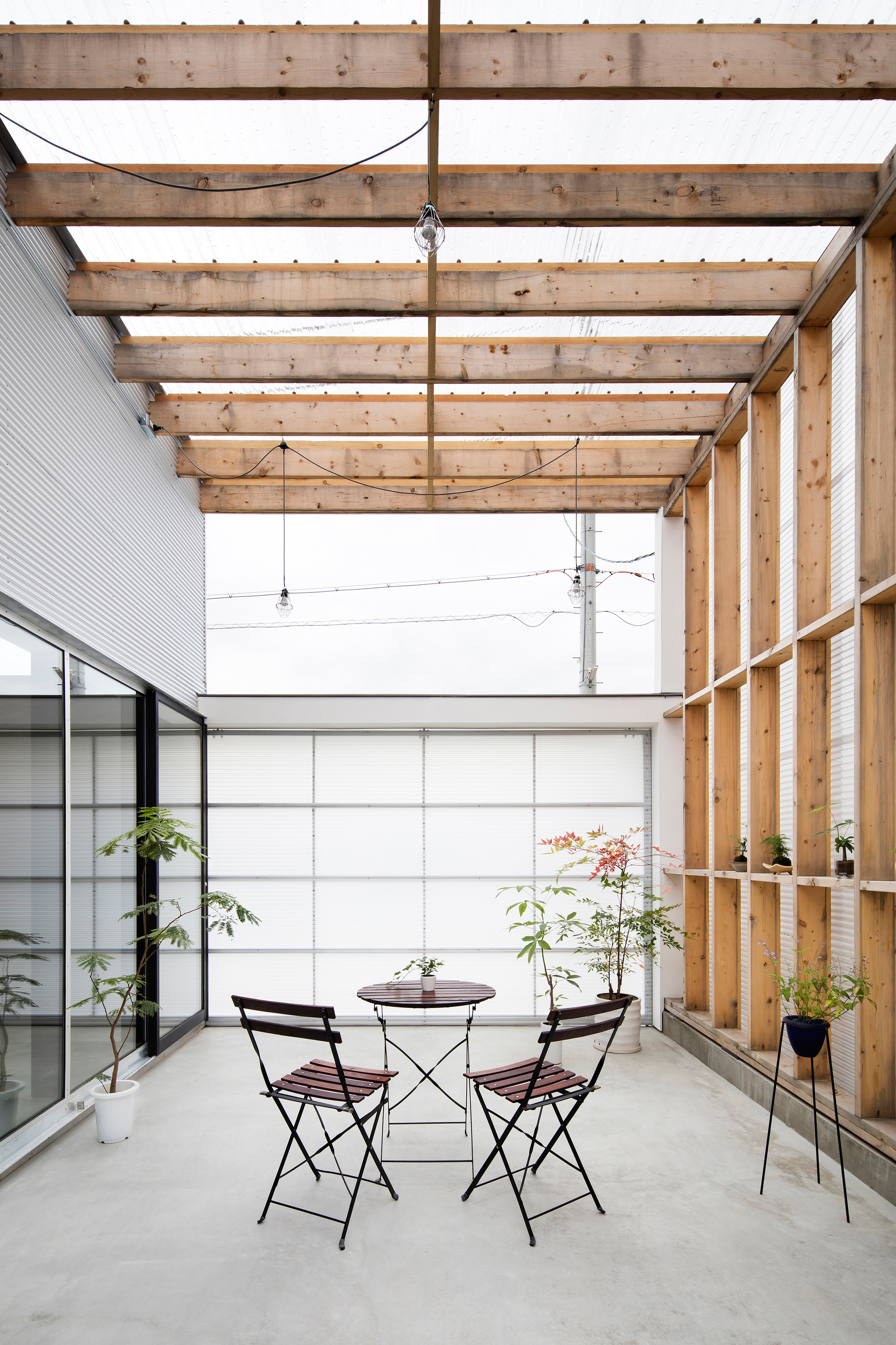 Located on a busy street in Kizugawa, Japan, this one-story house solves the issue of privacy in an ingenious way. Yoshi Architects designed this modern Japanese home with an interior courtyard the clients can use either as a garage or as a semi-outdoor living space. The surrounding houses all have their parking spaces in the front of the house; here, neighbors also organize picnics or barbecues on warm days. The clients, who are also car lovers, wanted something different for their home. The architecture firm thus designed the garage as an interior terrace and extension of the open-plan kitchen, dining area, and living room.