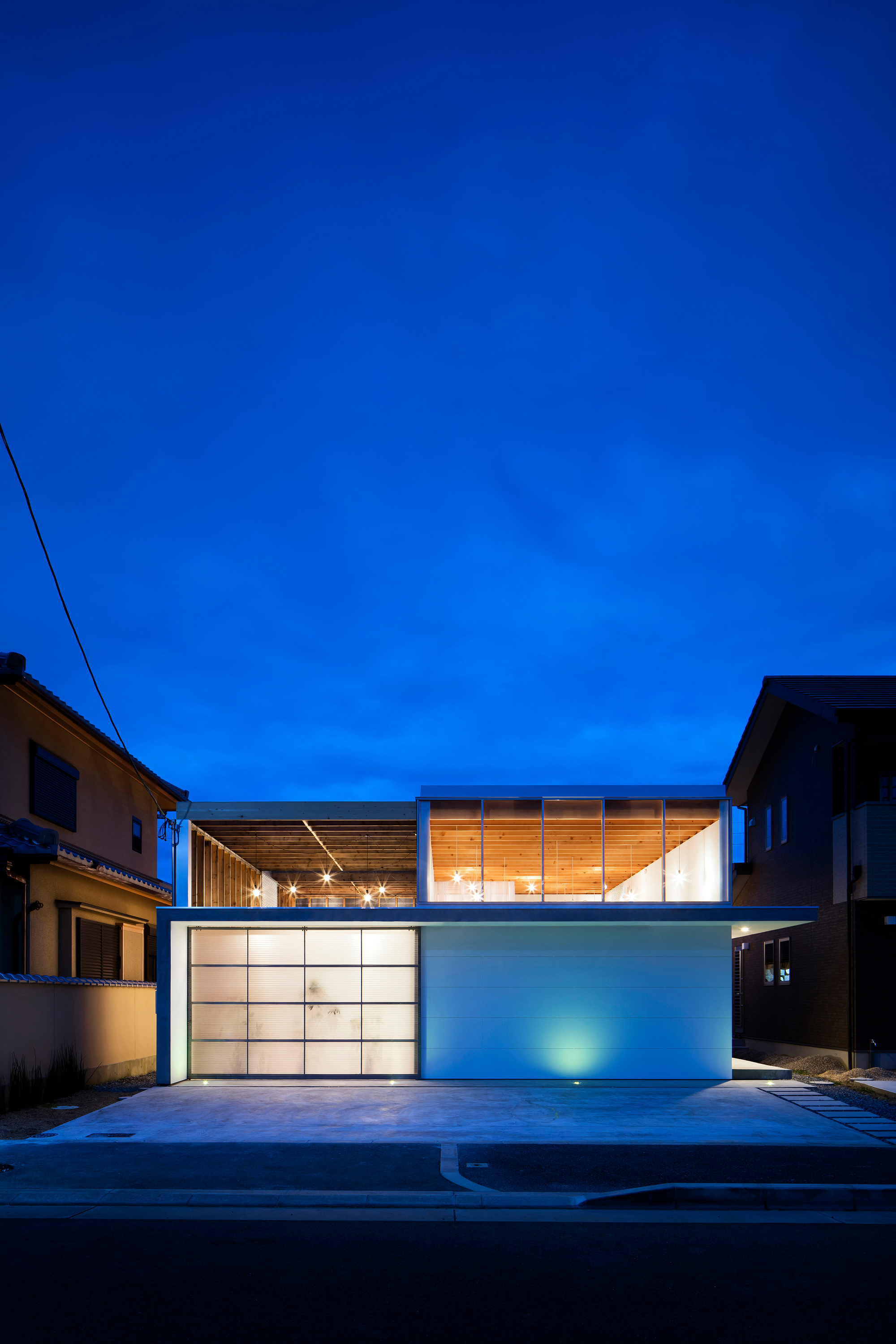 A Japanese house with an interior courtyard that doubles as garage and terrace.