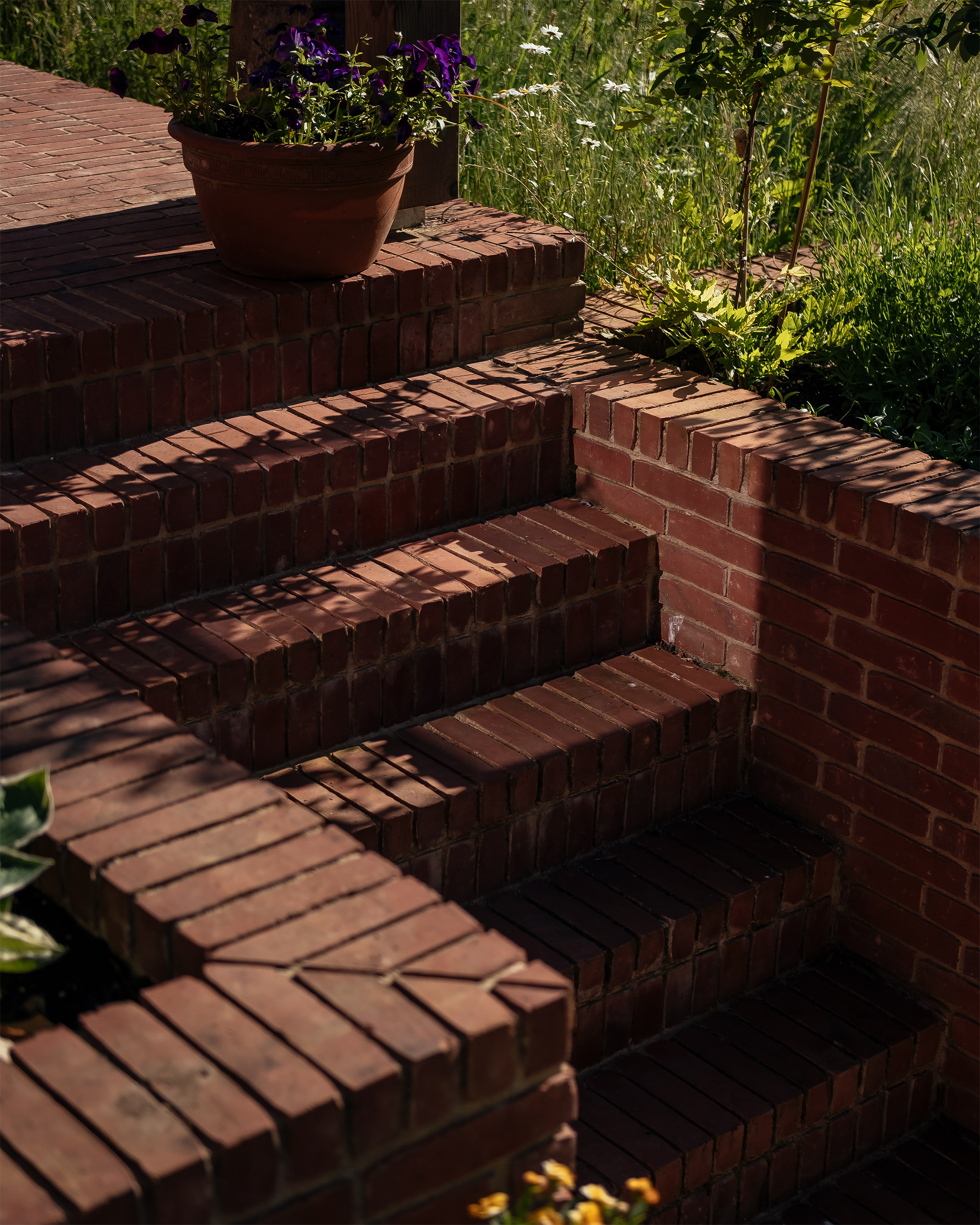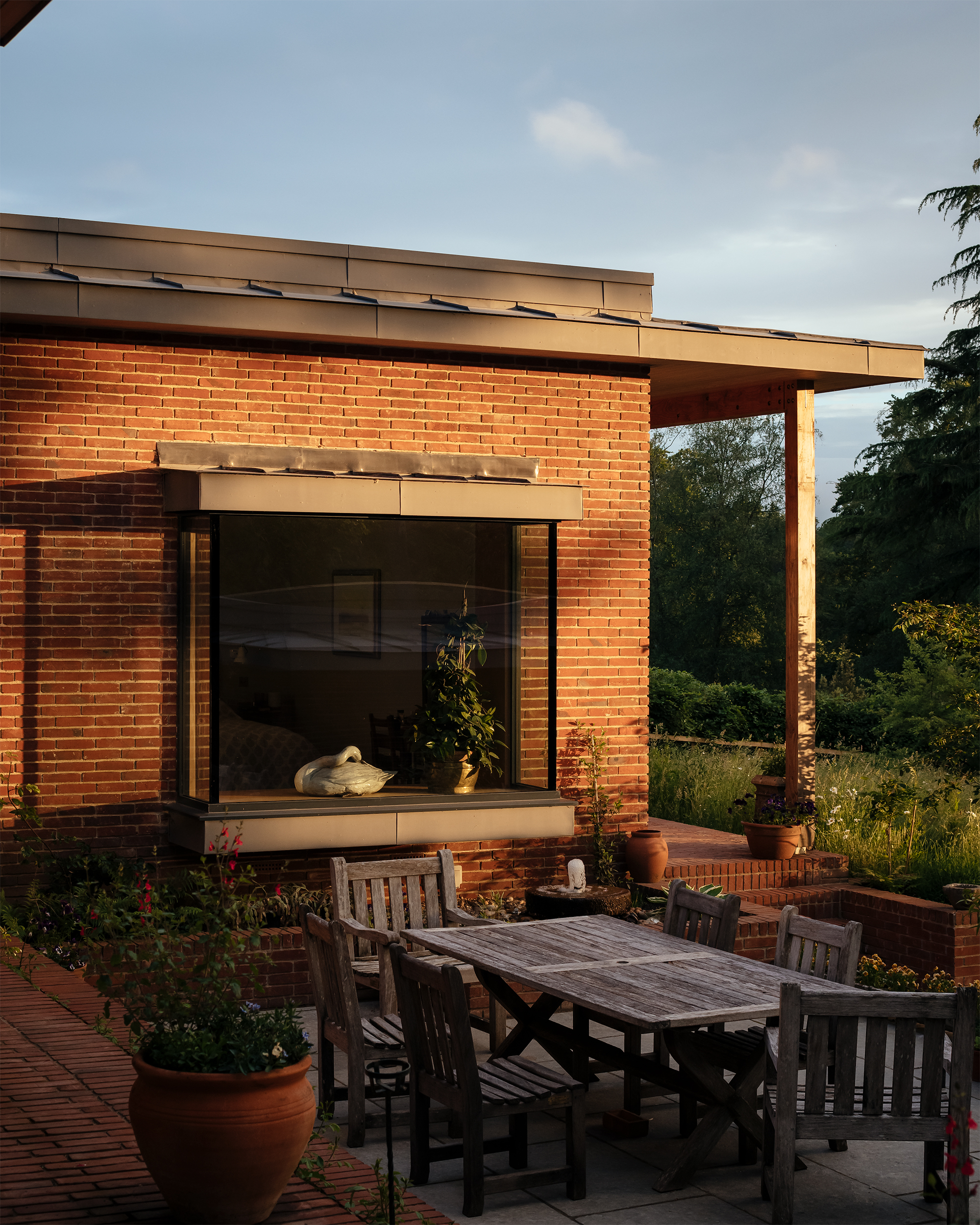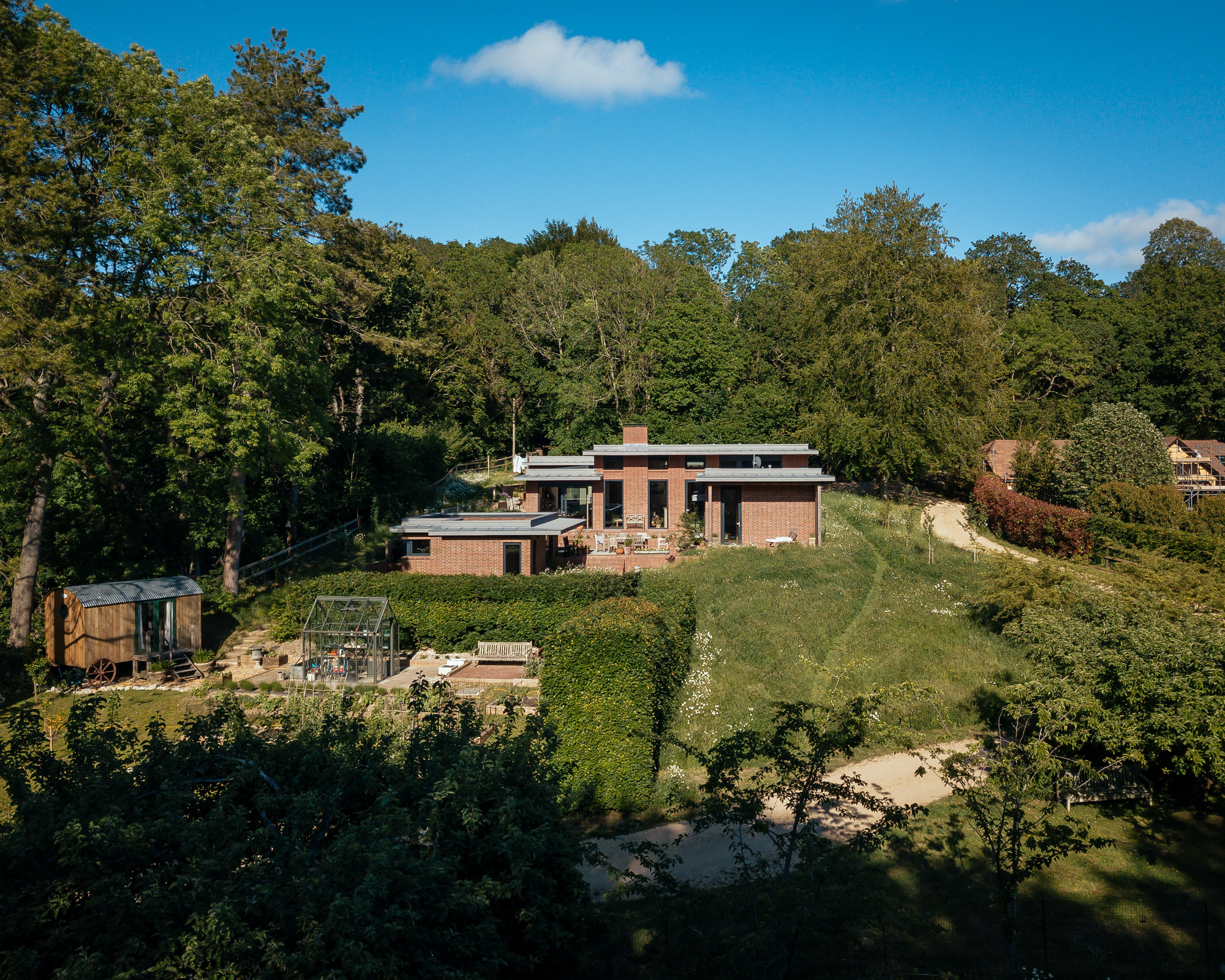 Built among mature trees and meadows in the sensitive New Forest National Park district in Hampshire, United Kingdom, Gardener’s Cottage is a one-of-a-kind, modern brick home. The clients, Graham and Charlotte Thompson, wanted to downsize from their current six-bedroom house and to live in a more eco-conscious, sustainable home. They tasked PAD studio with designing a new living space next door to their old house. The location is not only gorgeous, it’s also a place where a rich biodiversity thrives. The preservation of the natural site became a main focus for the clients. Constructed on a sloping site on the location of the old gardener’s cottage adjacent to their previous home, the new four-bedroom house follows the natural topography of the land.