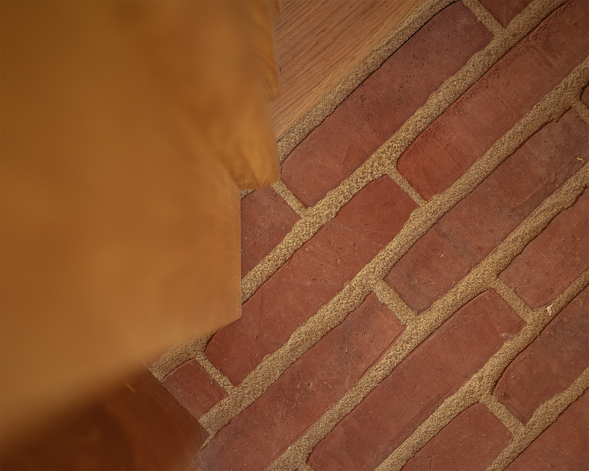 The architects designed the structure with red Vande Moortel brick walls in a nod to vernacular architecture; zinc roofs with a stepped design follow the slope of the site. As a result, the cottage has a warm appearance and almost seems to rise naturally from the grassy land. The clients wanted their home to have plenty of space and light as well as an intimate connection to nature. As it follows the angle of the slope, the house has a stepped design. Beyond the entrance, the two bedrooms, study, and main bathroom occupy a slightly lower level. The kitchen and main living space are also a step down from the rest of the house. As a result, the sunken living room and dining area flow naturally onto the terrace and the garden. An annex houses a guest suite to accommodate visiting family.