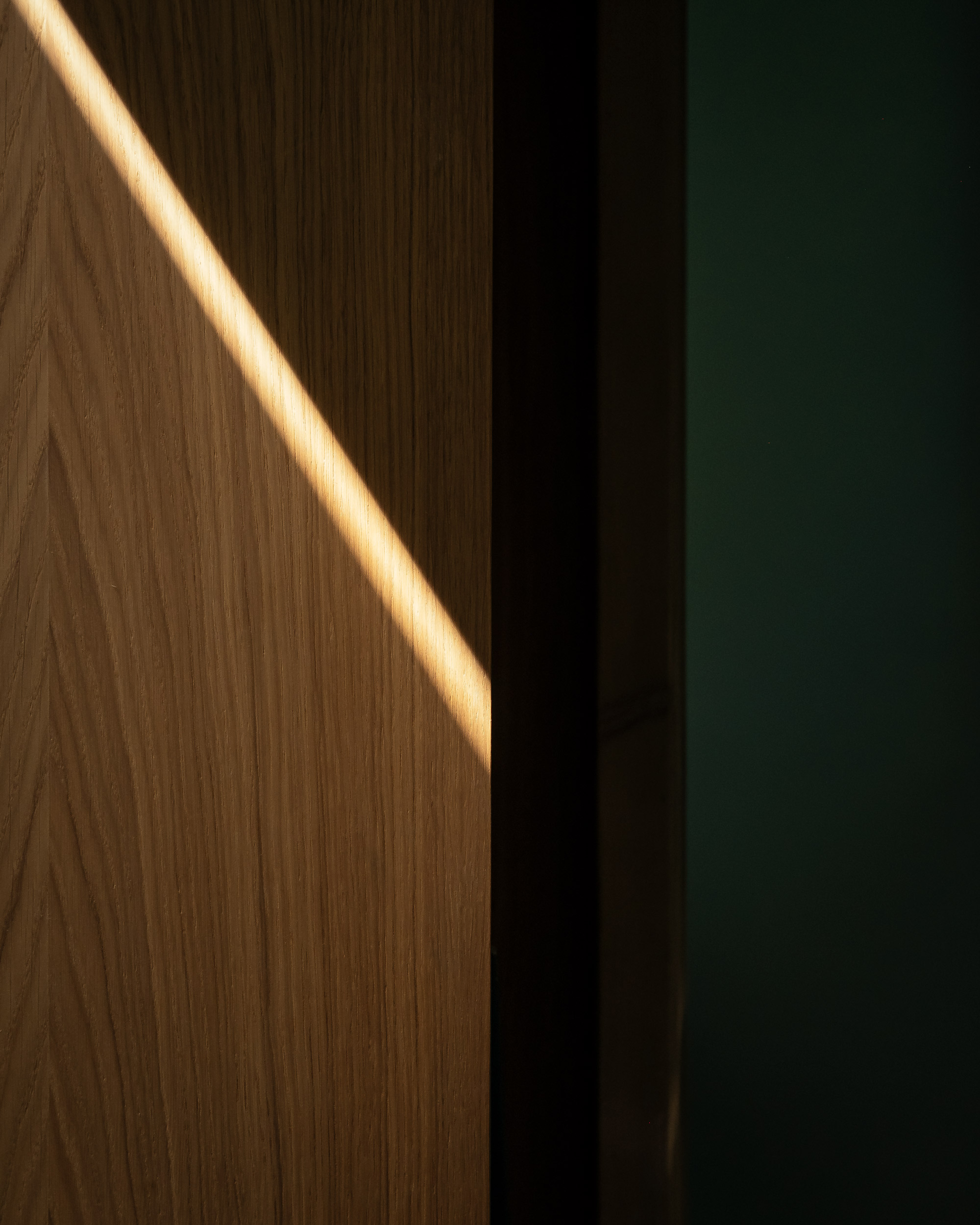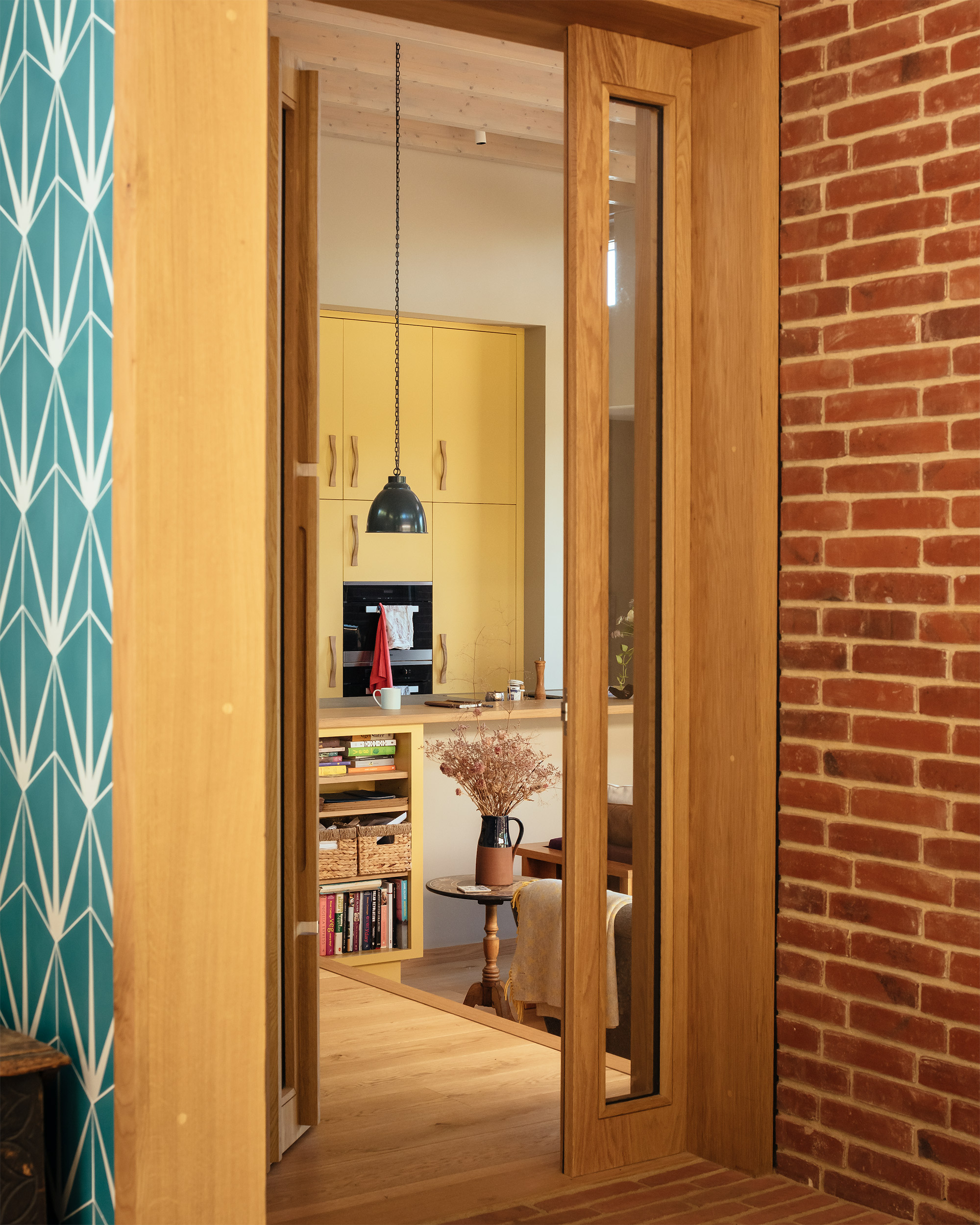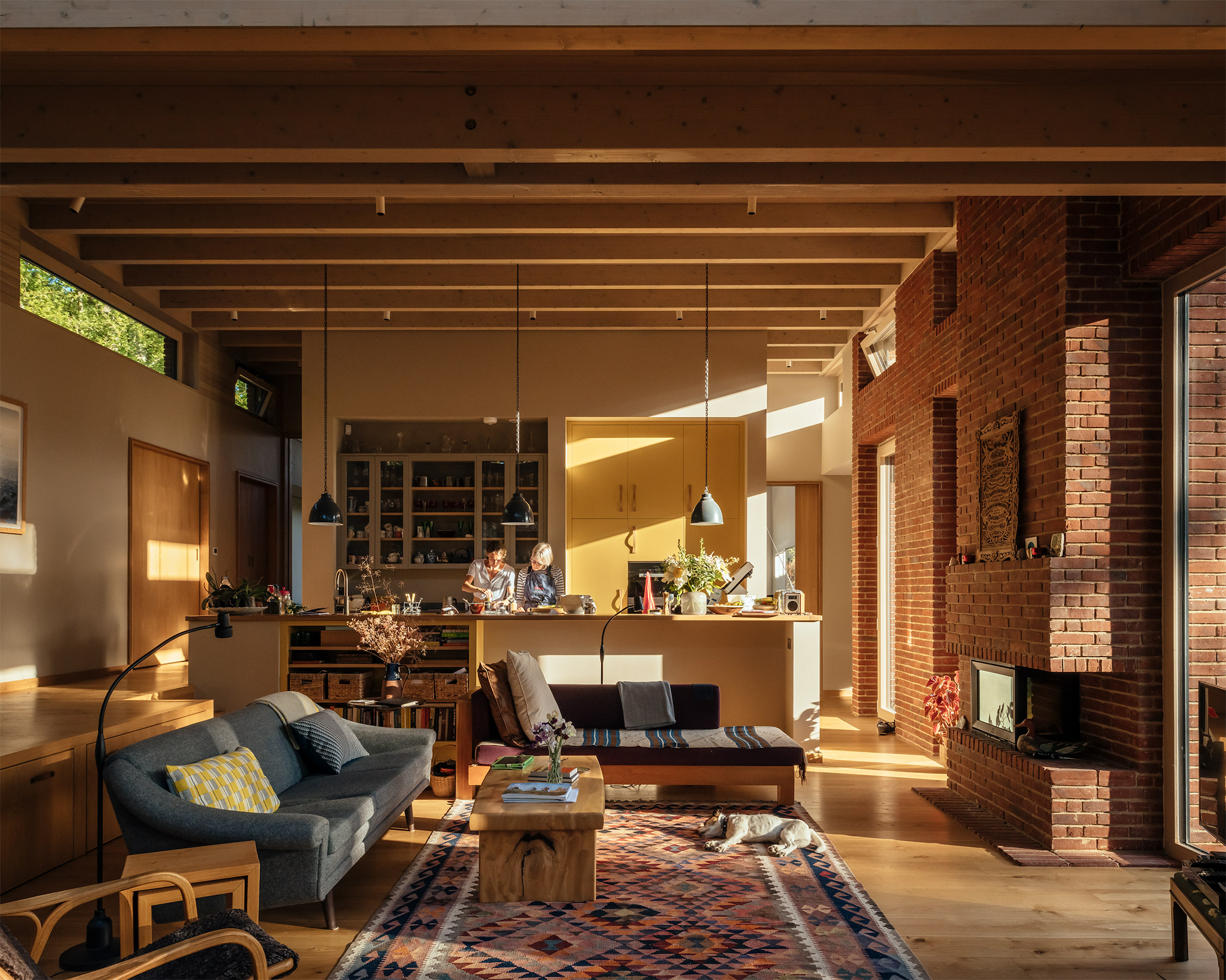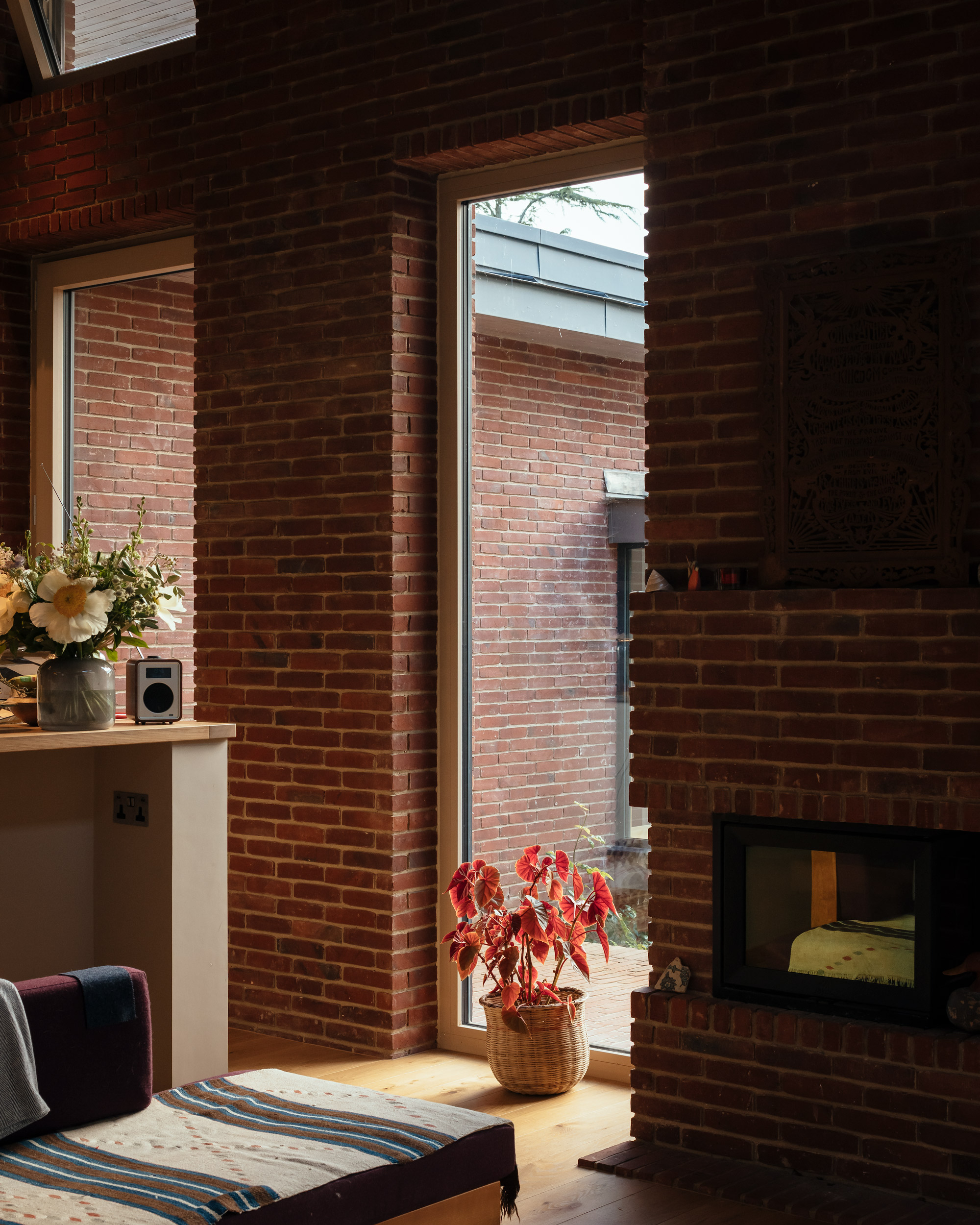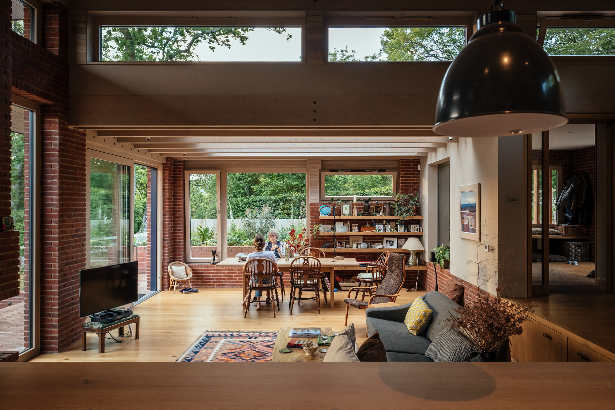 Inside the Gardener’s Cottage, the studio used a blend of natural, warm materials. Apart from exposed red brick walls, the interiors also feature oak paneling and locally crafted oak joinery along with exposed glulam ceiling beams. Clerestory windows frame the trees and the sky while flooding the living spaces with light and ensuring good cross ventilation. Every detail, both inside and outside, is testament to the clients’ dedication to eco-conscious living and to the studio’s sustainable approach to architecture.