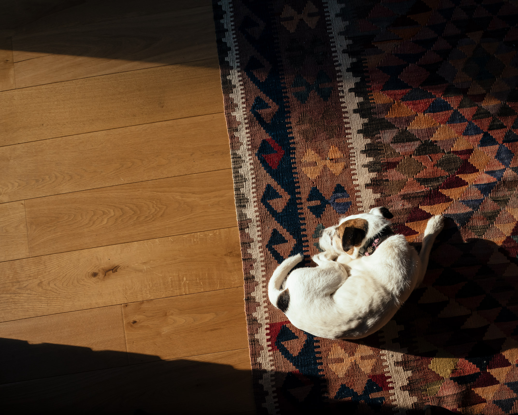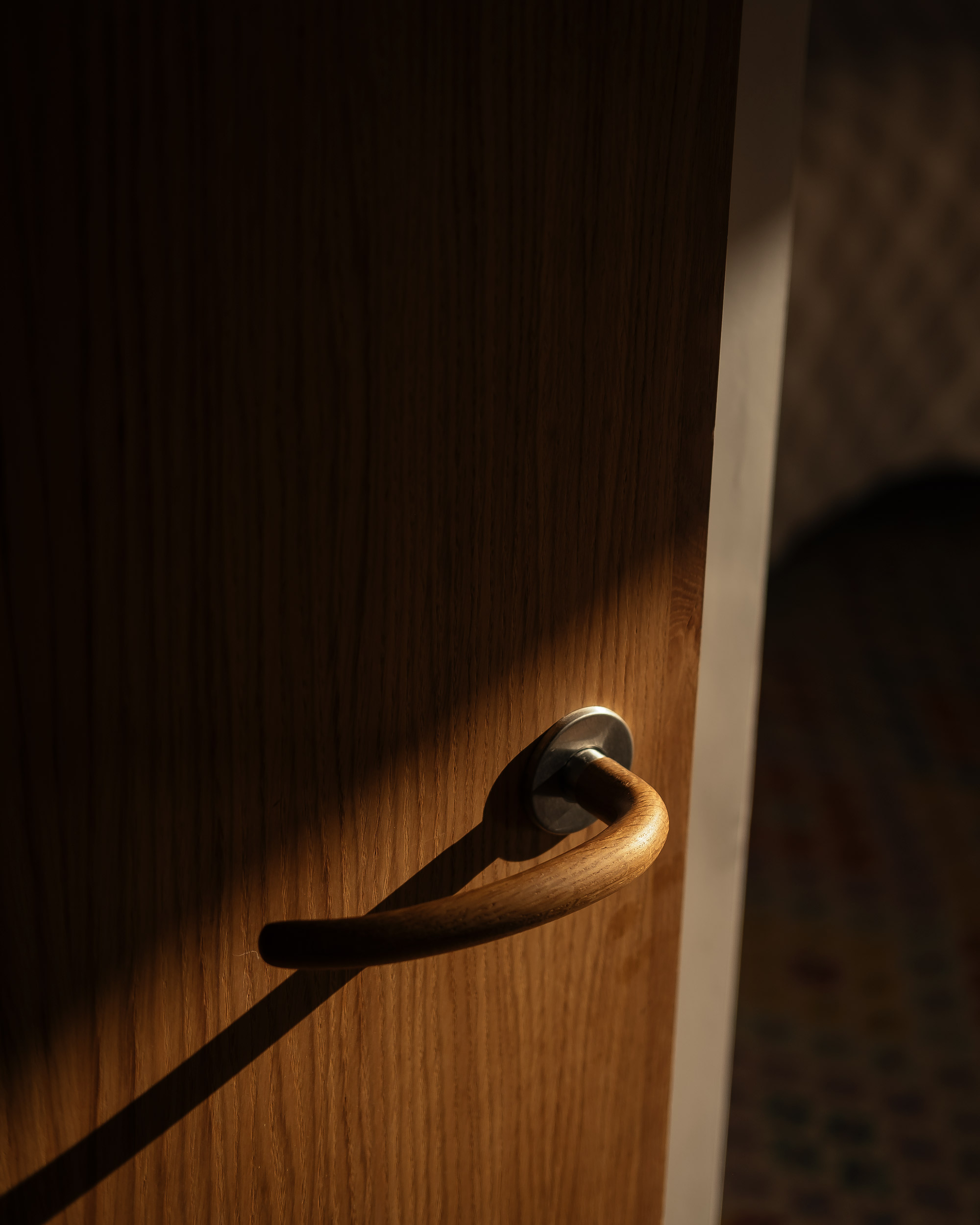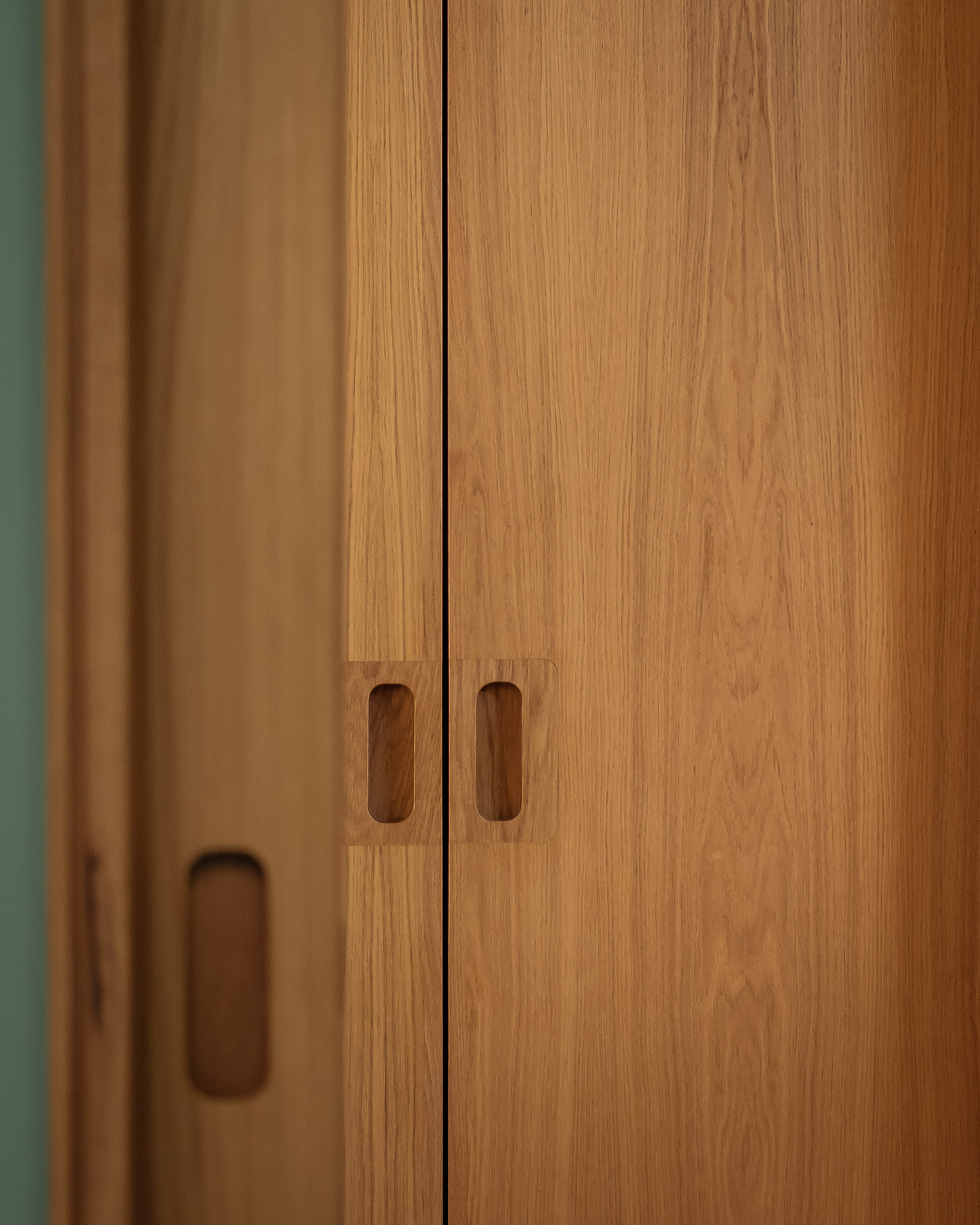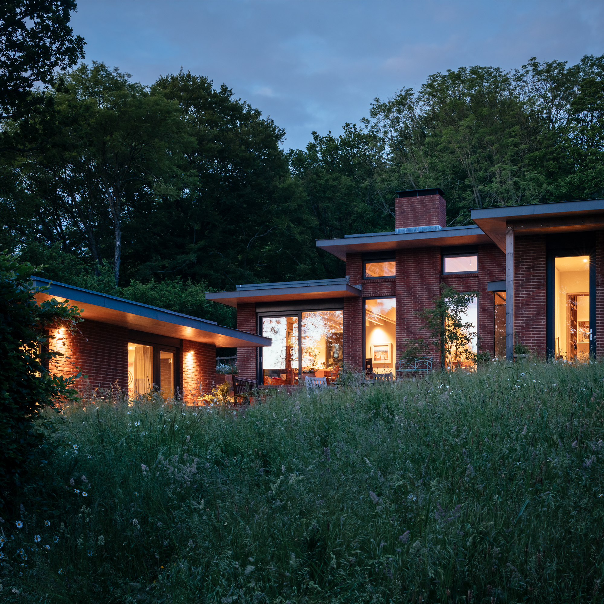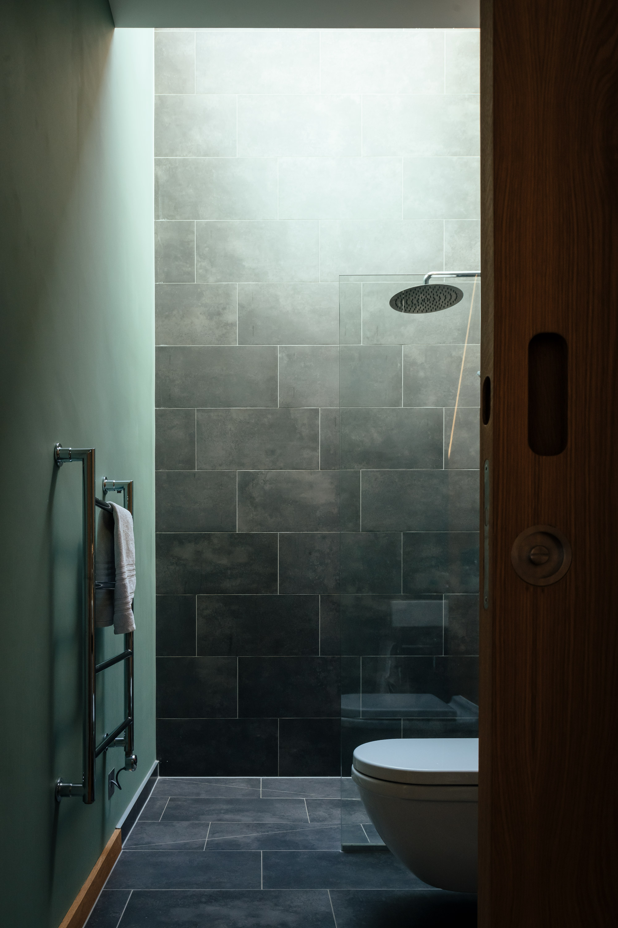 Inside the Gardener’s Cottage, the studio used a blend of natural, warm materials. Apart from exposed red brick walls, the interiors also feature oak paneling and locally crafted oak joinery along with exposed glulam ceiling beams. Clerestory windows frame the trees and the sky while flooding the living spaces with light and ensuring good cross ventilation. Every detail, both inside and outside, is testament to the clients’ dedication to eco-conscious living and to the studio’s sustainable approach to architecture.
