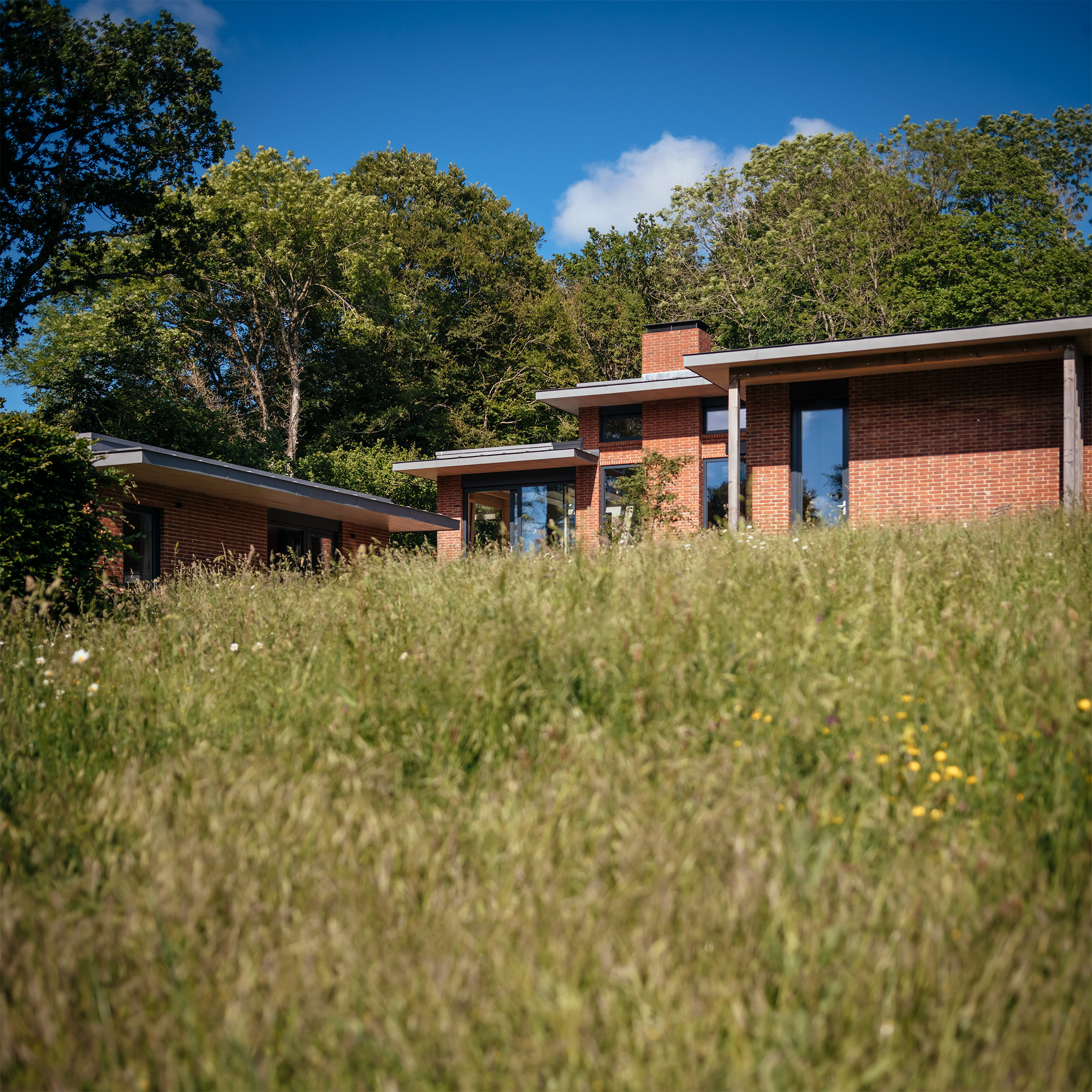 A red brick house nestled among trees and meadows in a national park area in the UK.