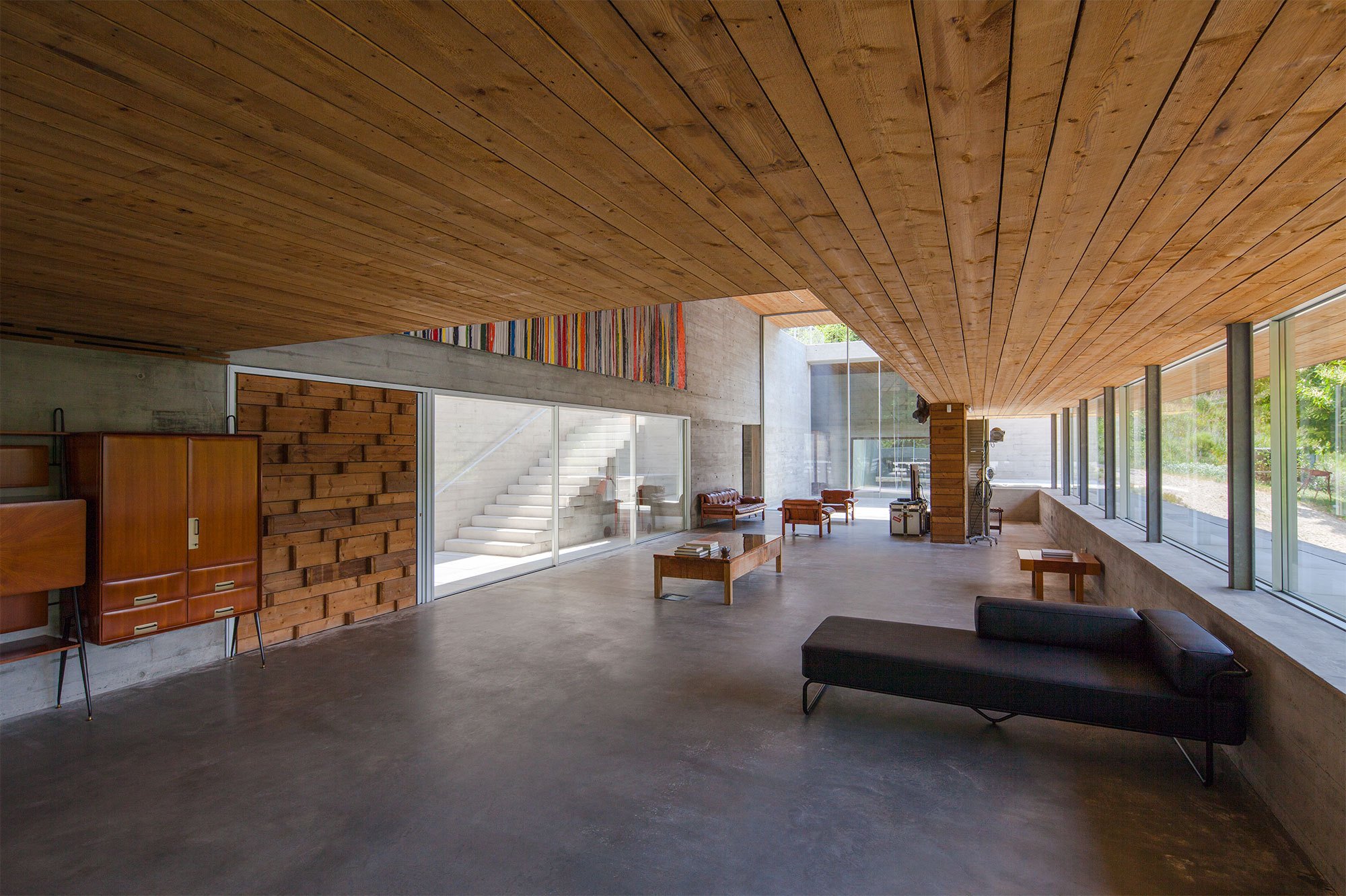 Unlike traditional Brutalism, the concrete is finished rather simply with no undulating ornamentation, letting it sit more naturally in its surroundings like a large boulder. This feeling is further amplified by the utilization of similarly finished concrete in carefully placed moments down the slope, leading to a leisurely swimming hole. This turns the project from a simple building to a well-sited piece of architecture, as the entirety of the property plays a role in how the home relates to its landscape. The concrete acts as natural stone, the wood as flora and even the glass could be said to mimic the reflective bodies of water that trickle into a stream down alongside the architecture. Walking through the home itself, one is lost in a range of spaces, each influenced by the ratio of wood to concrete. Rooms that have a fully wooden finish offer a warmer, cozier air (thanks as well to lower ceiling heights), while rooms with more concrete lavish you with their imposing volume and high ceilings. The ratio of glass then builds upon this, letting light pour into each room as needed. The relationship of the Gerês House to its environment is a rousing triumph, and is so successful because of the way the architects brought the essence of this bond into the DNA of the building itself; making the architect a lovely microcosm of the materials and spacing of nature. Images courtesy of Carvalho Araújo.