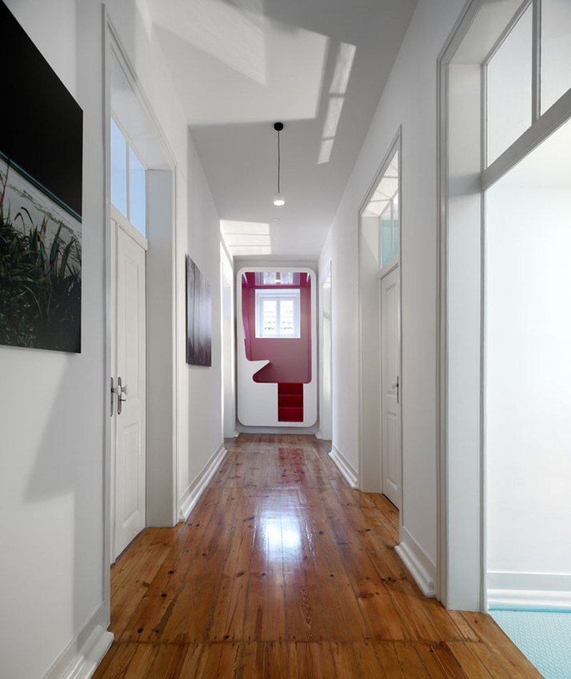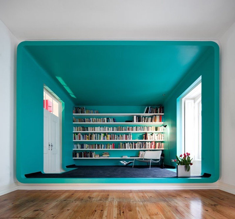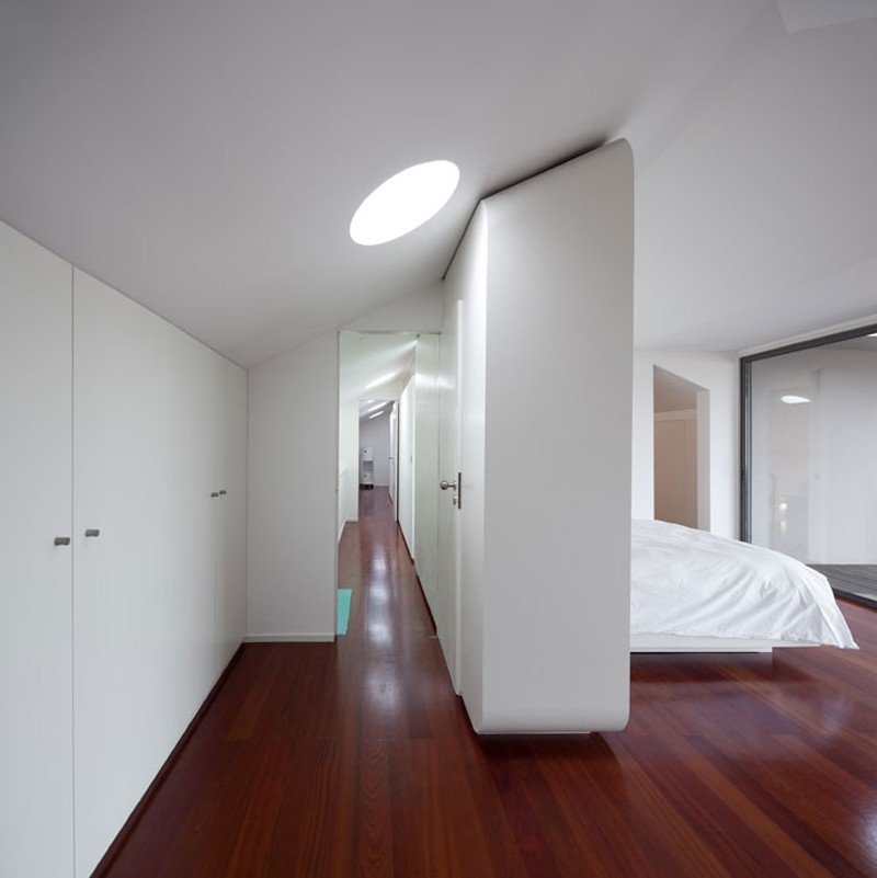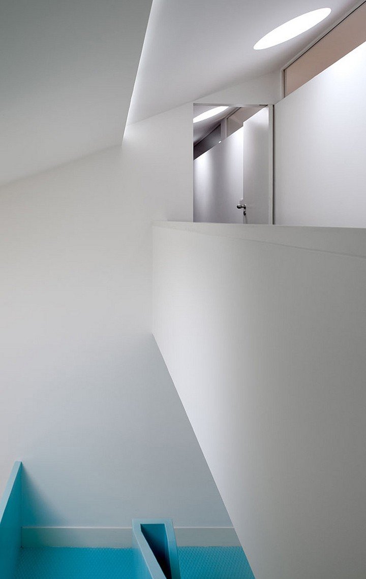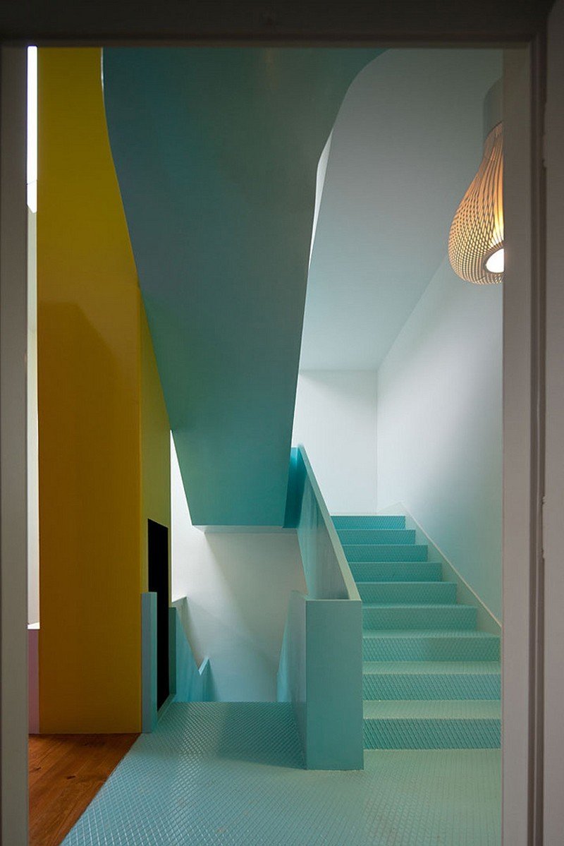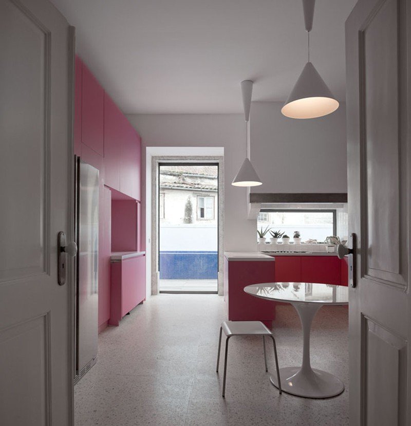 Upon first step into GMG House, the eyes are drawn to vivid, nearly-fluorescent bursts of color. Pedro Gadanho, the designer of this funhouse, uses color to highlight certain elements, treating the white canvas of the house as a medium for an artistic rendition of the interiors. A light cyan staircase sidles up against a bright yellow wall, and a fire engine red cutout forms a window seat on the second floor of the house. Pink and lemongrass cabinets are carved as nuanced shapes, and each of these lacquered elements in the Portuguese residence effuse a natural glow under any artificial or natural light. The clean, modern design of the house interiors are livened by the variegated hues as Gadanho finds the courage to go where most architects dare not: color. Photography Fernando Guerra | FG+SG