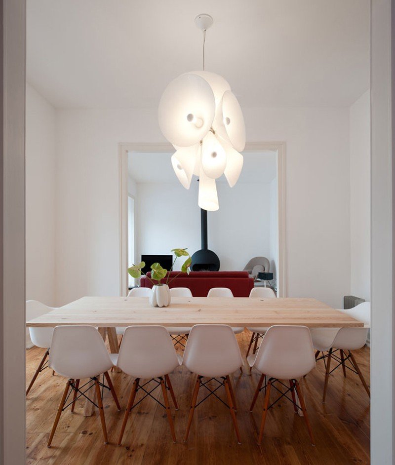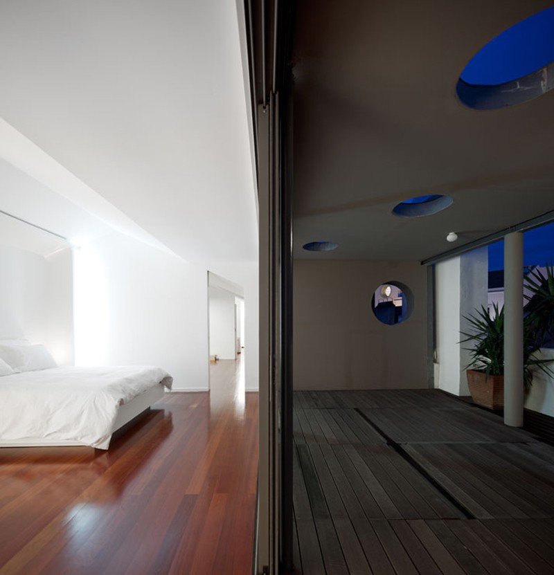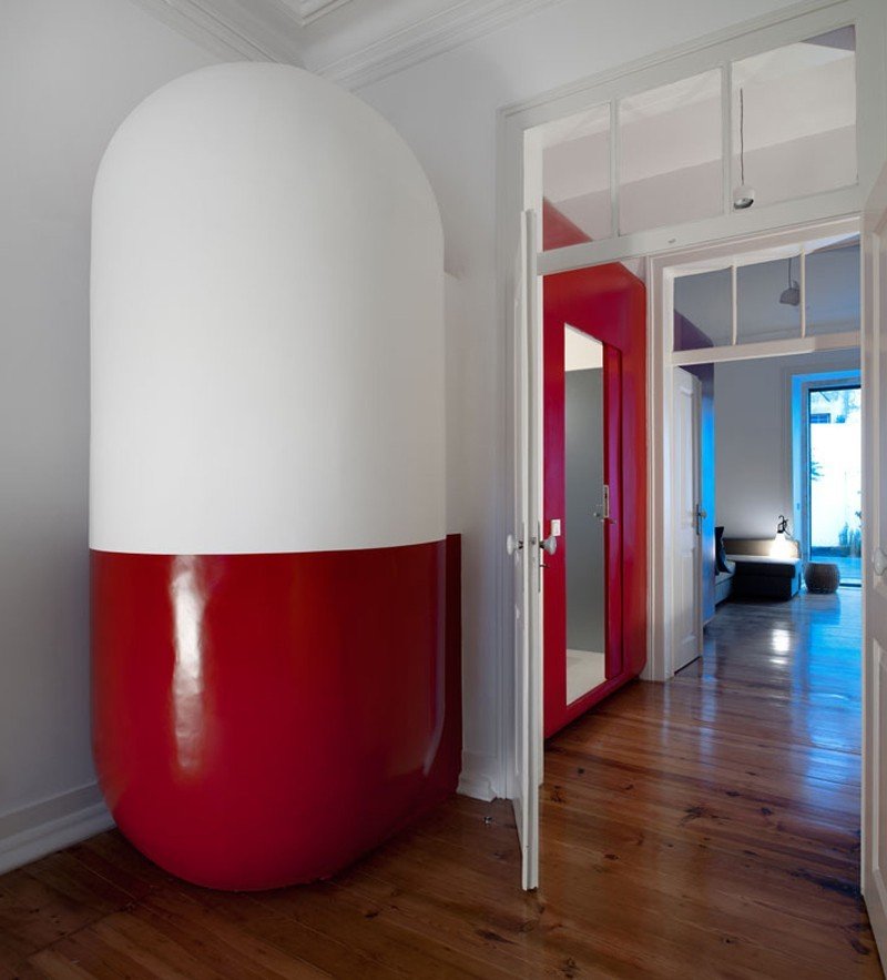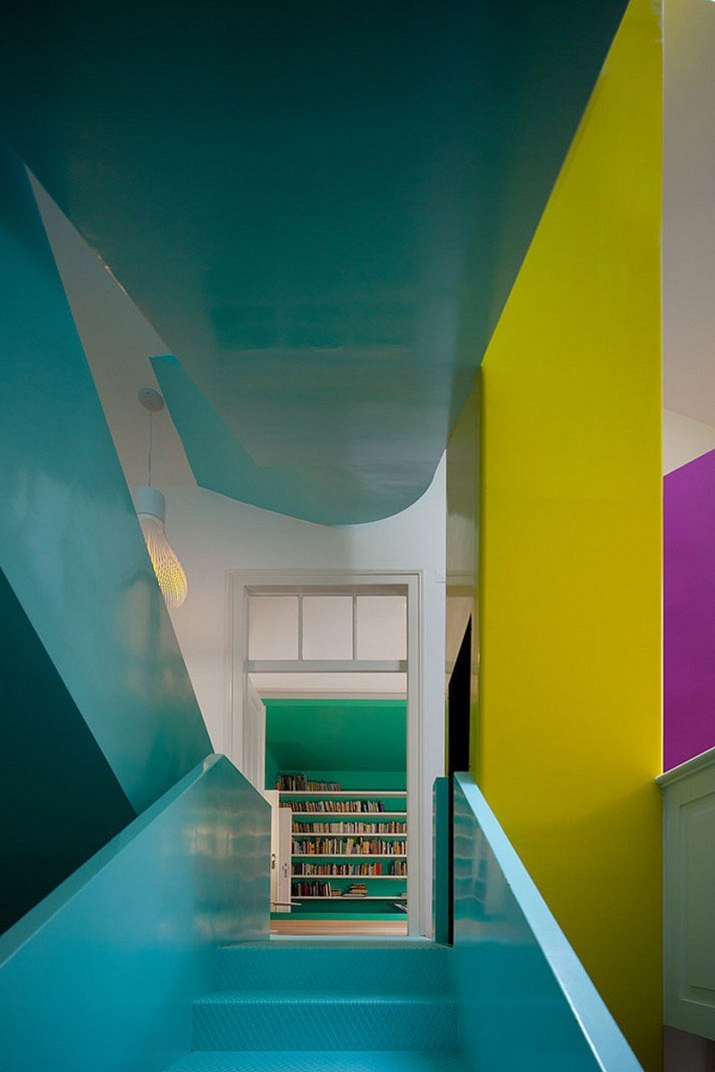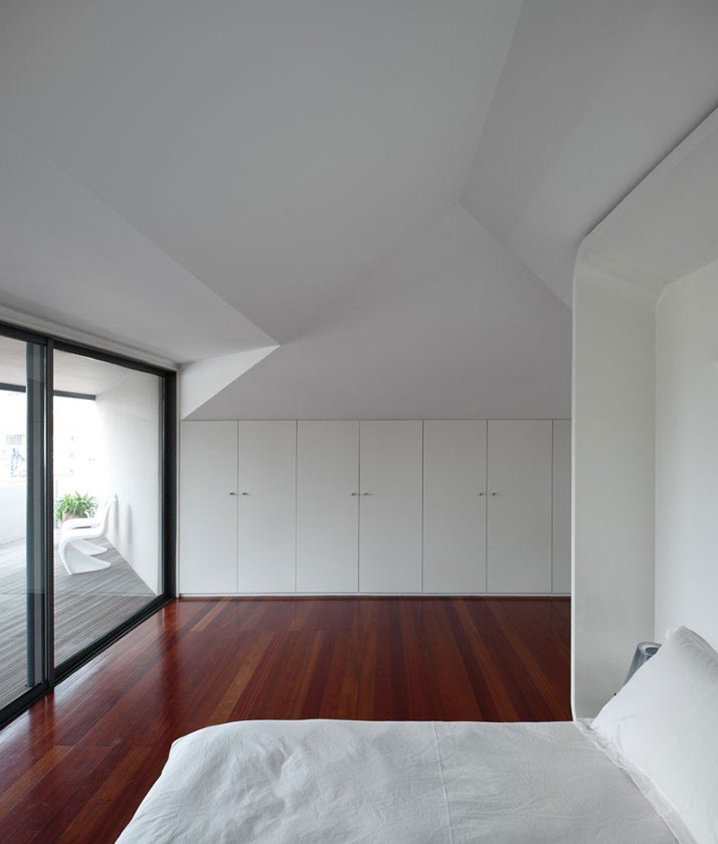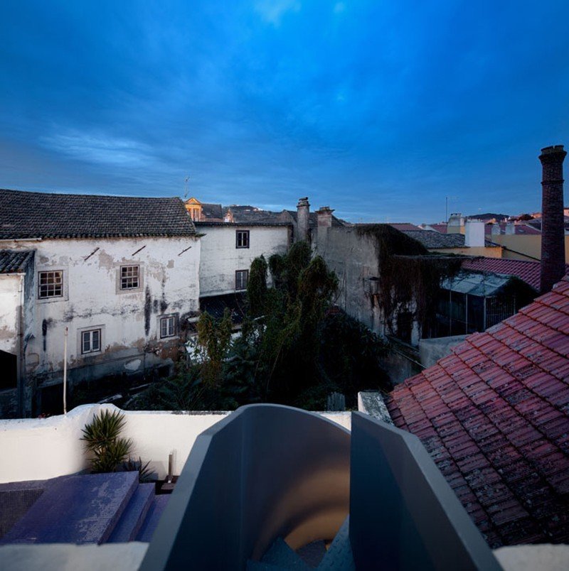 Upon first step into GMG House, the eyes are drawn to vivid, nearly-fluorescent bursts of color. Pedro Gadanho, the designer of this funhouse, uses color to highlight certain elements, treating the white canvas of the house as a medium for an artistic rendition of the interiors. A light cyan staircase sidles up against a bright yellow wall, and a fire engine red cutout forms a window seat on the second floor of the house. Pink and lemongrass cabinets are carved as nuanced shapes, and each of these lacquered elements in the Portuguese residence effuse a natural glow under any artificial or natural light. The clean, modern design of the house interiors are livened by the variegated hues as Gadanho finds the courage to go where most architects dare not: color. Photography Fernando Guerra | FG+SG