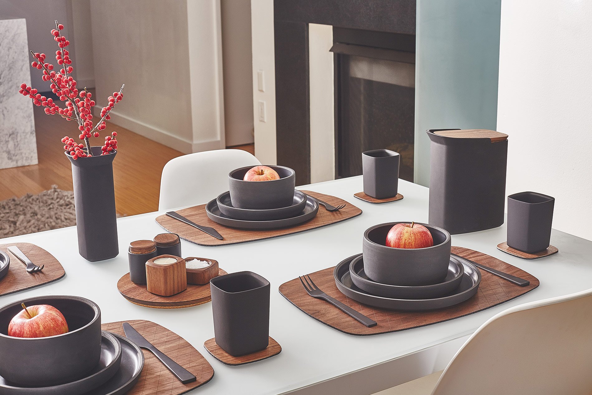 “Eat, drink, and be merry” – usually the first things that come to mind when thinking about sharing a meal with friends and family. What we don’t usually consider is the design of our table; the plates we eat from, the glasses we drink from, the vases we pour from. Or as Grovemade industrial designer Kevin Do puts it, “the tabletop is a vehicle to enjoyment.” With their new collection of tableware, Grovemade has accomplished just this. The Portland, OR based domestic design studio has recently published their new collection of tableware, and it is sure to please all palates. The collection, a range of ceramic dishware, cork trivets, and wooden placemats, considered the materiality of the objects first in their minimally elegant design. Such considerations are presented in perfectly weighted porcelain dishware with a comfortably chamfered rim, reversible cork/wood trivets adaptable for a variety of hot and cold surfaces, and laser-etched placemats that present each meal. More items that round out the collection include salt and pepper shakers, pitchers, and vases. All products are made in-house, with the same attention to craft and detail as in their design.
