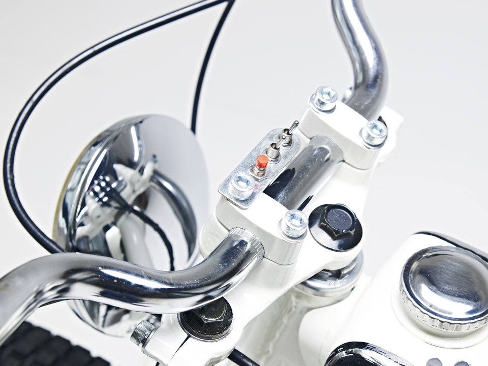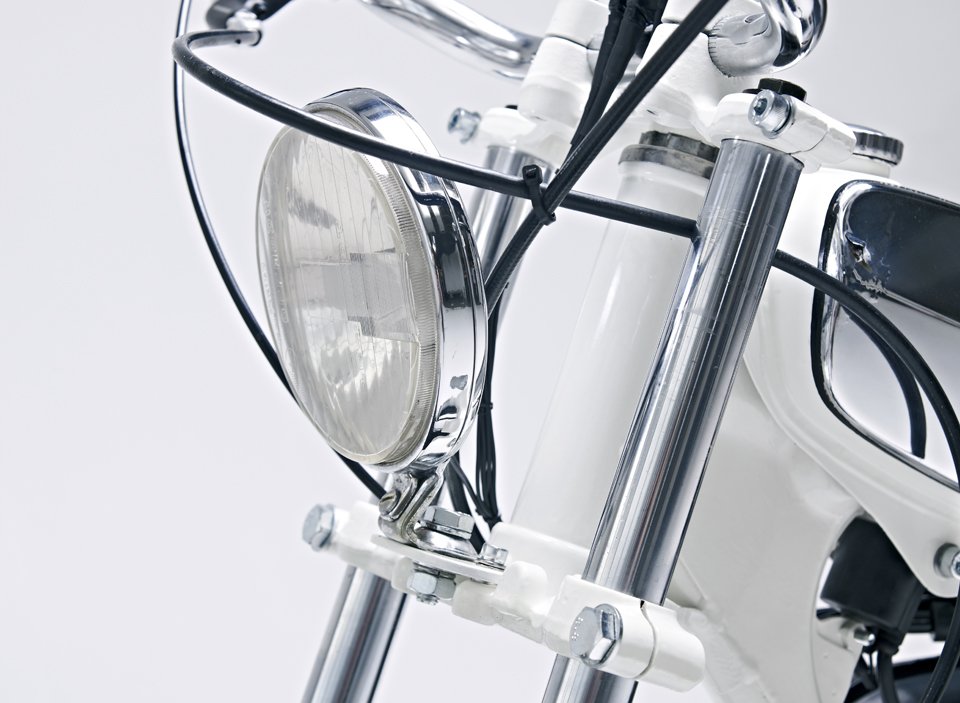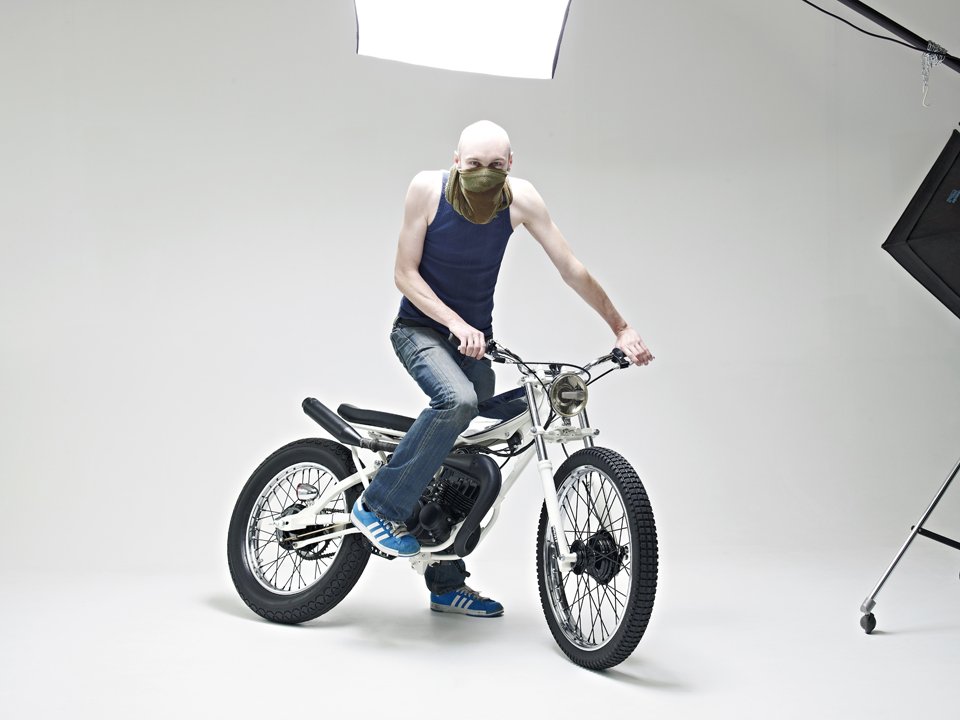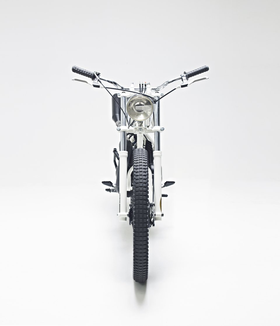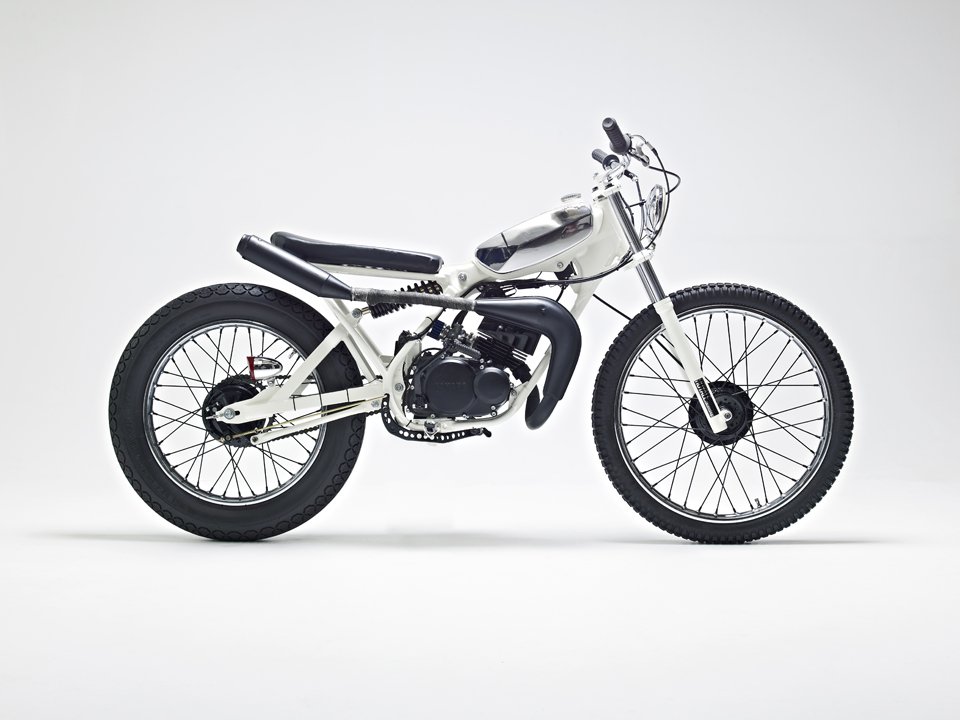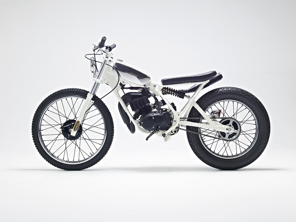A custom Yamaha DT50MX cleaned up nicely by the work of Håkan Persson calling it Cocaine White since it’s fast and white. You know the saying it takes a village to raise a child, well in the course of this bike’s makeover it was a bit of this and a bit of that from here and there that came together to make the sleek finished product. The headlight was salvaged from his dad’s retired Fiat 125; the seat reconstruction started with half of a broken skateboard he had on hand that mum upholstered; got ahold of the back tire and handlebars from old friend; the petrol tank is from a ‘Crescent 1209′, and the go is from a 50cc engine with 5,5hk. Håkan lives for these side bike projects, “At daytime I’m running a design agency called ‘Kollor Design Agency’ here in Sweden and on my spare time I build and restore Italian sports cars, mainly Alfa Romeo’s . This is my second attempt to build a bike. I’ve actually not been in contact with bikes at all before but a friend of mine kind of pushed me into trying one of his. After my first project which was a modified ‘Ciao Bravo’ I got hooked.”