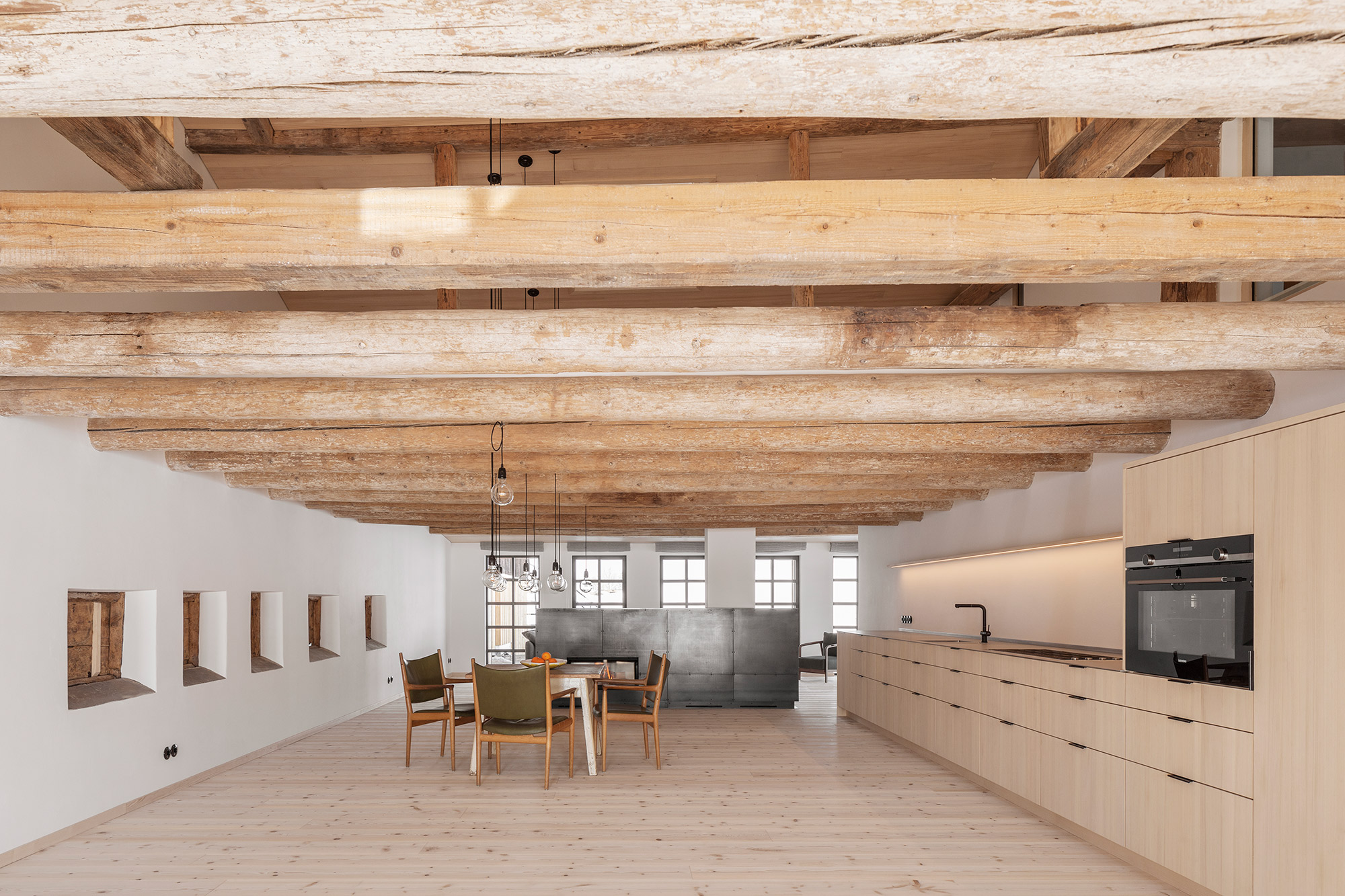 Situated in Görisried, Germany, Haus Roth perfectly represents the vernacular architectural style of the mountainous Allgäu region. Left abandoned, the old farmhouse was in a state of advanced disrepair and in danger of being demolished when the client approached architecture firm Hafner Bau. The studio renovated the dilapidated building, preserving as much as possible from its envelope, and also restored the historic courtyard. As for the interiors, the team created modern living spaces that celebrate the building’s past. The studio collaborated closely with the client, the team of builders, and local craftspeople to complete the complex project. The renovated property seamlessly blends both local history and contemporary design. Apart from the main dwelling, the architects also restored the adjacent barn.