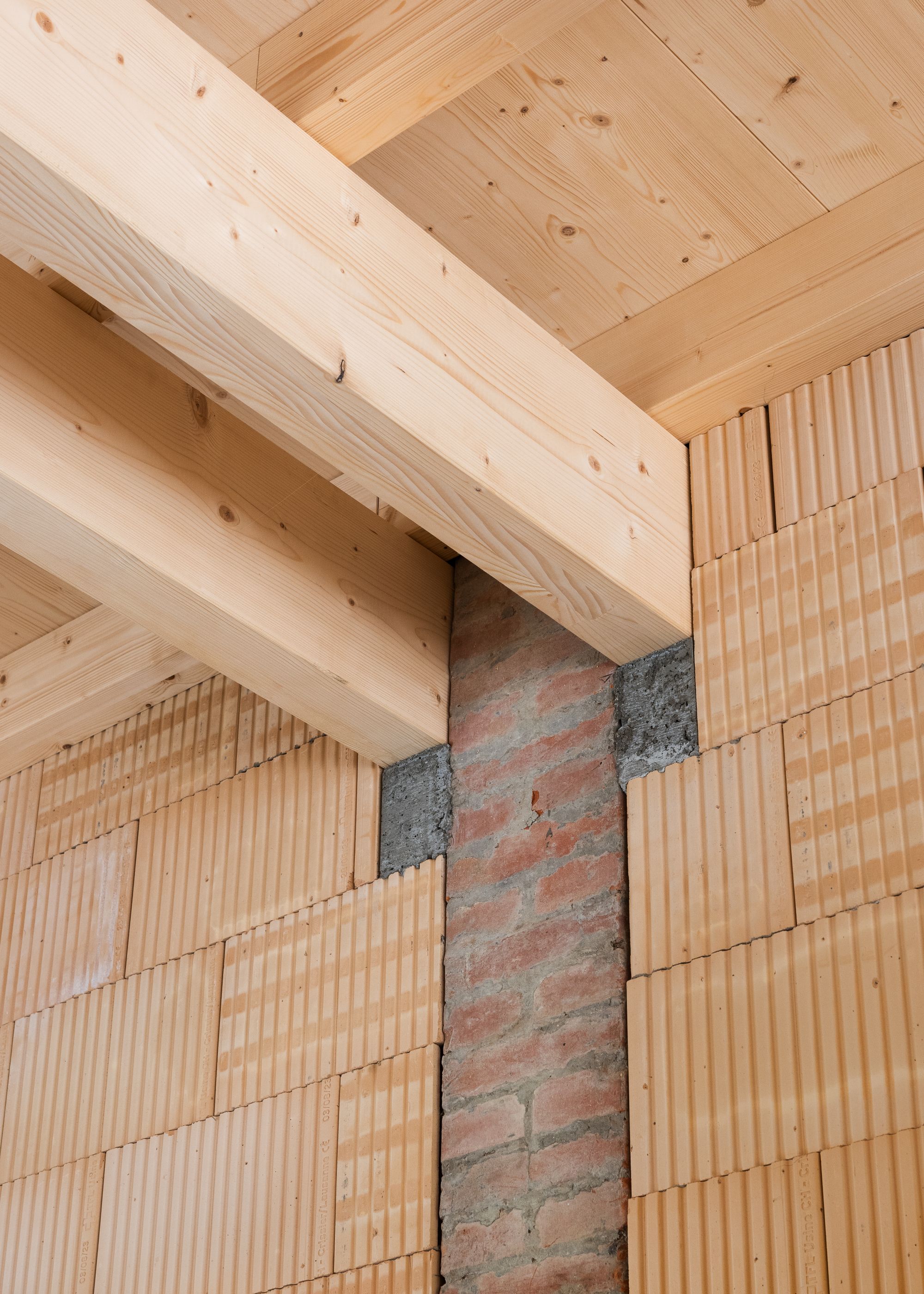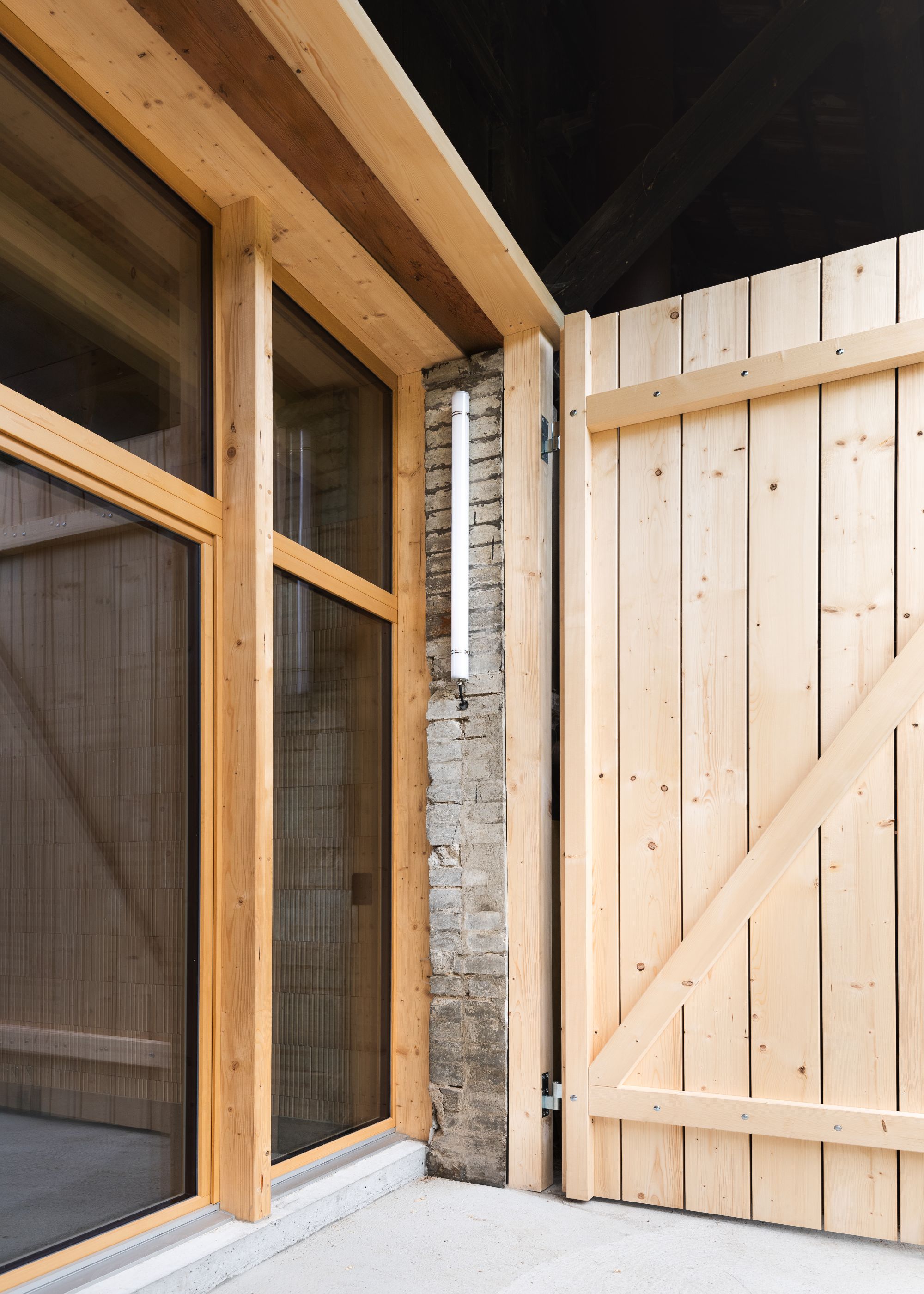 Because nothing was ever demolished, the intervention had to declare itself honestly. The architects rebuilt missing portions of wall in exposed terracotta brick—a direct echo of the 1930s masonry, but cut to a different module so the eye can always read the seam between eras. The tactic nods to Hans Döllgast’s celebrated “critical reconstruction” of Munich’s Alte Pinakothek, keeping the building in what Bard-Yersin call a state of “completeness” while refusing to fake continuity. Material choices elsewhere pursue the same plain-spoken logic. Floors are a hand-trowelled raw screed, tough enough for boots and straw, recalling the stable’s original hard-packed earth. The kitchen is knocked together from rough formwork panels—the kind of improvisation every farm outbuilding knows by heart—yet its tall glazed screens frame the pasture like a gallery window.