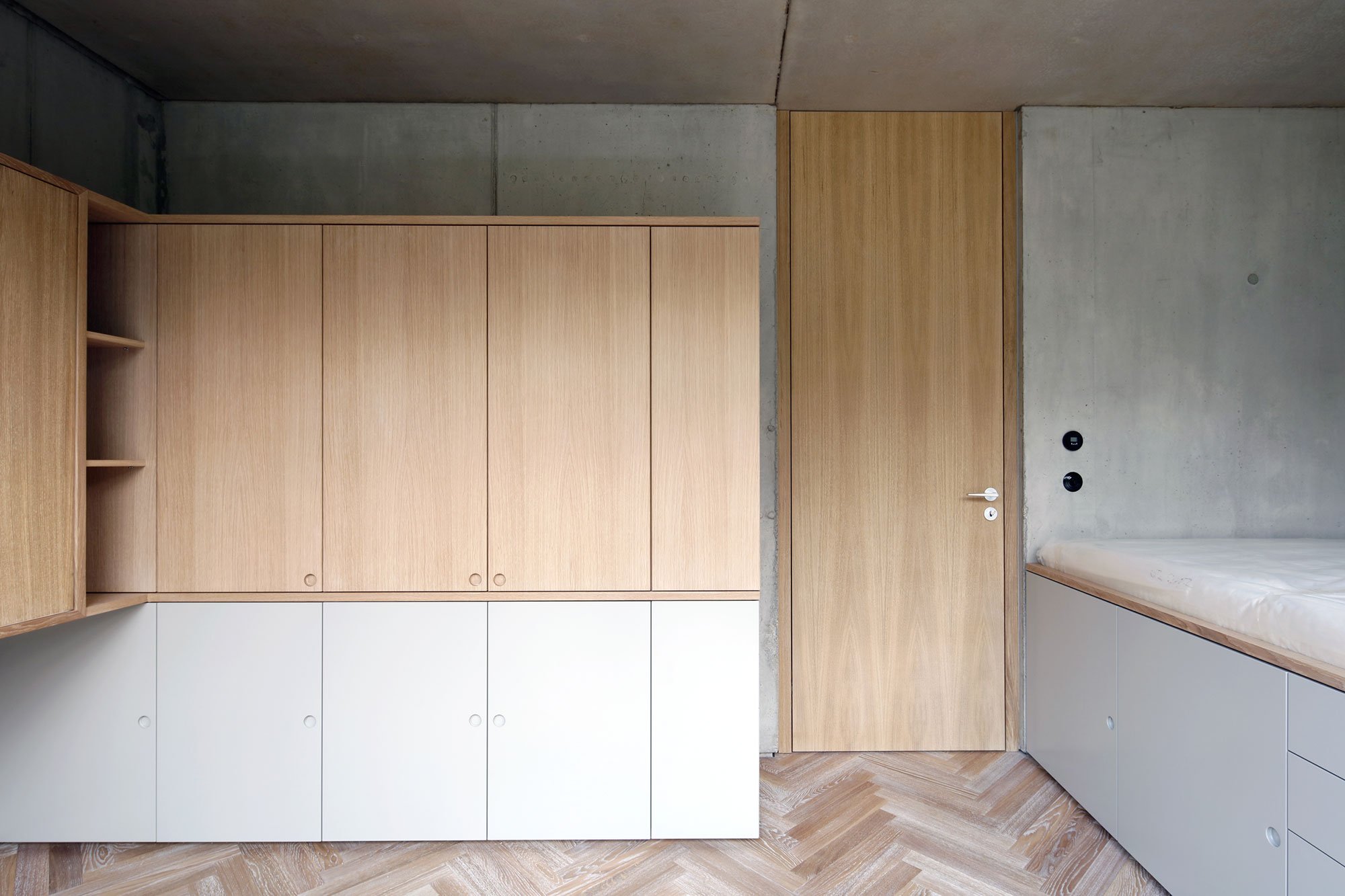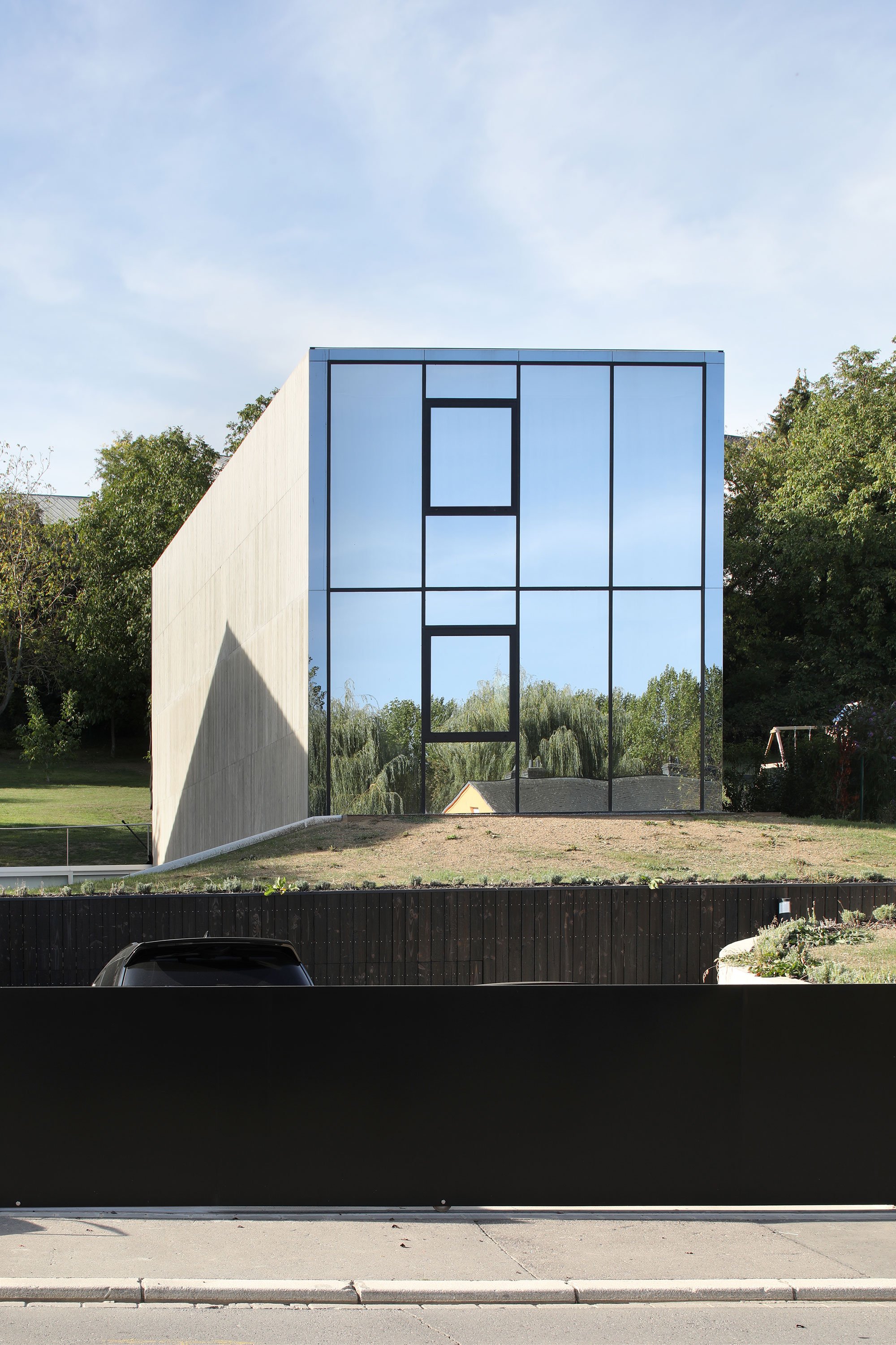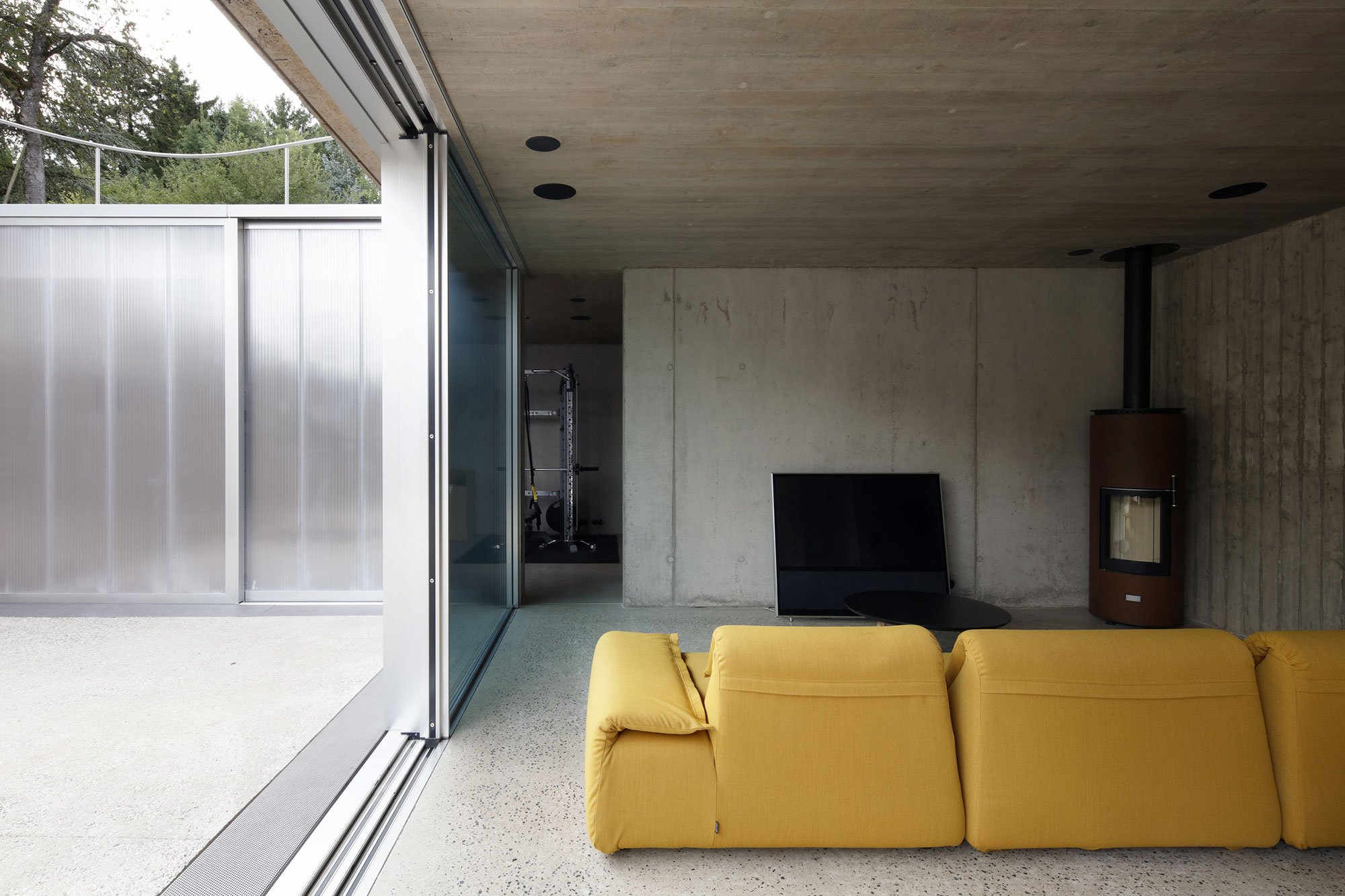 The most striking feature of the exterior, the east and west facades feature reflective solar protective glass. The mirror-like effect makes Hercule House look like an icy monolith rising from the ground. By reflecting its surroundings, the structure also becomes a part of the landscape. Finally, raw surfaces and a minimalist aesthetic aim to enable the inhabitants to easily claim the house as their home.