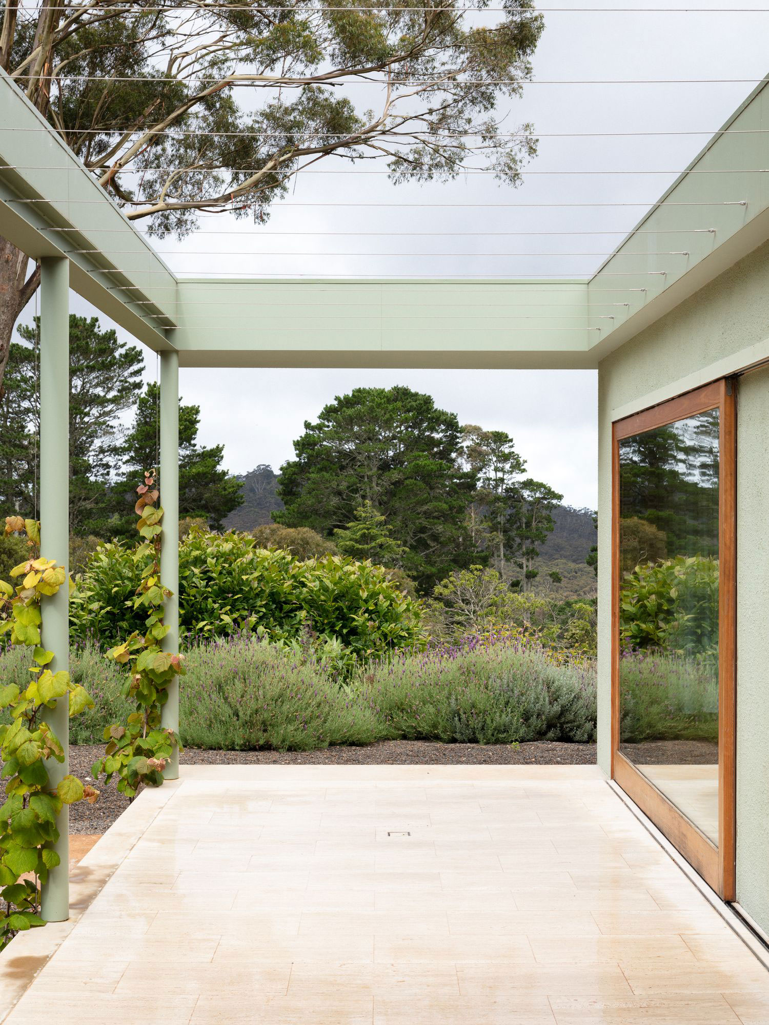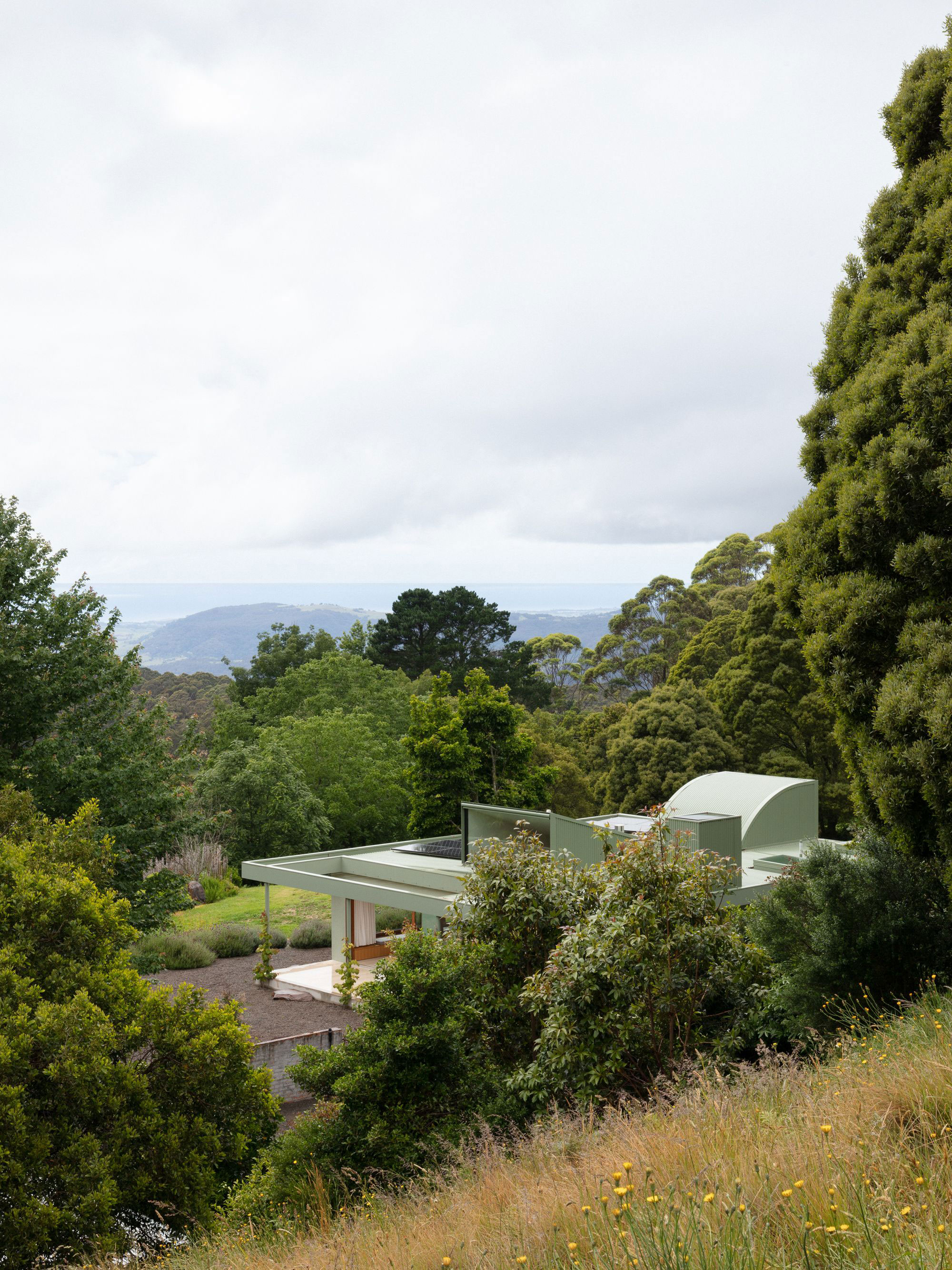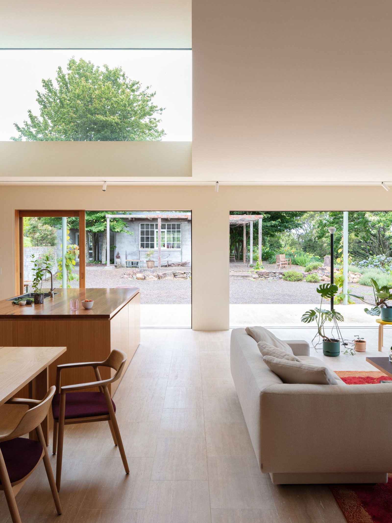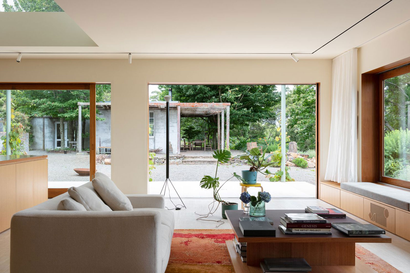 Built right below the crest of a hill, Highlands House opens to a lush garden and to beautiful ocean views. Located in Southern Highlands, New South Wales, Australia, the property originally comprised an artist’s home and separate studio as well as a courtyard. The existing garden had been left unattended, which led to dense vegetation surrounding the now dilapidated cottage and even blocking access to views. Other Architects designed a new weekend home for the client on the footprint of the old cottage, but preserved the studio, courtyard, and garden wall. Apart from preserving all the existing trees, the studio also kept the topography of the site intact. Moving away from the typical modern Australian functionalist design, the architects created a house that references traditional one-room shacks.