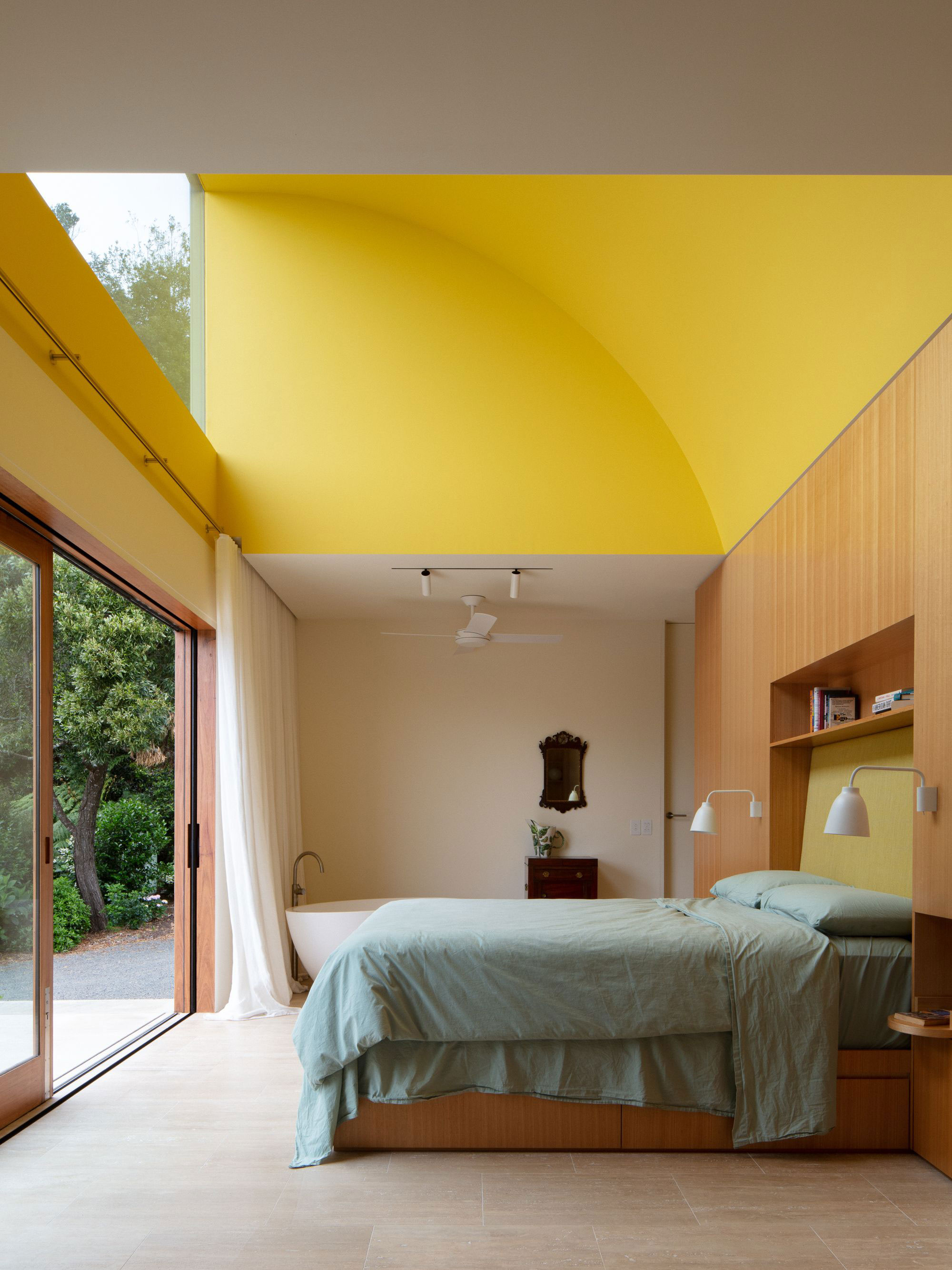 Salvaged from the old cottage, cedar rafters now create an undulating barrier that protects a concrete terrace. The studio used wood to line the walls and flooring, resulting in an especially warm and welcoming interior. In the bedroom, a yellow ceiling and glazing amplify the light of the morning sun and of the night’s sky. Finally, Highlands House is eco-friendly. The architects paired a concrete plinth with prefab insulated timber panels for the walls and roof to create a thermally-efficient envelope. A solar array on the roof covers the house’s energy demands, with water collection and storing systems also included in the design. Photographs © Clinton Weaver.