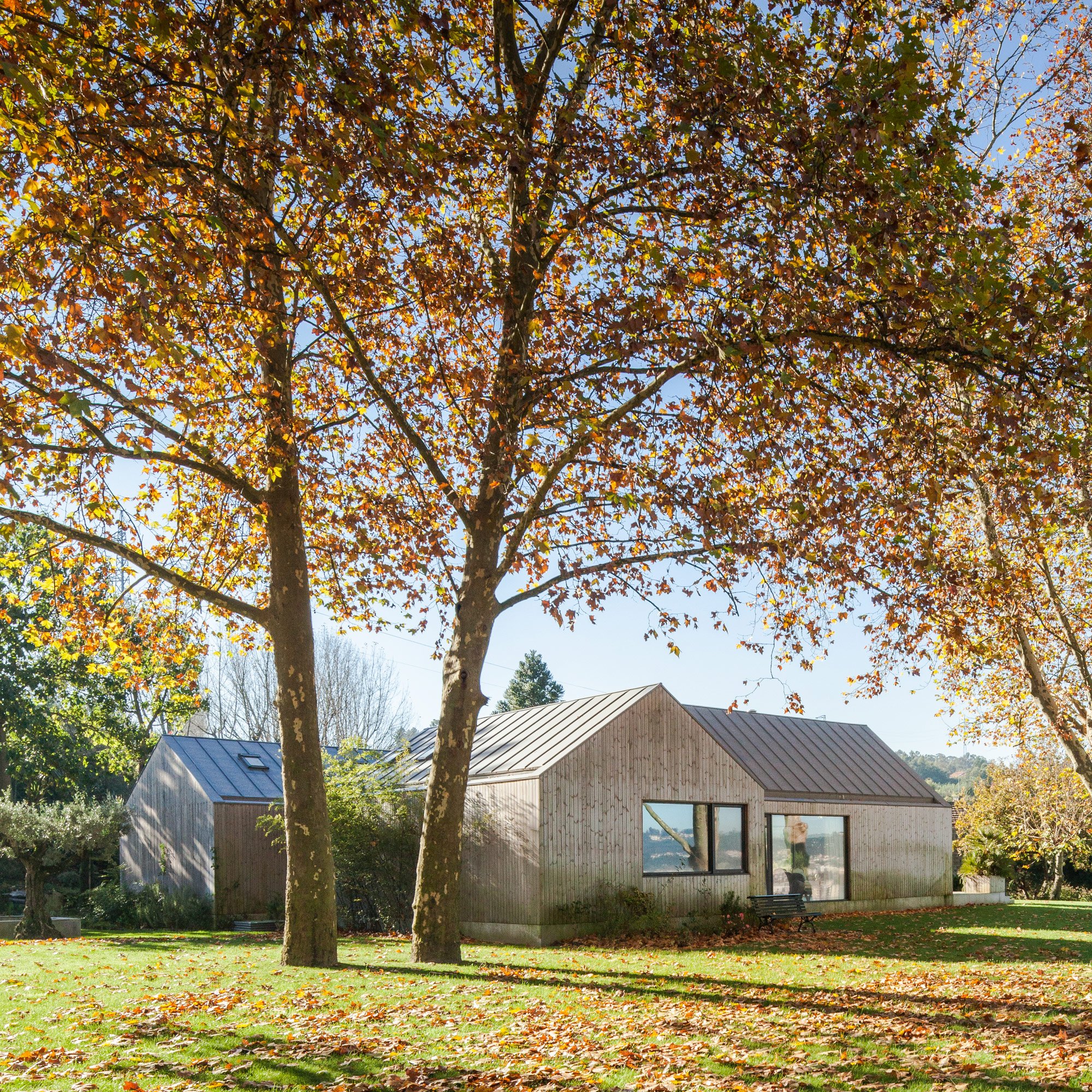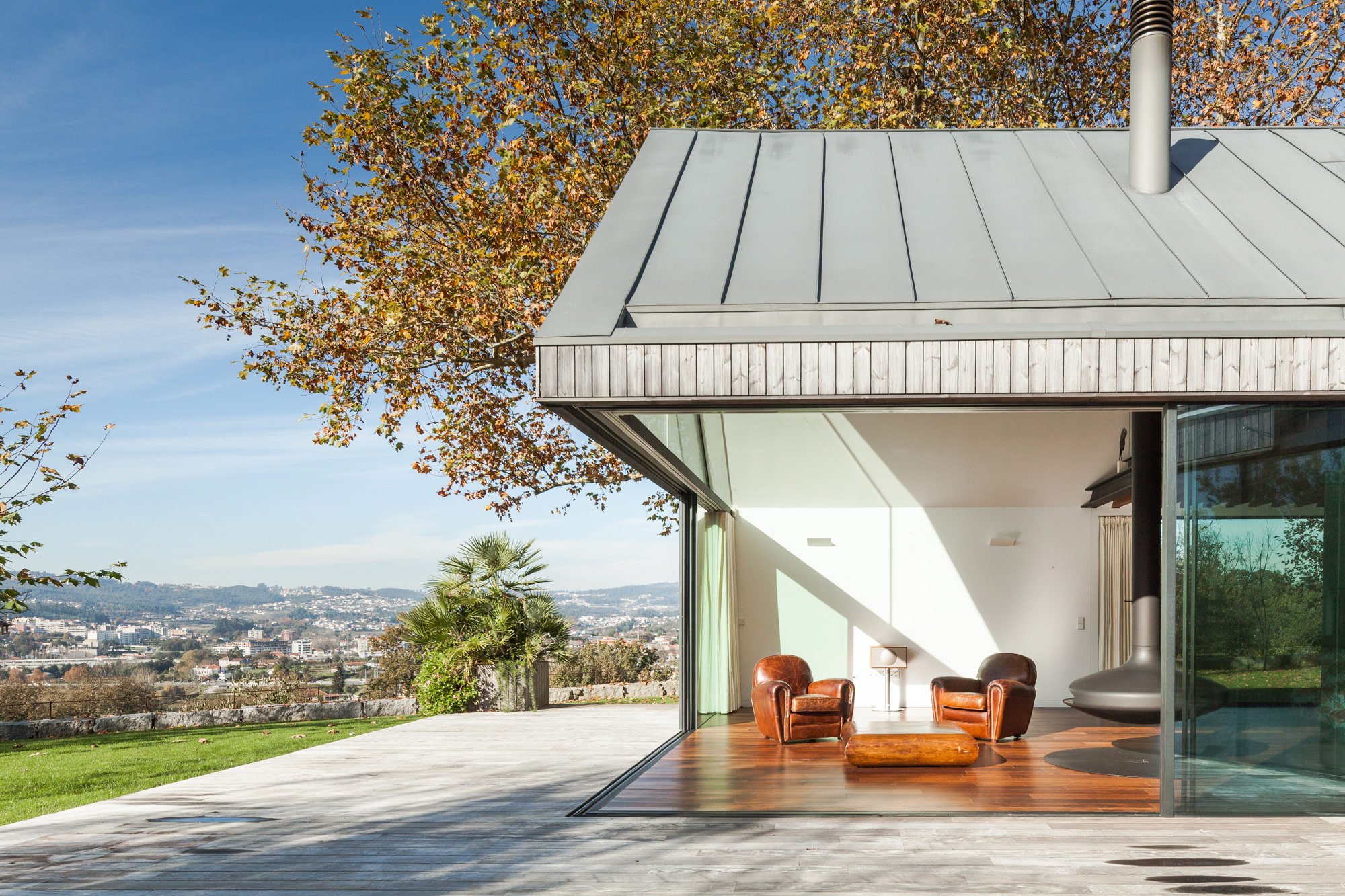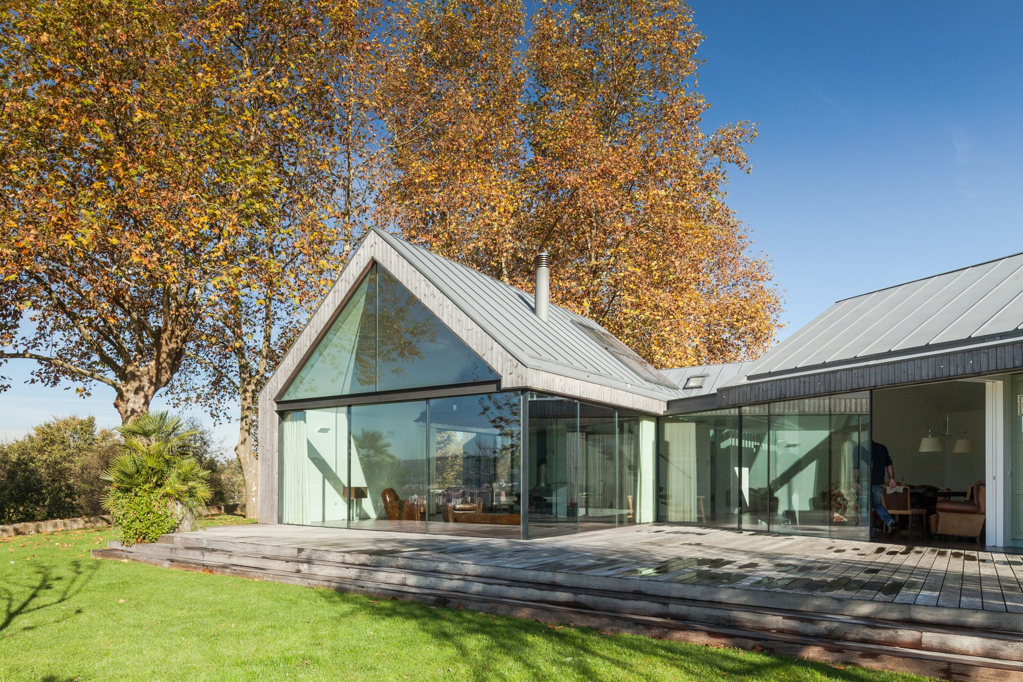 Called House of Four Houses, the property is composed of four distinct volumes. Each is topped with a two-slope zinc roof, and the interstitial space among them is supported with rafters and covered with a flat, transparent shield. The sections are oriented at distinct angles in order to frame views of the surrounding countryside and gently force the residents outdoors, even if only for a moment. In the basement, there is a garage, a wine storage cellar, and a laundry room.