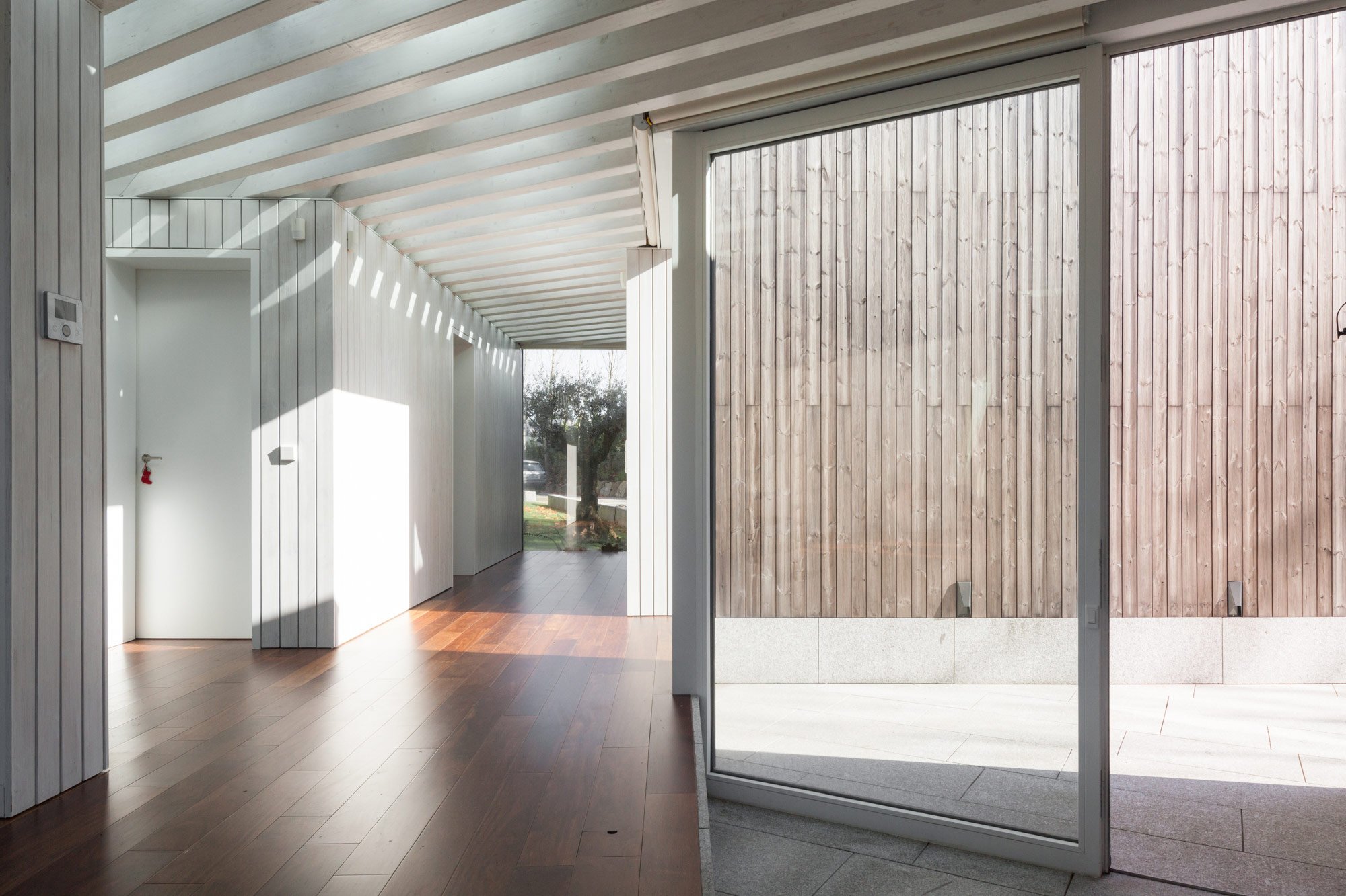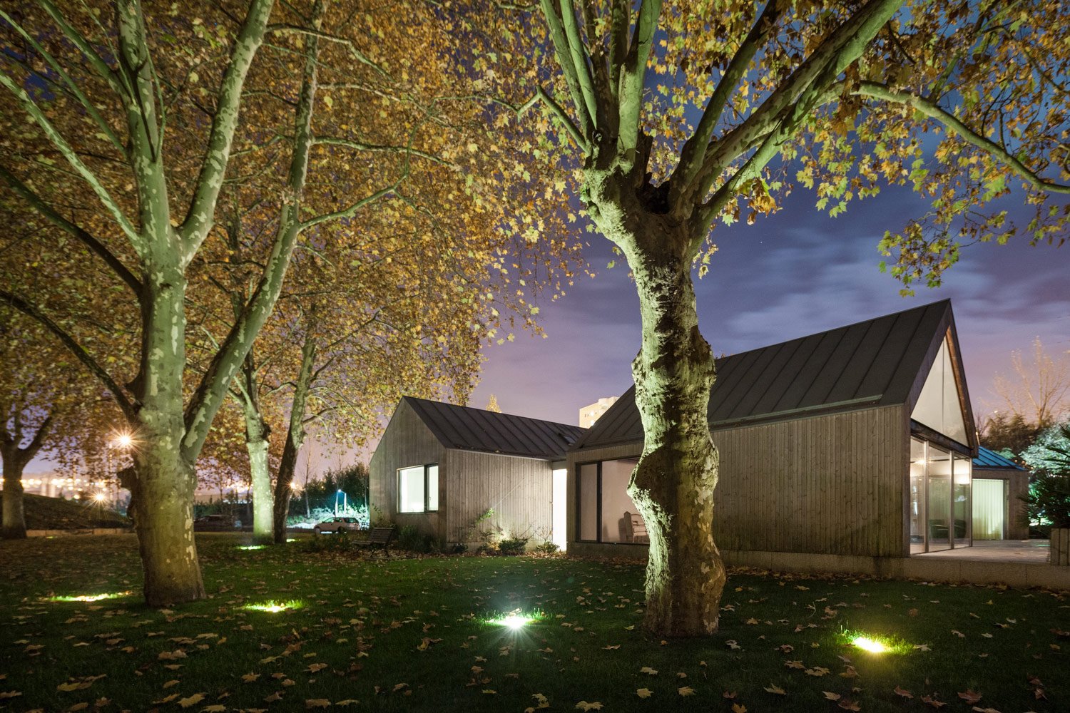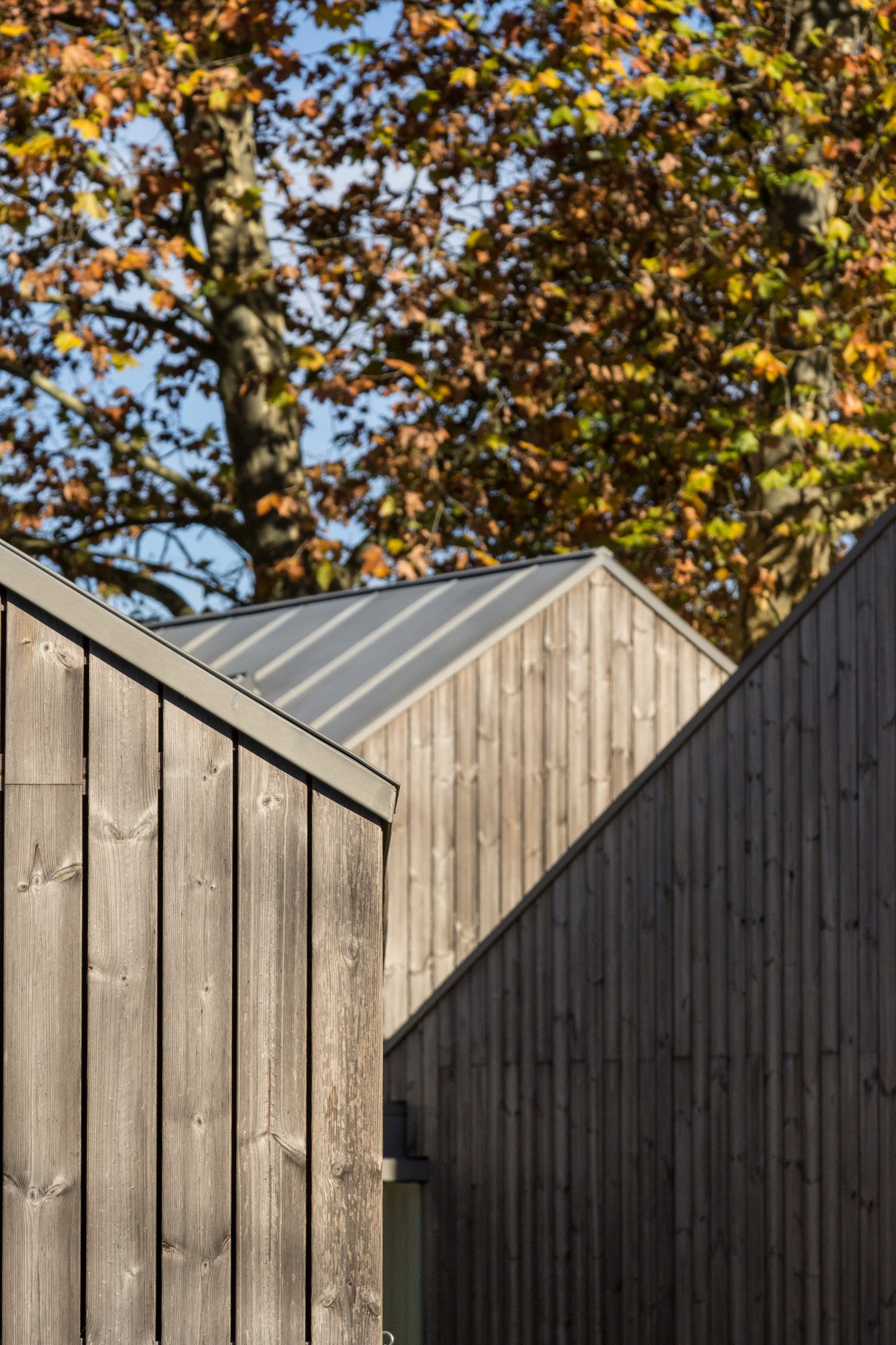 Called House of Four Houses, the property is composed of four distinct volumes. Each is topped with a two-slope zinc roof, and the interstitial space among them is supported with rafters and covered with a flat, transparent shield. The sections are oriented at distinct angles in order to frame views of the surrounding countryside and gently force the residents outdoors, even if only for a moment. In the basement, there is a garage, a wine storage cellar, and a laundry room.