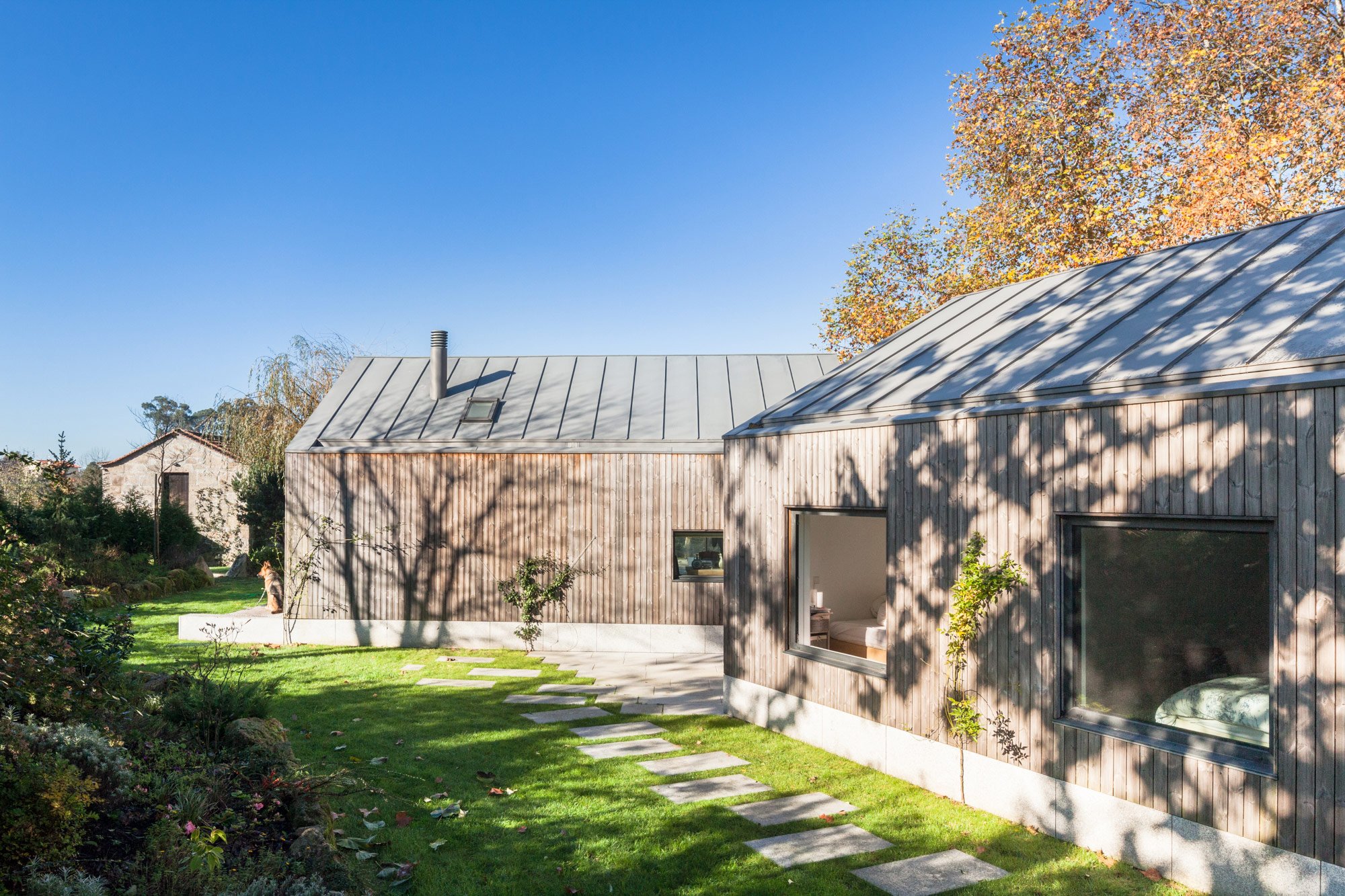 A rural retreat in Penafiel, Portugal, this PROD Arquitectura holiday home is designed for a family of four. The spacious three-level home contains a basement, a ground floor, and a mezzanine office, each styled with local granite and patinated pine board.