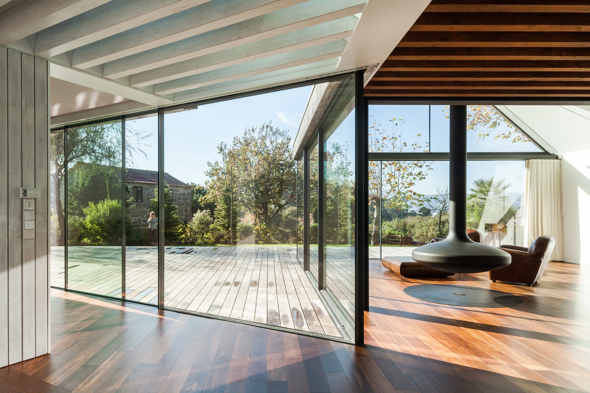 In the living room, sliding glass doors can be pulled away to create an open air lounge, complete with a wood-lined patio, leather chairs, and a suspended fireplace.