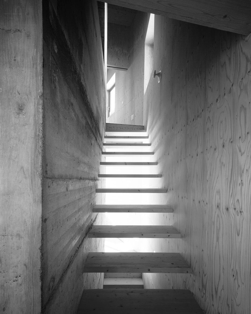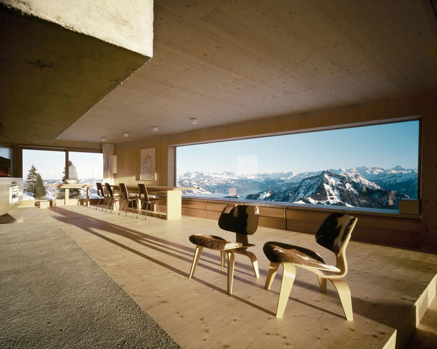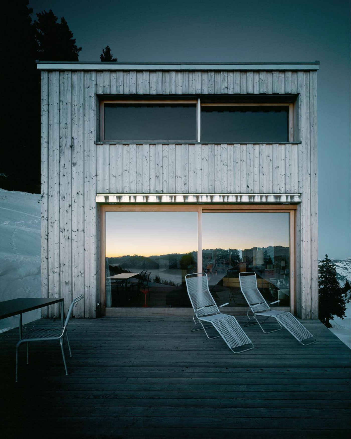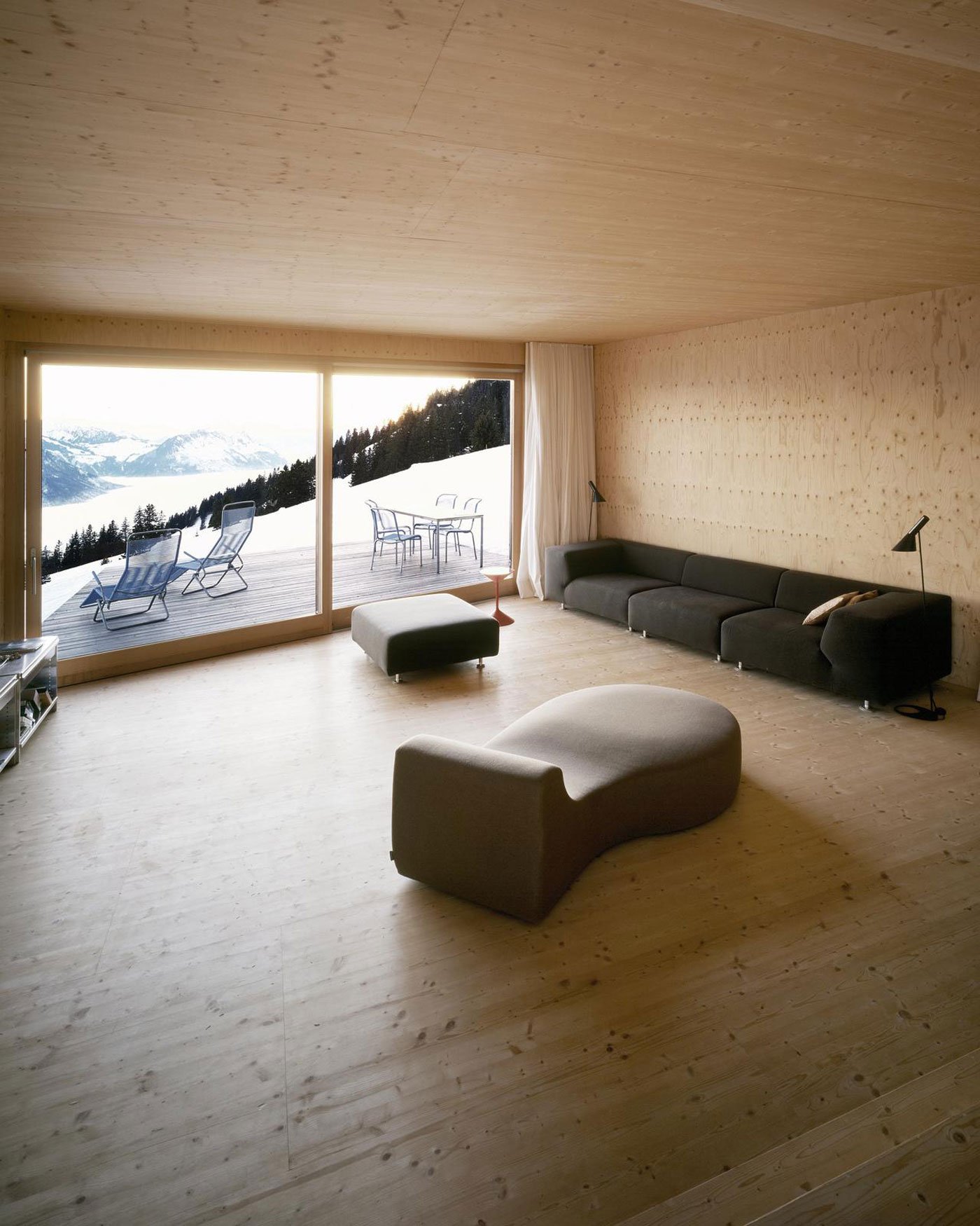 This holiday house, designed by AFGH Architects, appears to float on the side of the mountain allowing it a gorgeous view of the surrounding countryside. Every room in the house has at least one window to take in the scenery; the most notable of which being the large picture windows in the main living space which frame the landscape while adding to the modern feel of the home. Much of the inspiration for the home came from the concept of a ship, which brings us the wooden deck off the side of the house —which also serves to frame the entrance— and the chimney which rises like a mast through the house.
