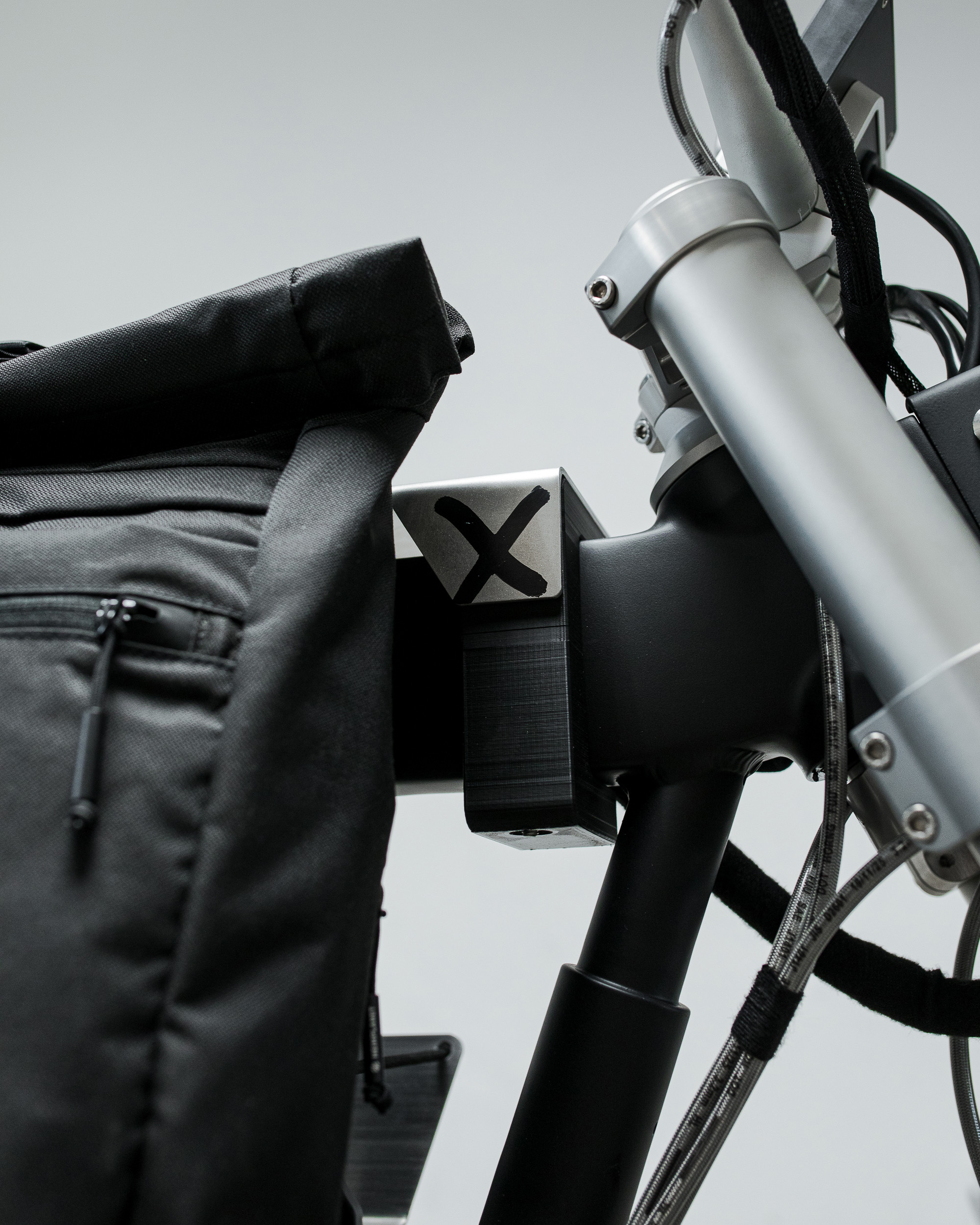 ANT features an optimized frame with improved ergonomics. Apart from the changeable footrest position, the custom bike also features a slightly lower seat compared to the stock model. The customizable frame allows users to express their own creativity and create a one-of-a-kind ANT electric bike. Custom 3D printed clamps attach directly onto the bike’s frame and create several luggage mounting points. As a result, you can easily attach a backpack, bags of groceries, or even a tent and ride comfortably. The team collaborated with Heimplanet to design a range of backpacks that attach with only one hook to the frame. At the front, a removable basket on top of the battery pack offers even more space for smaller bags or a jacket.