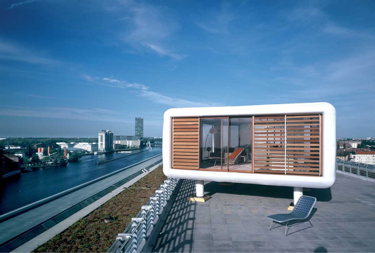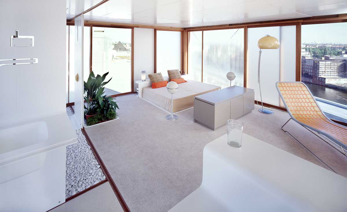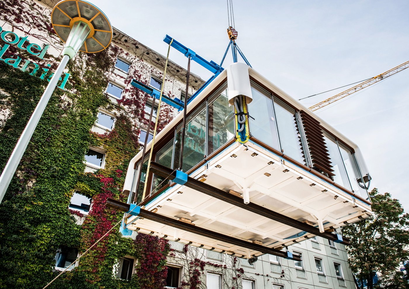 One of many Loftcubes by Studio Aisslinger, this design can be found on the rooftop of Hotel Daniel, a mid-century building in Graz, Austria. A complement to the neon balconies below, the contemporary suite is housed in glass, dark wooden slats, and a white rounded-edged frame. The design allows for privacy while opening up panoramic views of the city. Inside, the structure measures just 44 square meters, shy of 145 square feet, yet the open plan fits a bedroom, lounge, and bathroom into the space without making the interior feel cramped. Altogether a calming retreat Hotel Daniel’s Loftcube is a luxurious urban escape.