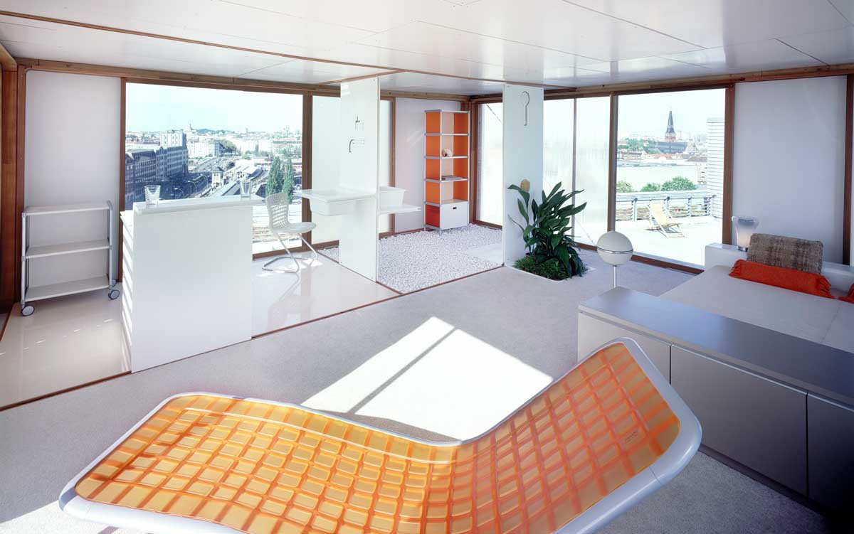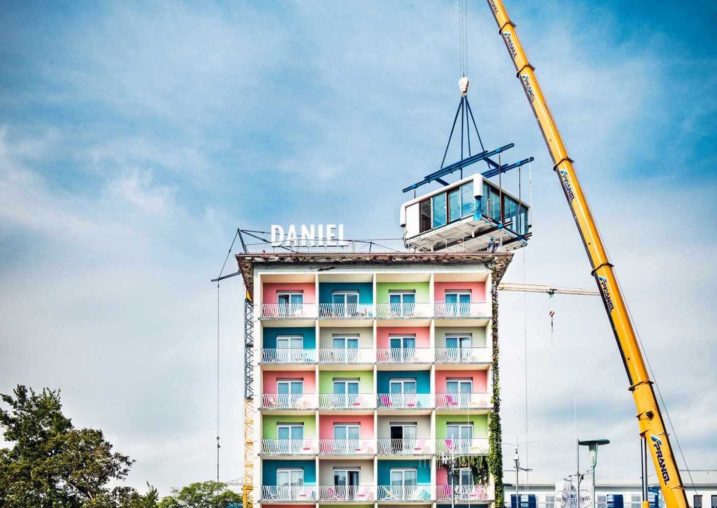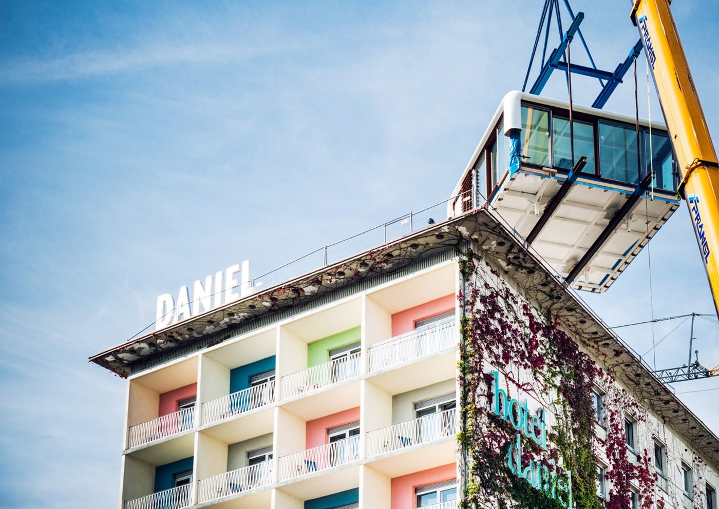One of many Loftcubes by Studio Aisslinger, this design can be found on the rooftop of Hotel Daniel, a mid-century building in Graz, Austria. A complement to the neon balconies below, the contemporary suite is housed in glass, dark wooden slats, and a white rounded-edged frame. The design allows for privacy while opening up panoramic views of the city. Inside, the structure measures just 44 square meters, shy of 145 square feet, yet the open plan fits a bedroom, lounge, and bathroom into the space without making the interior feel cramped. Altogether a calming retreat Hotel Daniel’s Loftcube is a luxurious urban escape.