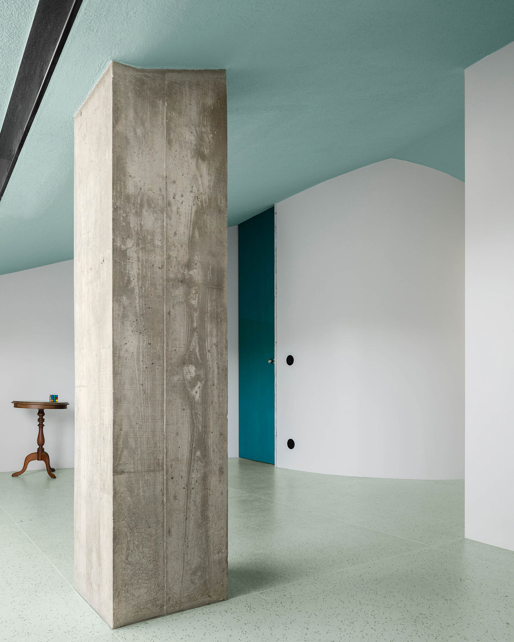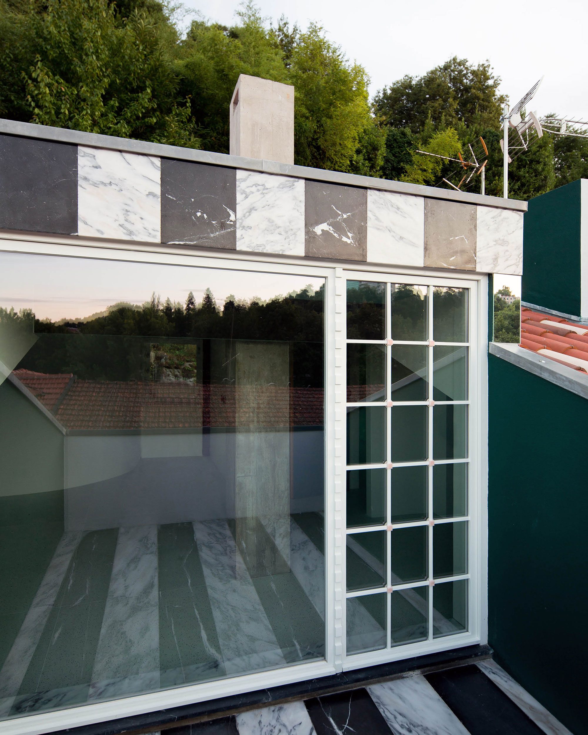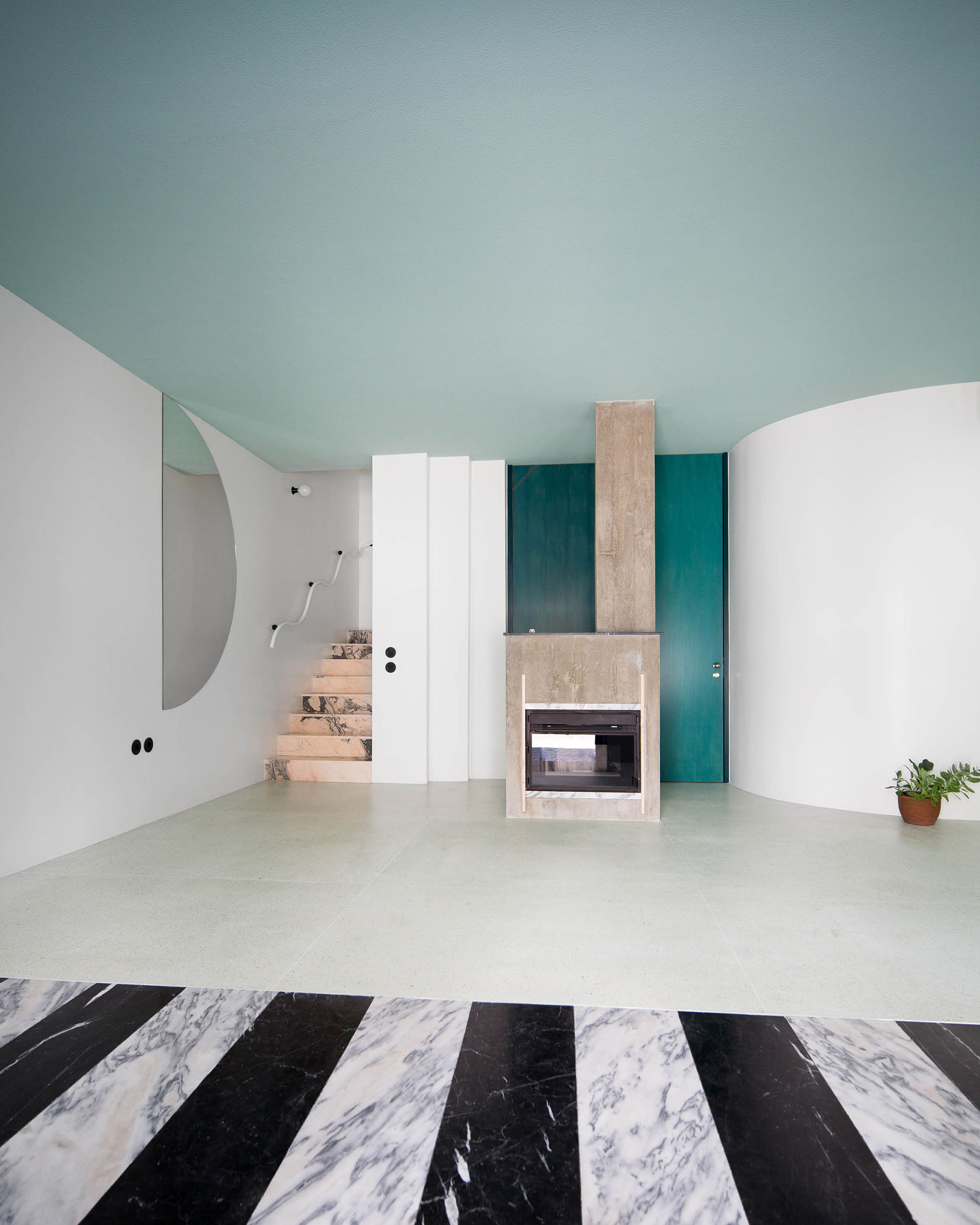 The interiors are just as imaginative and boast the same playful approach to design. The studio added a new concrete chimney that pierces all levels. While it serves as a fireplace on the ground floor, the concrete element organizes spaces on the upper levels. Different rooms revolve around this central concrete column, which also contrasts the material palette of granite, marble, and wood. A staircase parallels the vertical itinerary of the chimney, but on a more sculptural, winding path. The studio finished the staircase in a bright pink color that looks even more striking alongside the mint green floors and ceilings. Finally, the firm’s signature striped pattern marks the entrance and the top of the building, or the beginning and end of the journey of walking through the house. Photography © Ivo Tavares Studio.