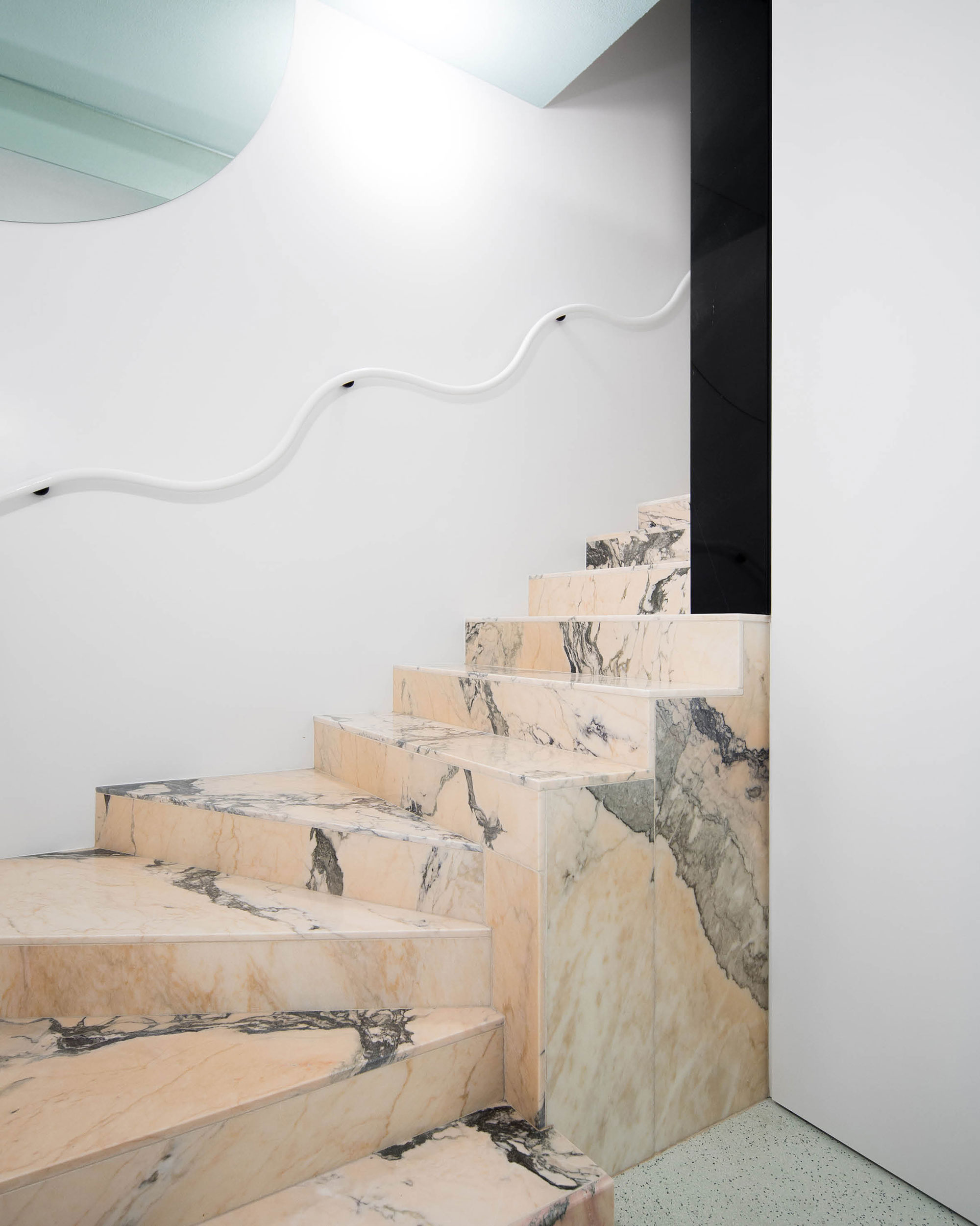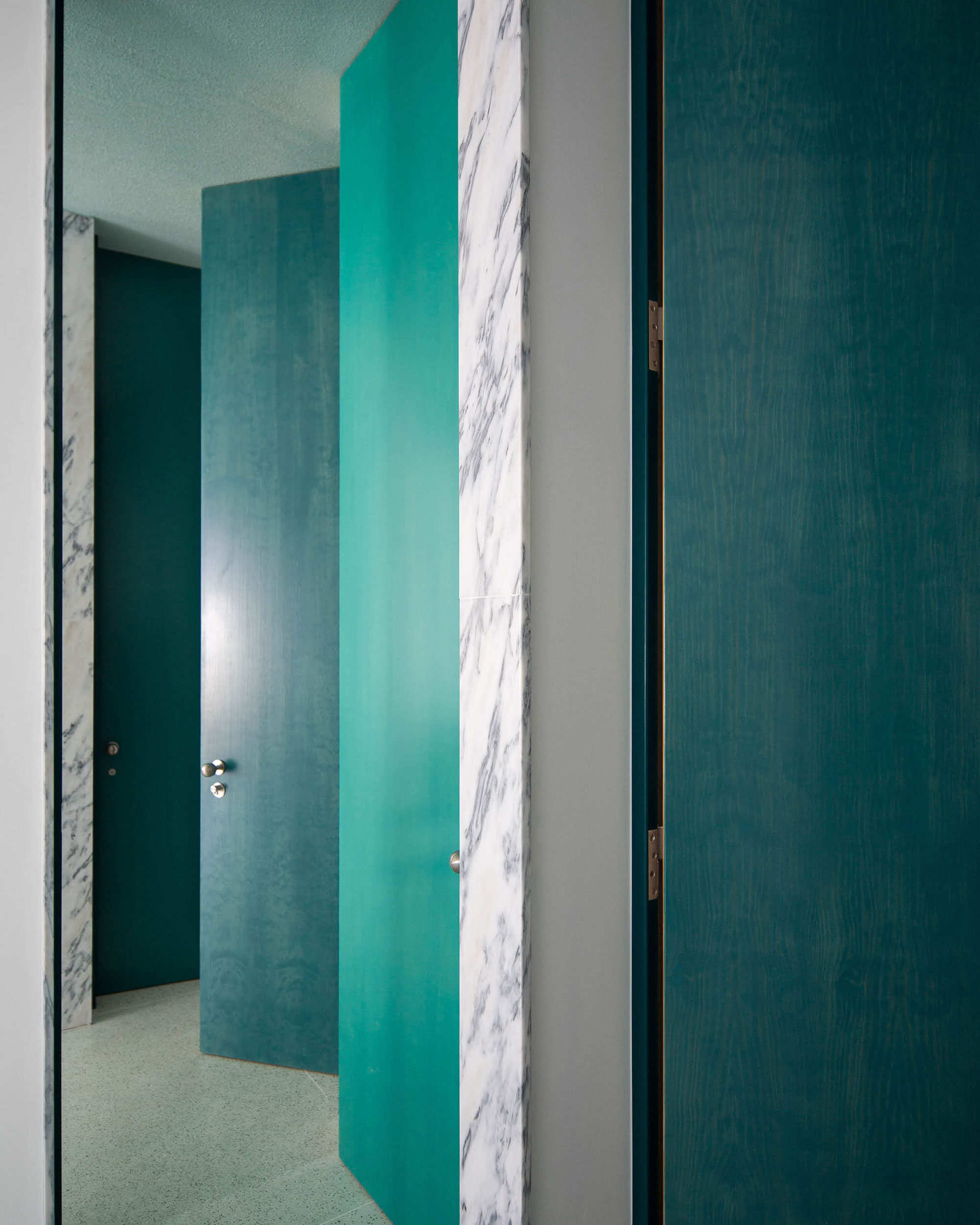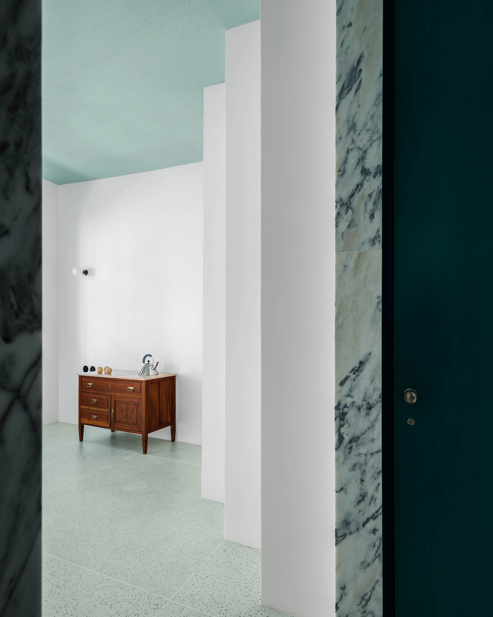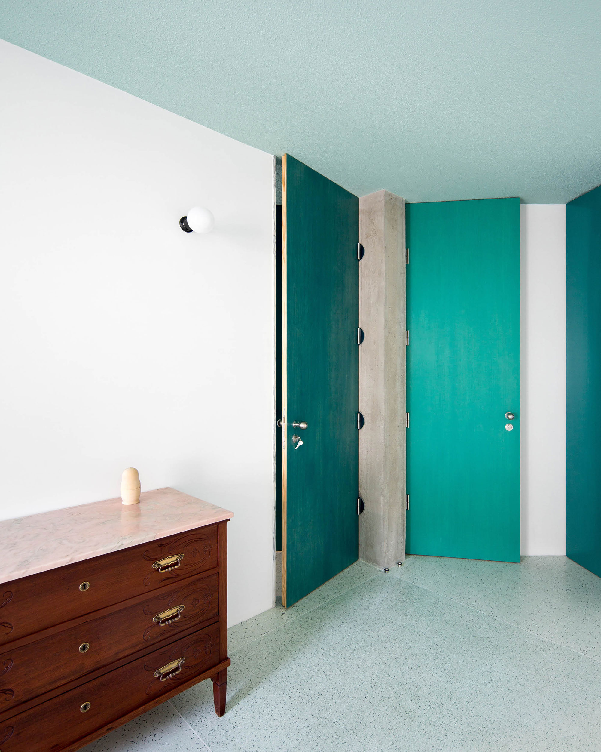 The interiors are just as imaginative and boast the same playful approach to design. The studio added a new concrete chimney that pierces all levels. While it serves as a fireplace on the ground floor, the concrete element organizes spaces on the upper levels. Different rooms revolve around this central concrete column, which also contrasts the material palette of granite, marble, and wood. A staircase parallels the vertical itinerary of the chimney, but on a more sculptural, winding path. The studio finished the staircase in a bright pink color that looks even more striking alongside the mint green floors and ceilings. Finally, the firm’s signature striped pattern marks the entrance and the top of the building, or the beginning and end of the journey of walking through the house. Photography © Ivo Tavares Studio.