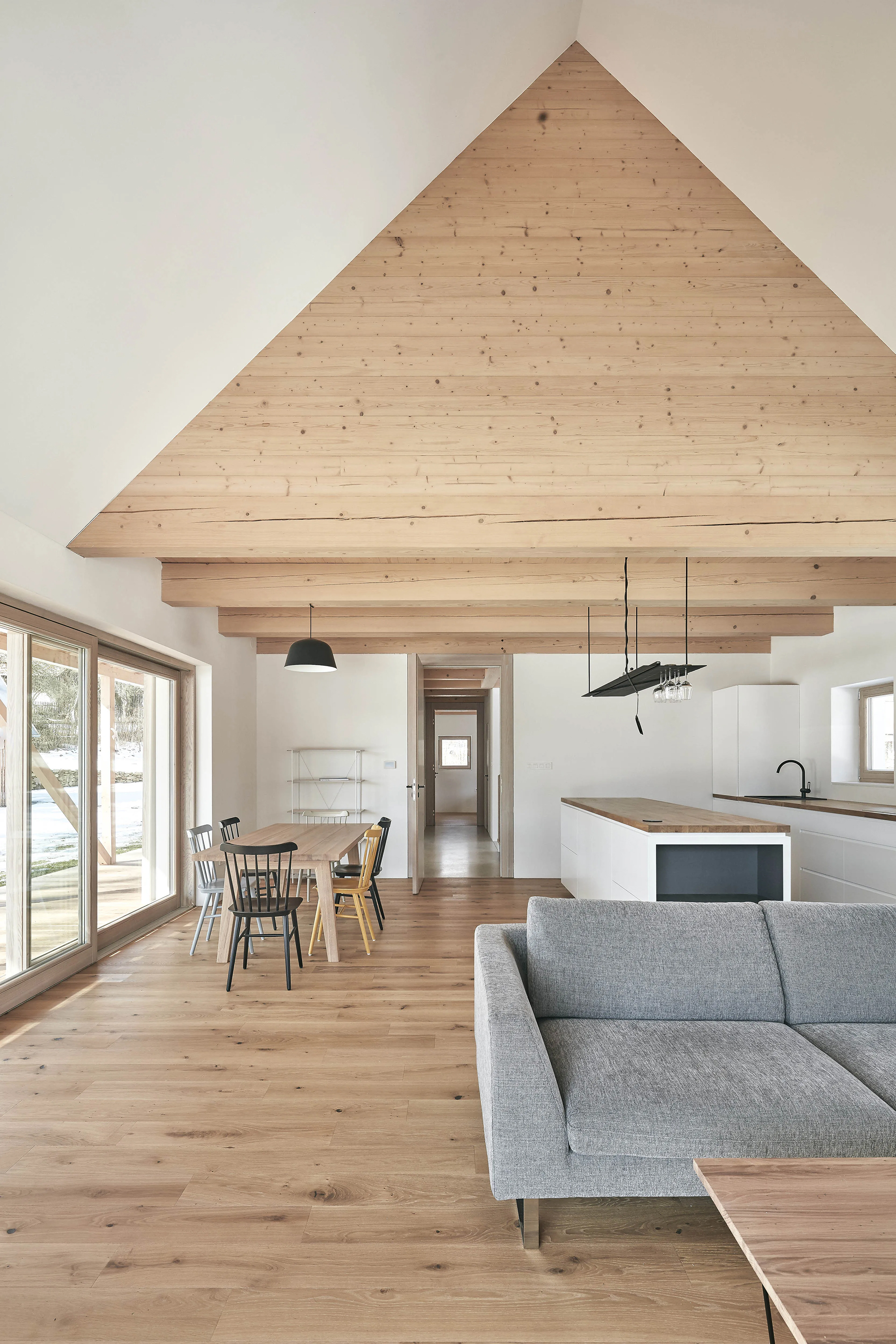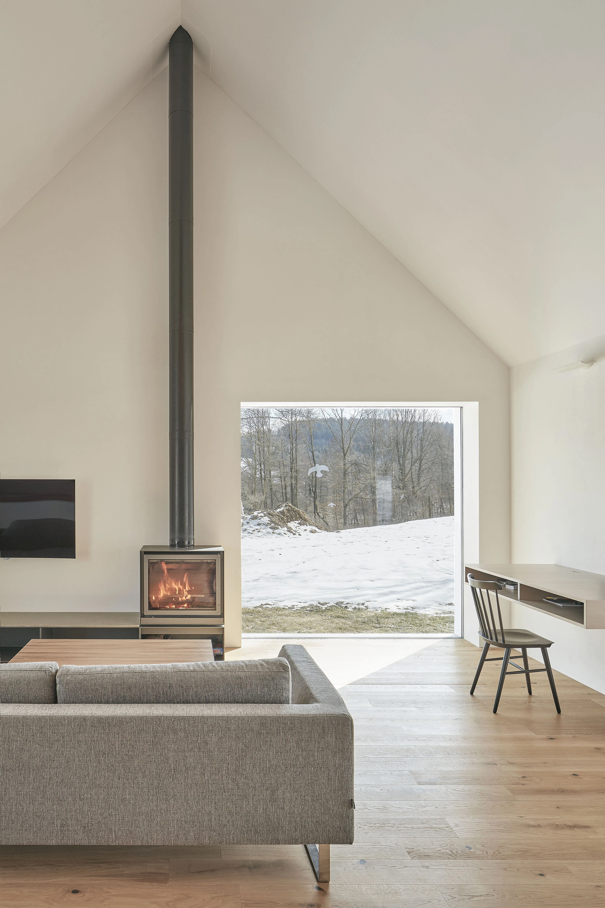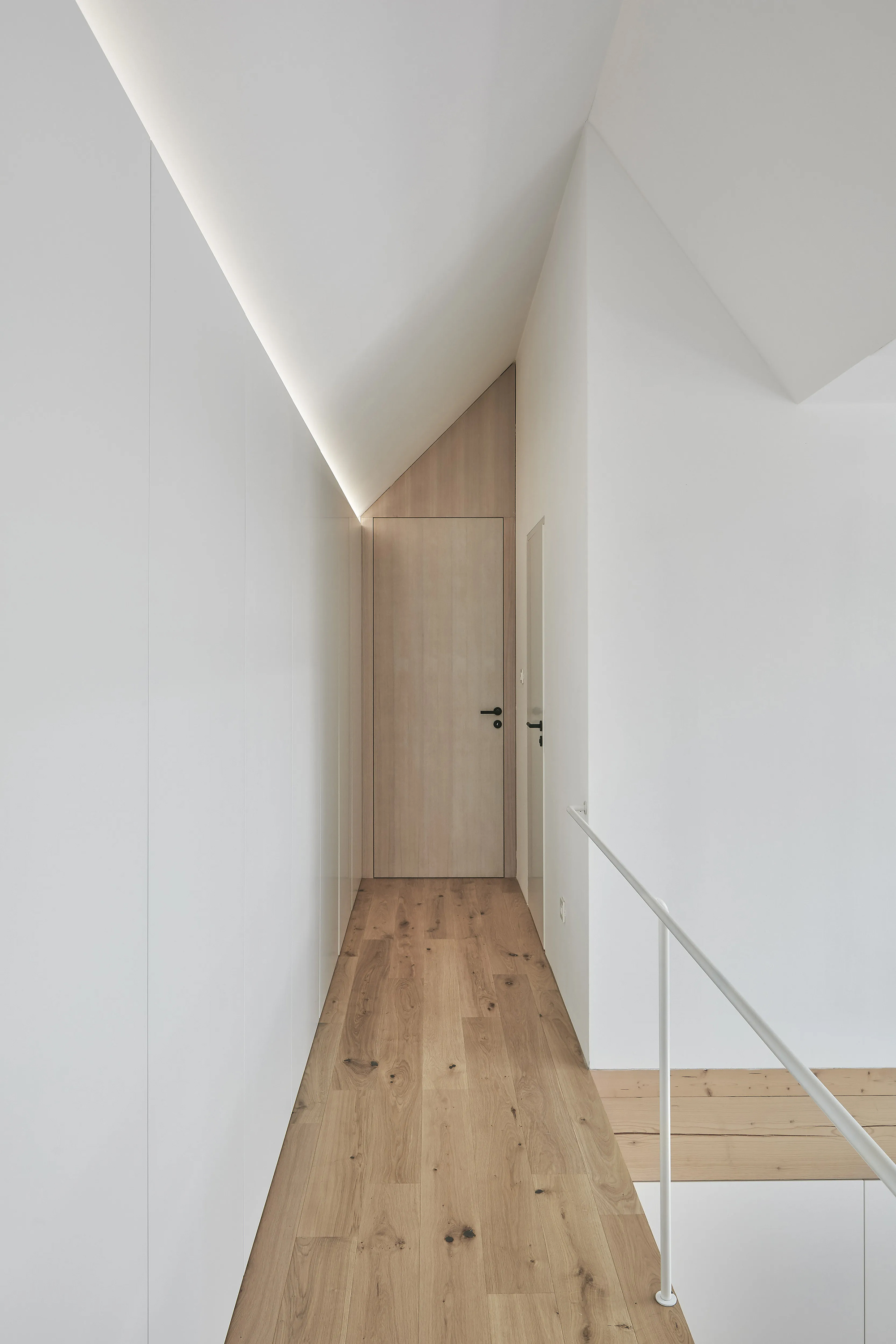 In the lounge area, a fireplace creates a cozy atmosphere. Here, there’s also a small office with a desk and chair, as the owner works from home. The ground floor also contains the master bedroom. A central staircase links the ground level with the gallery in the attic. This floor houses two bedrooms and a bathroom. Minimalist and elegant, the interiors were designed by a relative of the client. The living spaces feature white walls, larch and oak wood surfaces, timber furniture, and simple pendant lighting. Intentionally serene, the interiors thus allow the beauty of nature to become the focus throughout the house. To complete the project, the studio collaborated with a local bricklayer, who built the house and also designed the brick vaulted cellar in the basement. Photography © Peter Fabo.